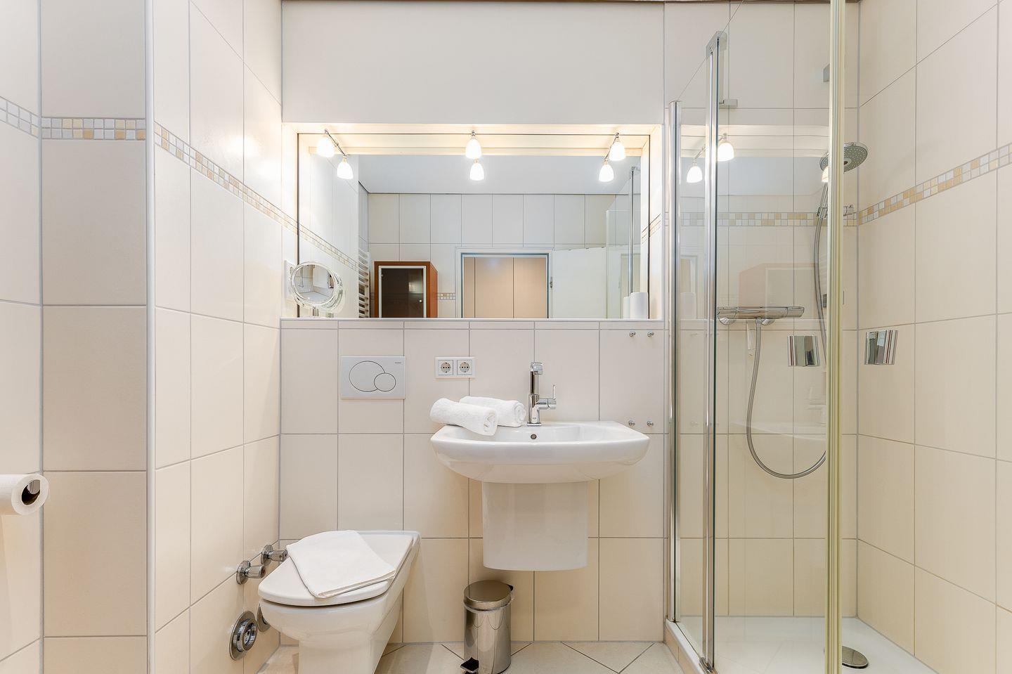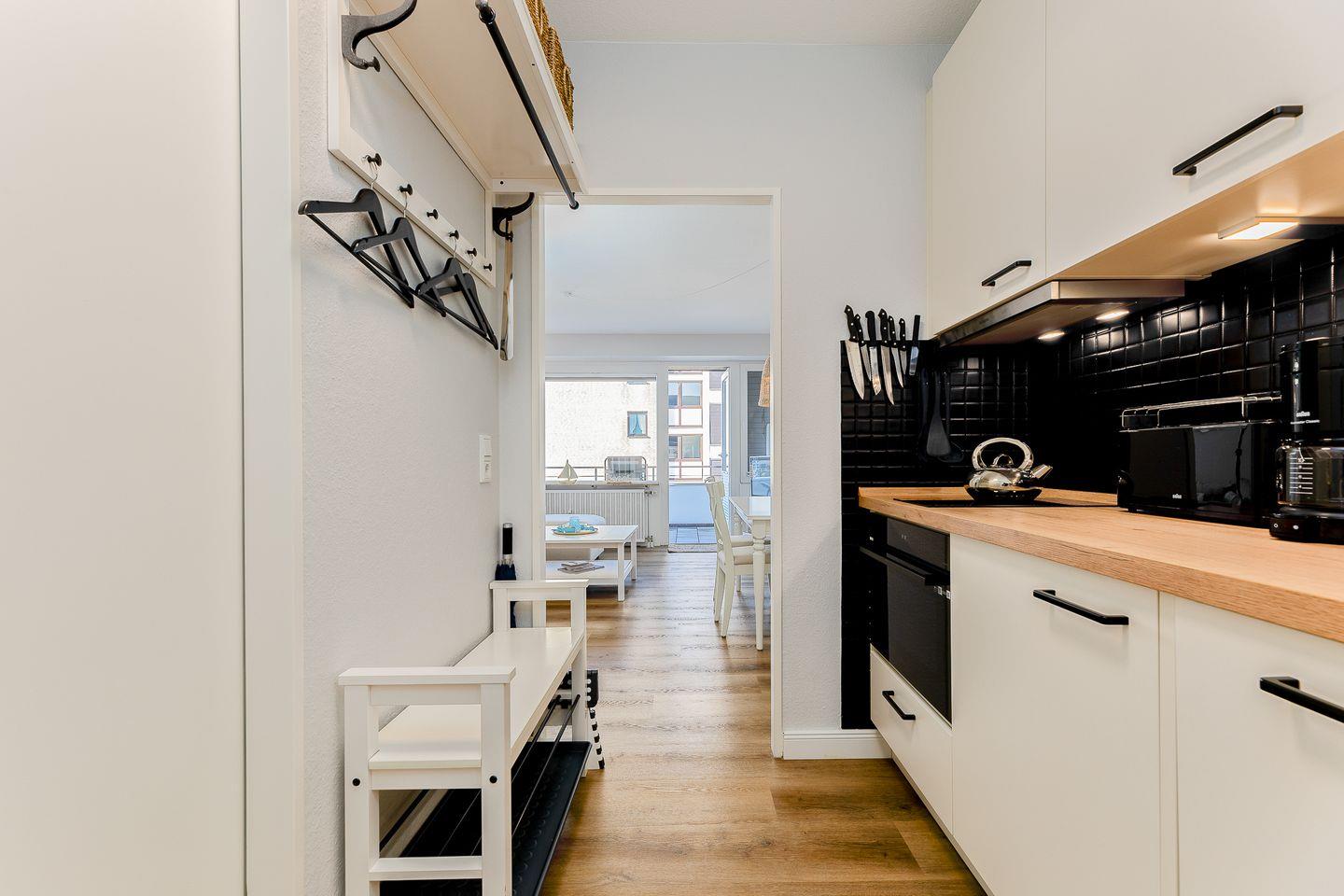 Schön, wenn sich alles so gut zusammenfügt. Im Fall des Appartements Jonathan ist es der großzügige und offene Wohnbereich in dem sich eine chillige Couch, ein Esstisch sowie die Küche versammelt haben. Letztere fällt nicht nur durch ihre gute Ausstattung sondern auch durch die coolen schwarzen Fliesen auf, die perfekt mit der Arbeitsplatte aus Holz und den weißen Schränken harmonieren. Nicht zu vergessen, der Westbalkon nebst Tisch und Stühlen und toller Aussicht sowie das geräumige Duschbad.