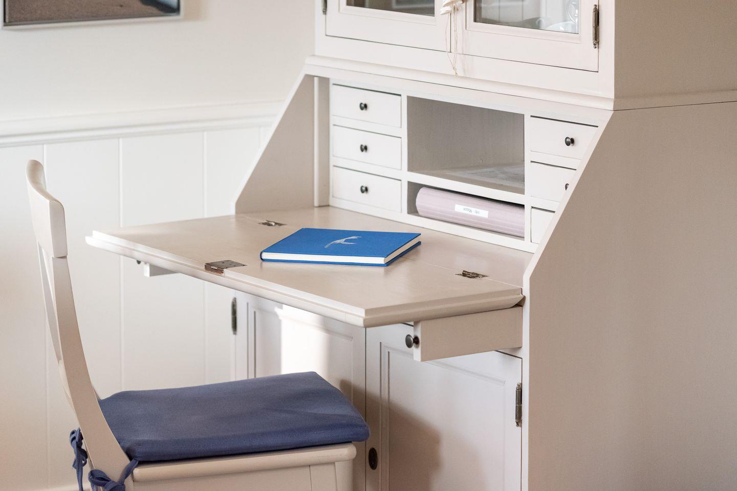 Wohn-/Essbereich: Der helle Wohnbereich überzeugt durch gemütliche Polstermöbel, Rattansessel, TV, elektrischen Kamin sowie einen kleinen Sekretär, der auch mobiles Arbeiten im Urlaub ermöglicht. Im Wohnbereich befindet sich ein großzügiger Esstisch mit Platz für 4 Personen.