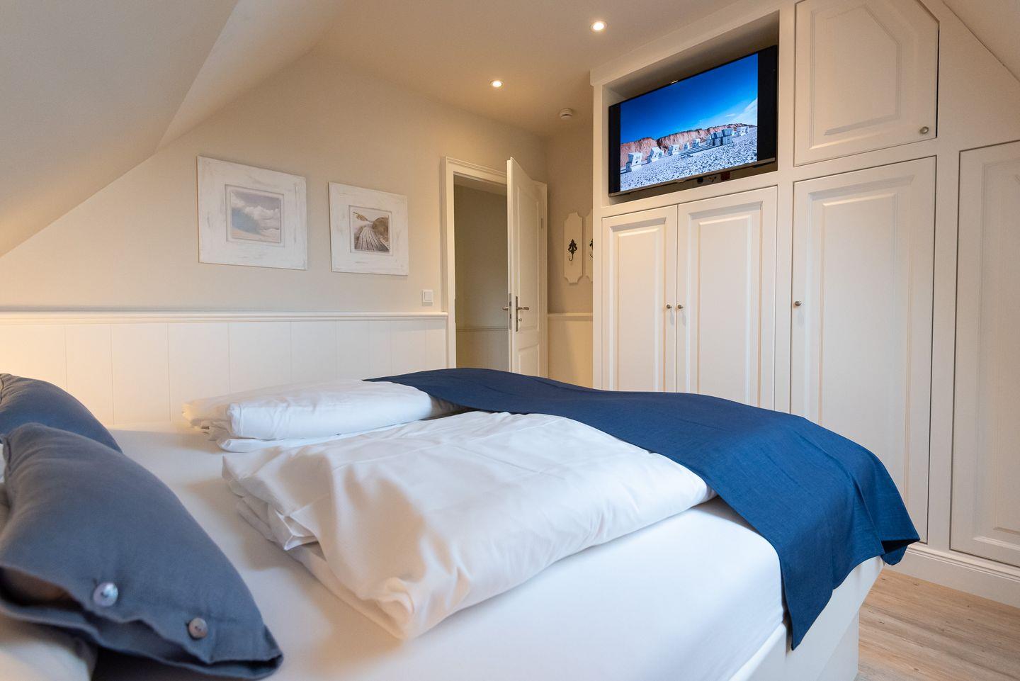 Schlafzimmer 1: Gemütliches Doppeltbett, Einbauschränke und TV.