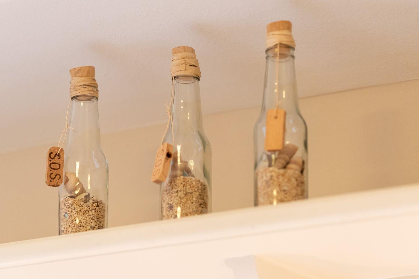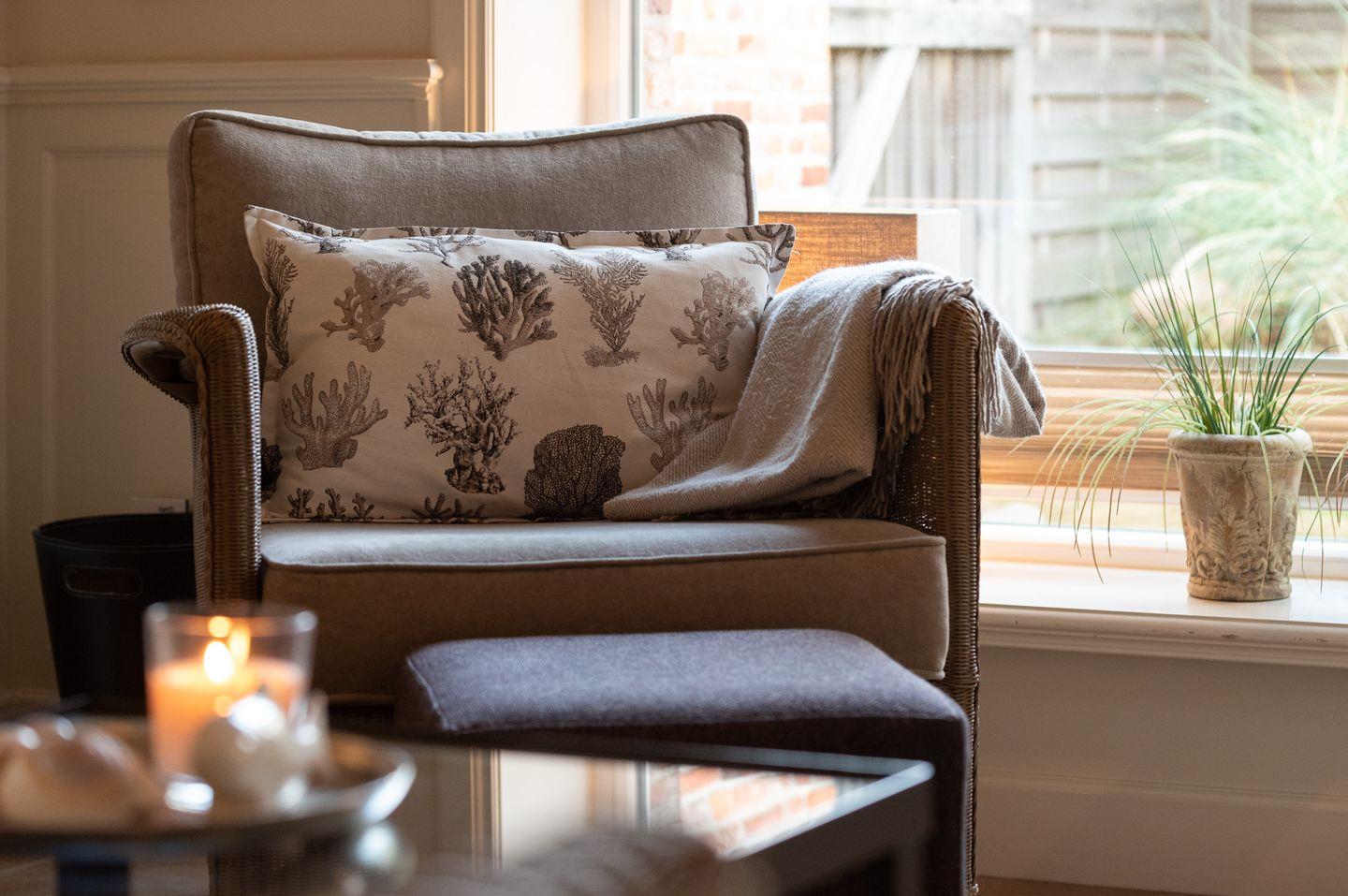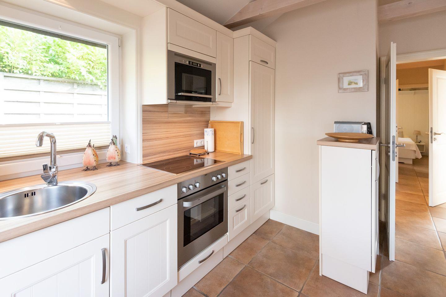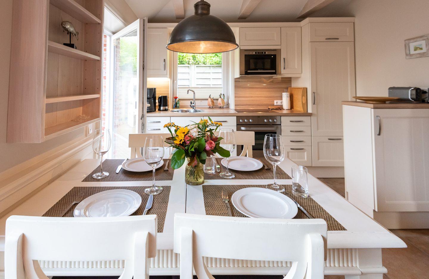 Koch-/Ess-/Wohnbereich: Offene und gut ausgestattete Küche im Landhaushaustil, welche durch den schönen Essbereich für 4 Personen vom gemütlichen Wohnbereich mit Sofa, Sessel und TV abgegrenzt wird. Von hier gelangen Sie auf Ihre eigene Nordterrasse mit Gartenmöbeln und Strandkorb.