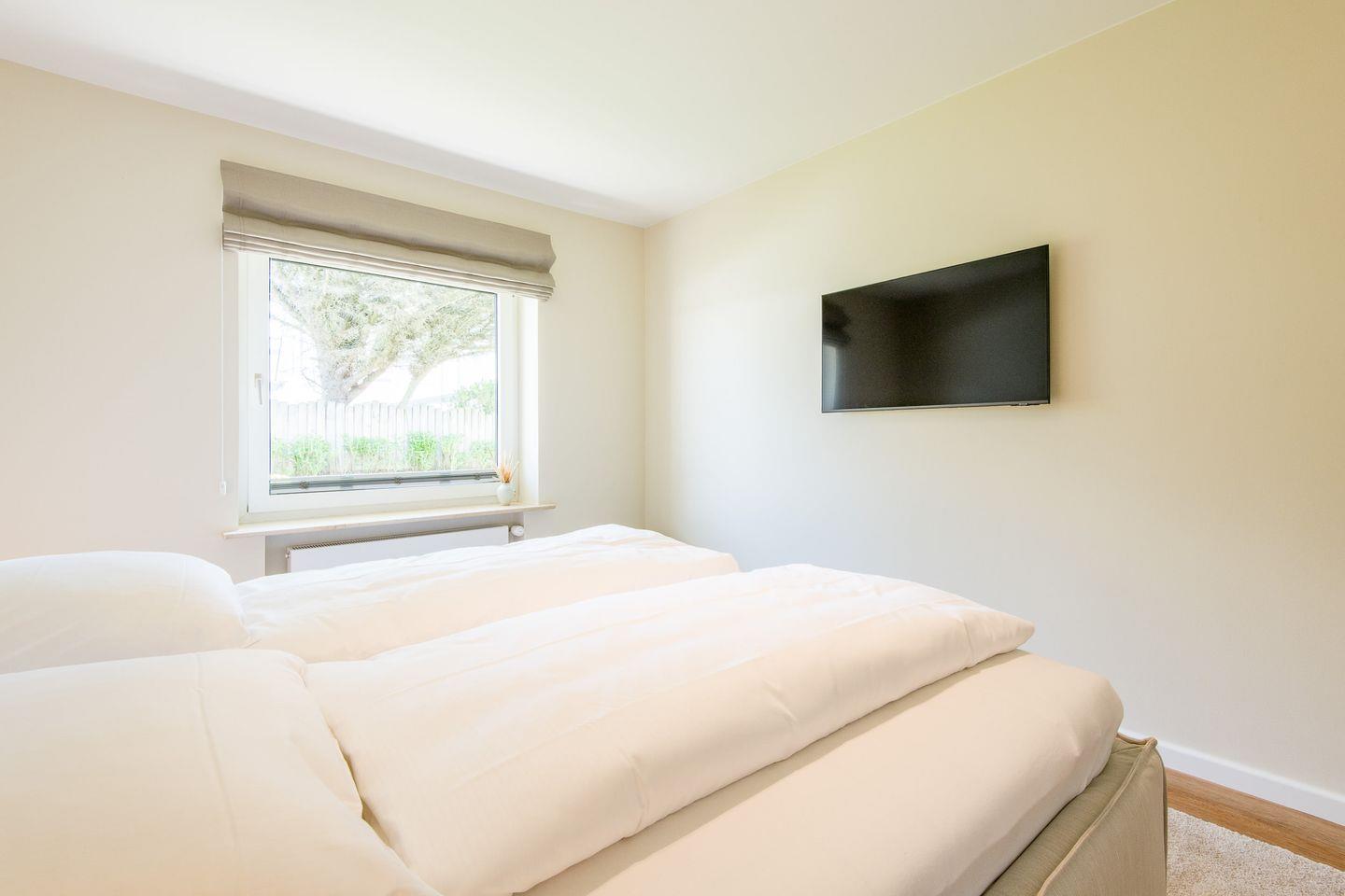 Schlafzimmer 1: Doppelbett, Einbauschrank, TV und Fenster.