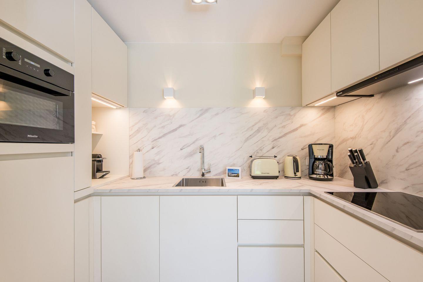Wohn-/Koch-/Essbereich: Geräumiger Wohnraum mit gemütlichem Beleuchtungskonzept, Sofa, TV und einer Kommode. Bei dem Sofa handelt es sich um ein Schlafsofa, welches in ausgezogenem Zustand eine Liegefläche von 1,60 m x 2,00 m hat und einen Schlafplatz für eine weitere Personen bietet. Der runde Esstisch mit stylischen Esstischstühlen lädt zu geselligen Mahlzeiten ein. Die angrenzende und helle Einbauküche ist sehr gut ausgestattet.