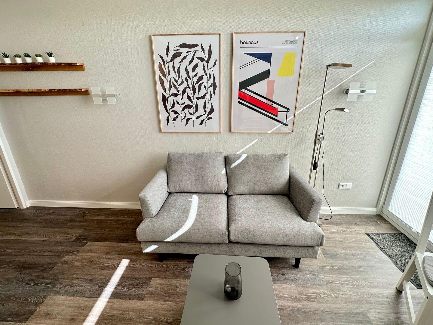 Wohnzimmer lädt mit einer bequemen Couch, einem LED-TV zu entspannten Abenden