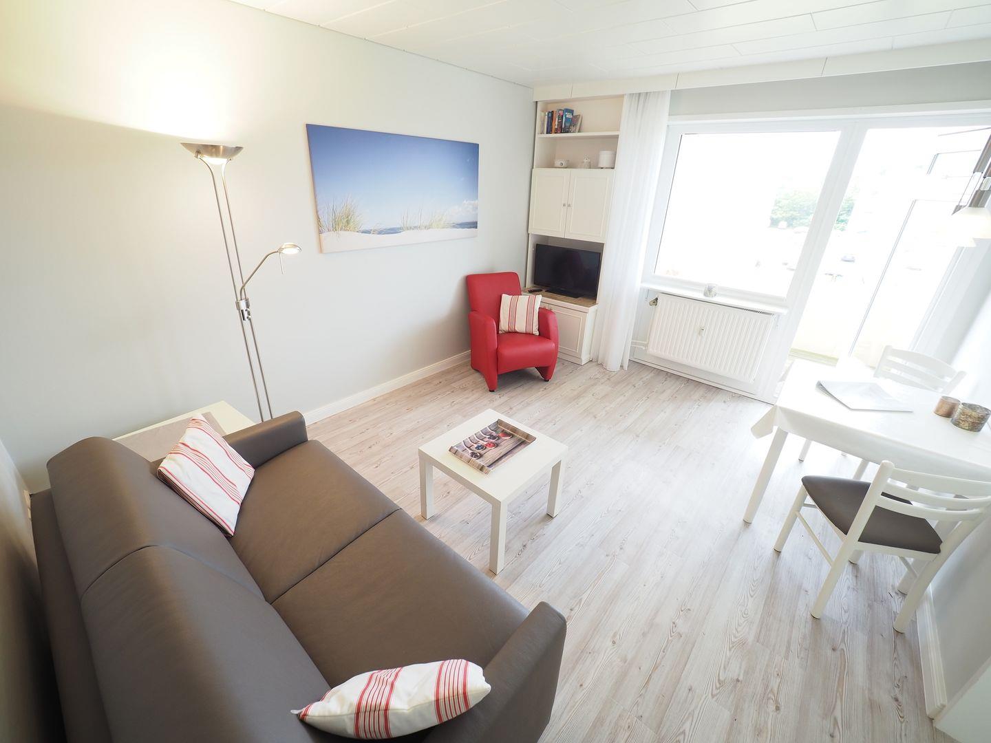 lichtdurchflutet und ausgestattet mit einer bequemen Schlafcouch, einem LED-TV,