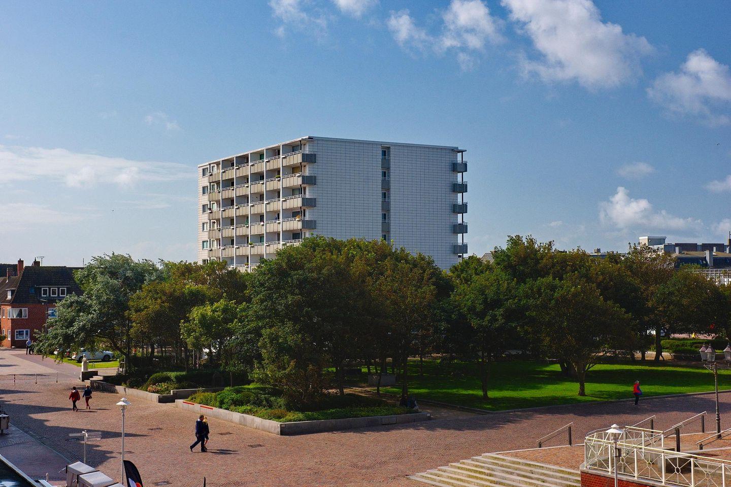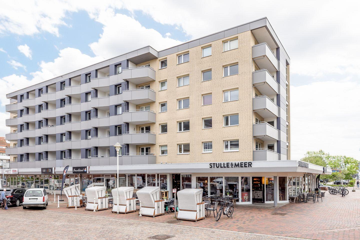 Wohnen im Herzen von Westerland: Appartement Marianne liegt direkt neben dem Rathaus und somit auch in unmittelbarer Nähe zum Bahnhof und der Innenstadt. Praktisch: Im Haus Ankerlicht befinden sich ein Bäcker und der E-Bike Verleih Sturmflotte.