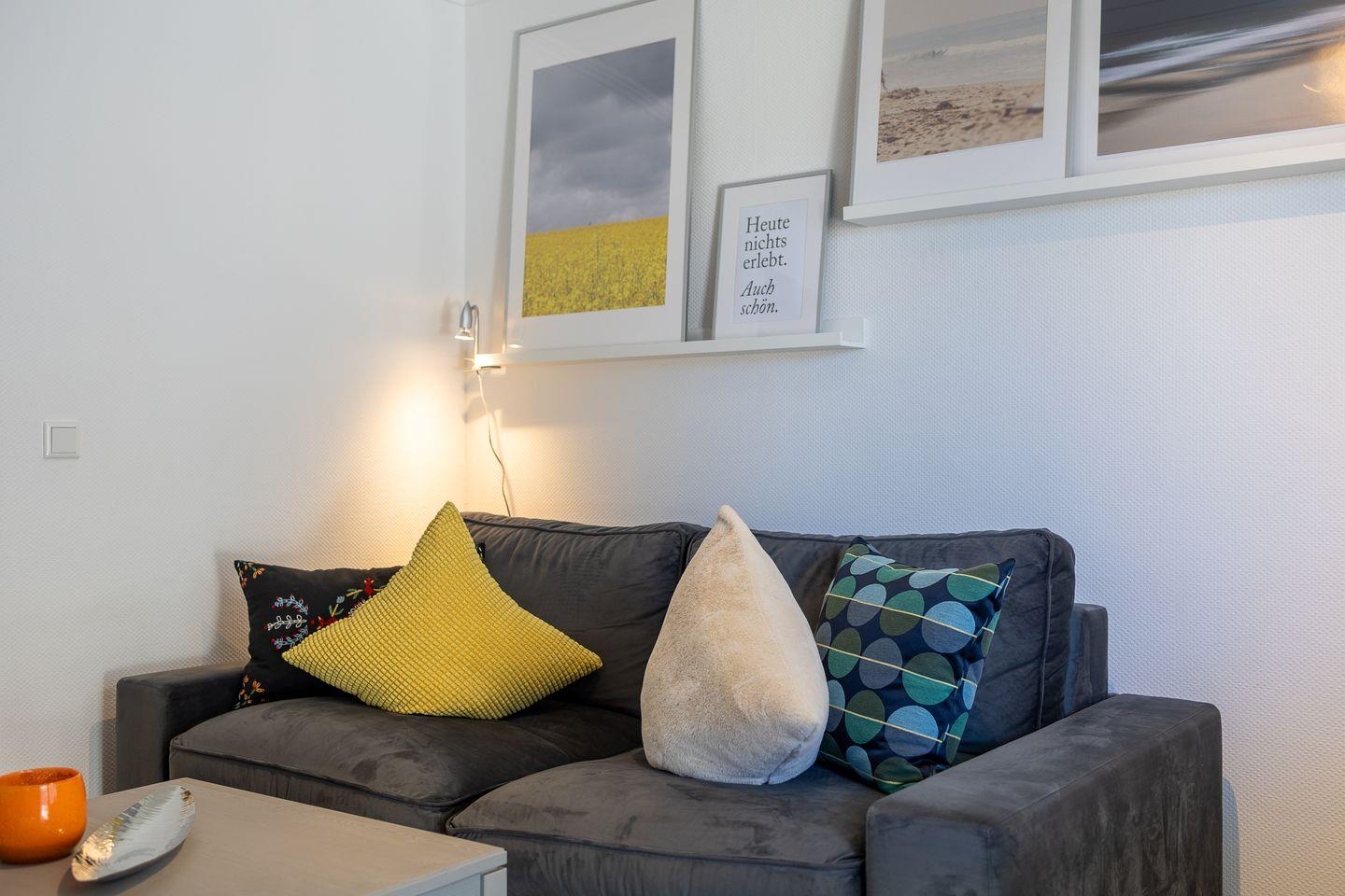 In diesem coolen Kleinod trifft edles Grau auf farbenfrohe Accessoires und der Gemütlichkeitsfaktor ist hoch. Sofa und Vorhänge aus Samt eingerahmt von hübscher Fotokunst und einer offenen Küche, die mit allen Schikanen ausgestattet ist. Der Balkon bietet neben Tisch und Stühlen beste Sicht aufs Rathaus. Den hat man auch vom Schlafzimmer, aber viel schöner ist es, hier einfach nur im kuscheligen Bett zu liegen. Das geräumige Duschbad macht die geschmackvolle Wohlfühl-Wohnung dann rundum perfekt.