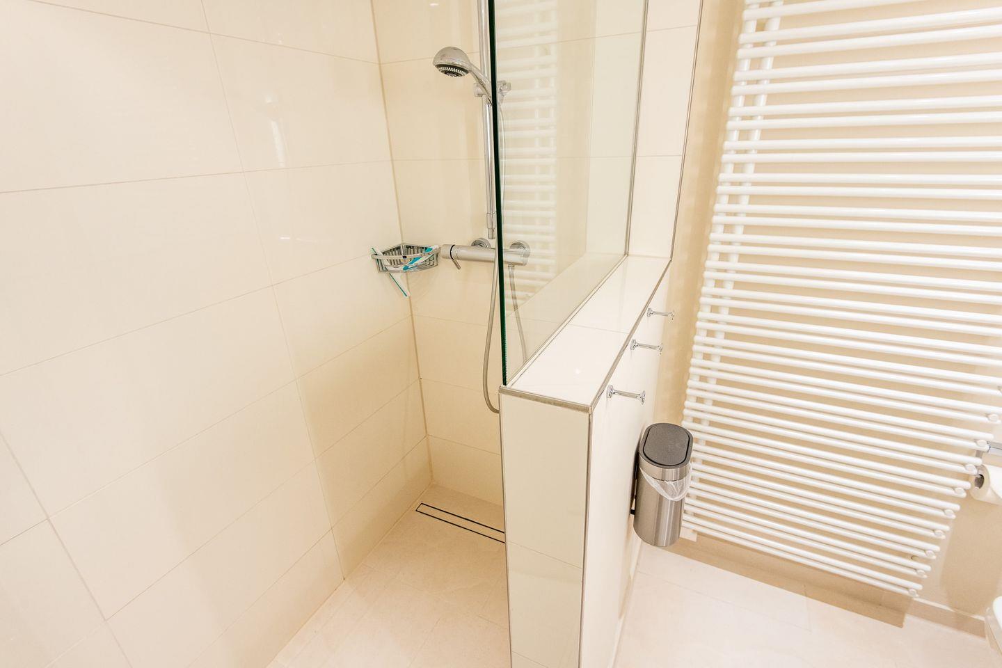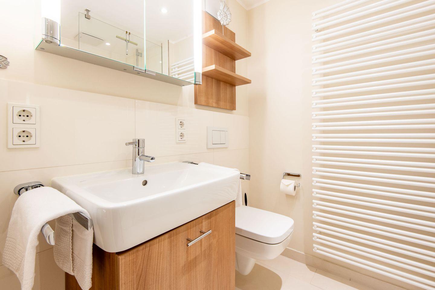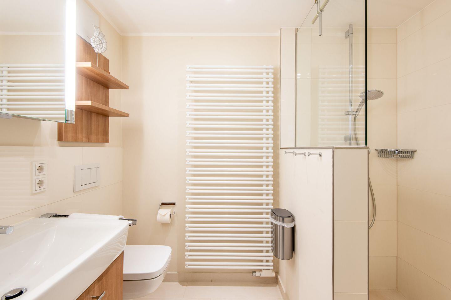 Das erste Badezimmer verfügt über eine großzügige, ebenerdige Regendusche, WC, Handtuchwärmer und Föhn und ist direkt mit dem Hauptschlafzimmer verbunden. Das zweite Badezimmer bietet ebenfalls eine Regendusche, WC, einen Handtuchwärmer und ist zentral zugänglich. Ein zusätzliches Gäste-WC im Eingangsbereich erhöht den Komfort für alle Gäste.