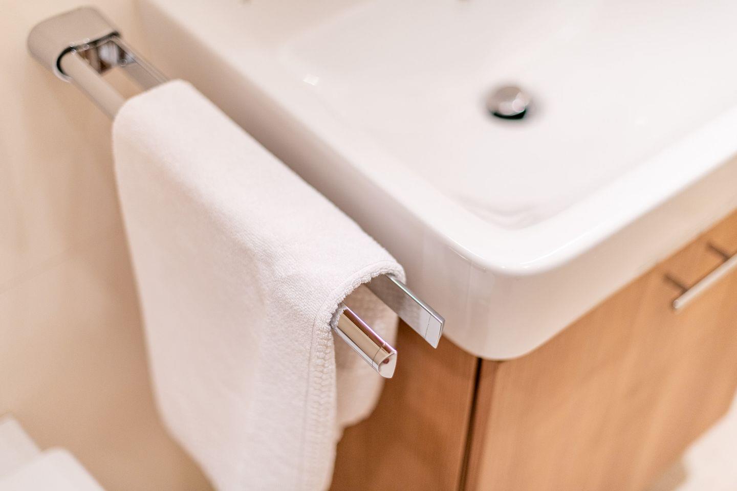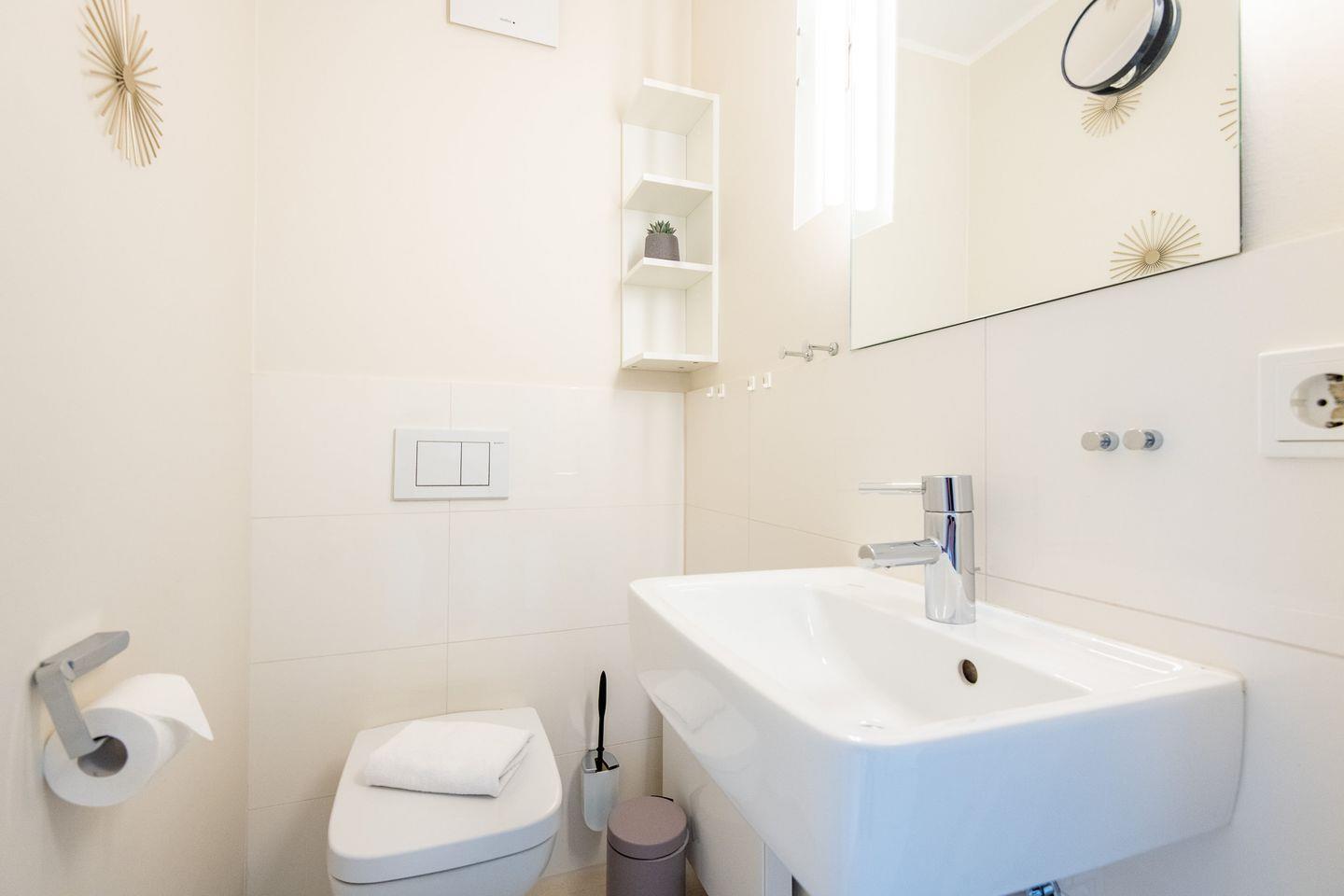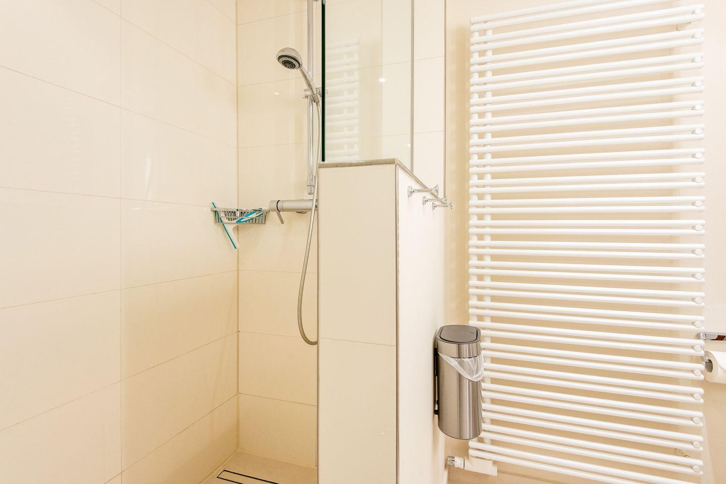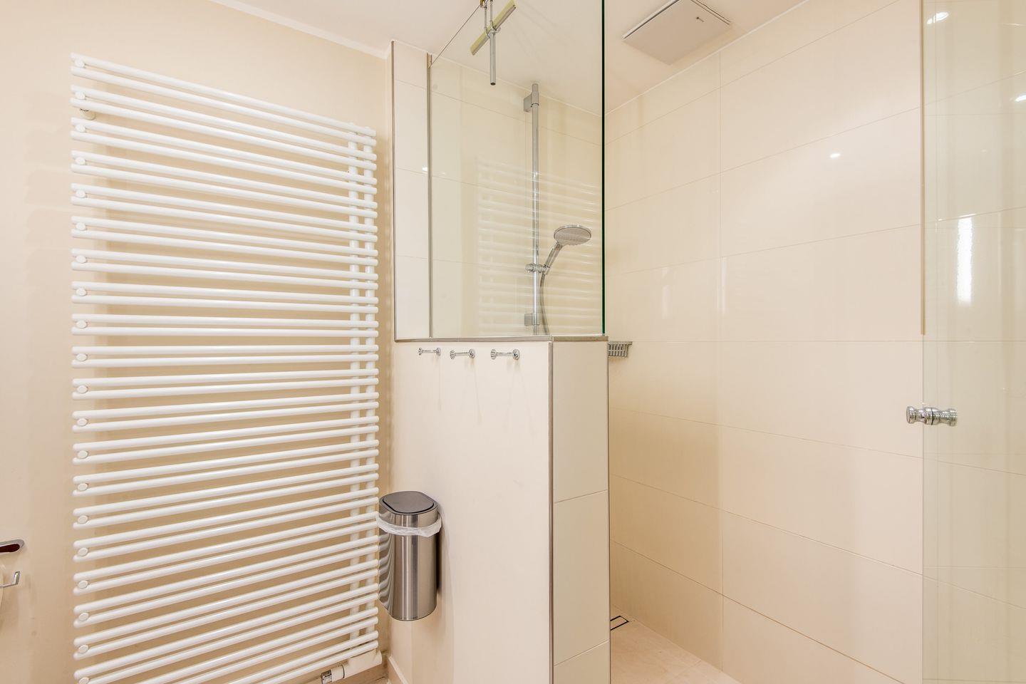 Das erste Badezimmer verfügt über eine großzügige, ebenerdige Regendusche, WC, Handtuchwärmer und Föhn und ist direkt mit dem Hauptschlafzimmer verbunden. Das zweite Badezimmer bietet ebenfalls eine Regendusche, WC, einen Handtuchwärmer und ist zentral zugänglich. Ein zusätzliches Gäste-WC im Eingangsbereich erhöht den Komfort für alle Gäste.