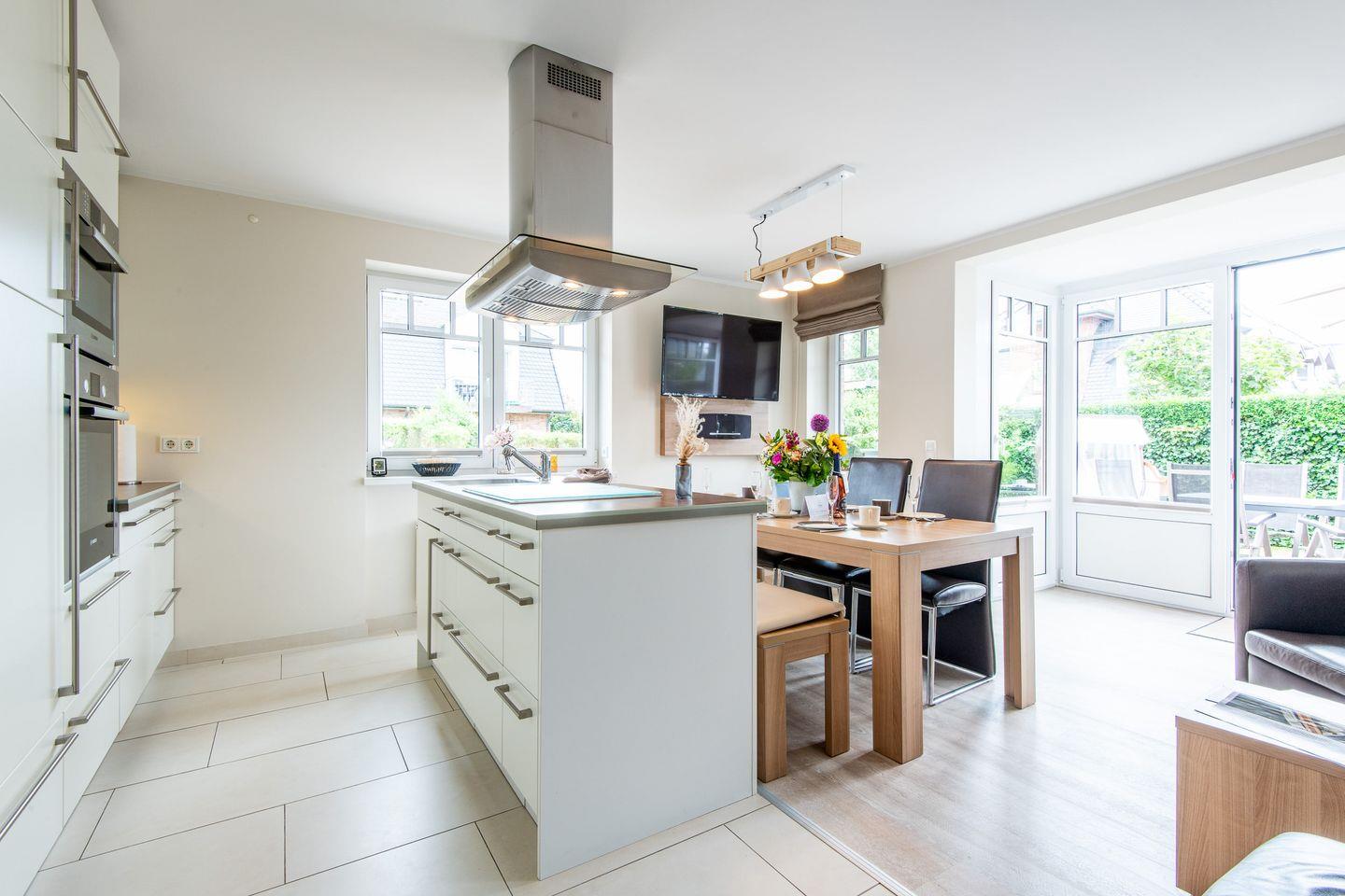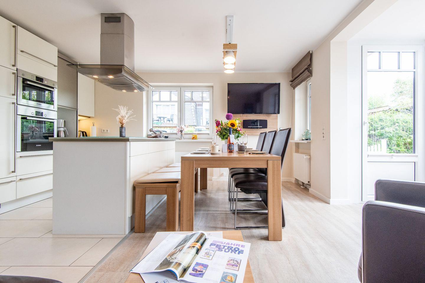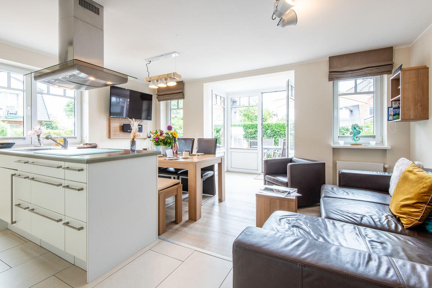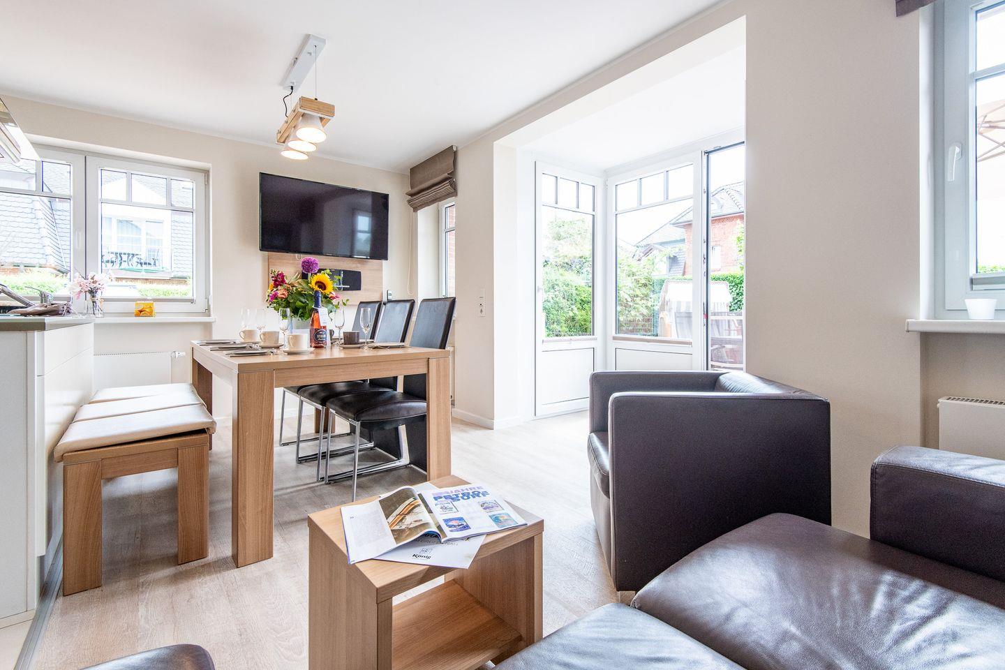 Das großzügige Wohnzimmer ist mit einem komfortablen Lederecksofa für drei Personen, einem Ledersessel sowie einem Esstisch mit drei Stühlen und einer Sitzbank für drei Personen ausgestattet. Von hier aus haben Sie direkten Zugang zur möblierten Gartenterrasse nach Süden, die mit einem Strandkorb ideal zum Sonnen und Entspannen ist.