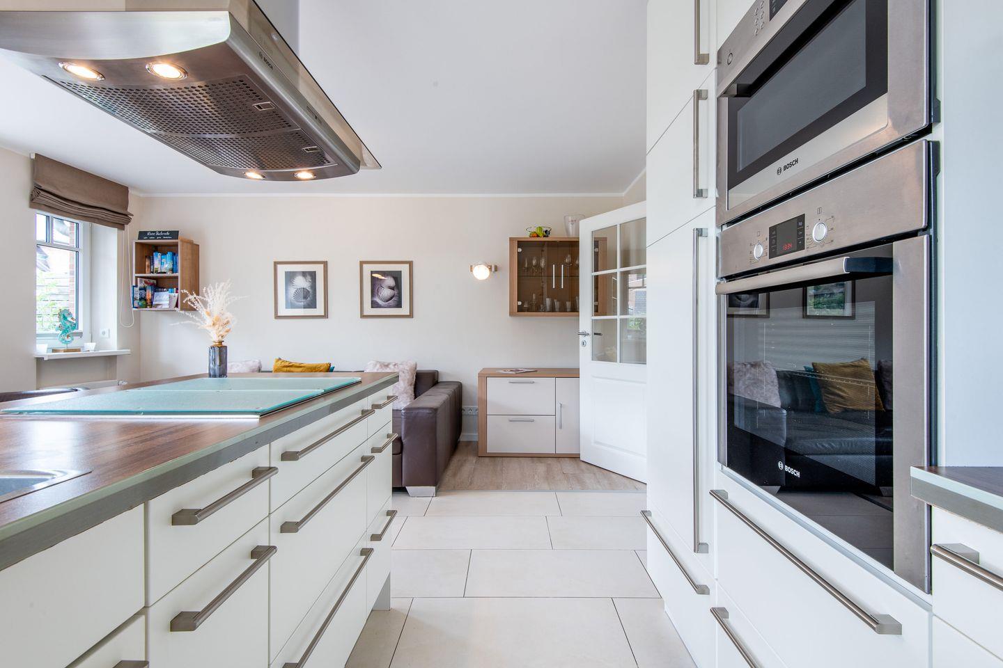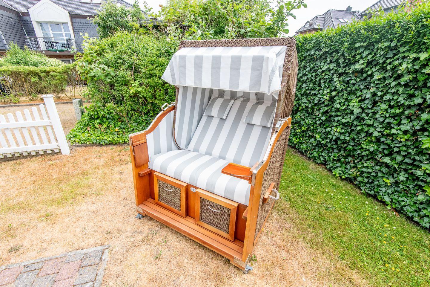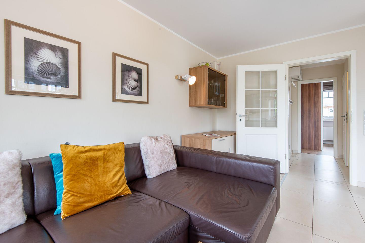 Das großzügige Wohnzimmer ist mit einem komfortablen Lederecksofa für drei Personen, einem Ledersessel sowie einem Esstisch mit drei Stühlen und einer Sitzbank für drei Personen ausgestattet. Von hier aus haben Sie direkten Zugang zur möblierten Gartenterrasse nach Süden, die mit einem Strandkorb ideal zum Sonnen und Entspannen ist.