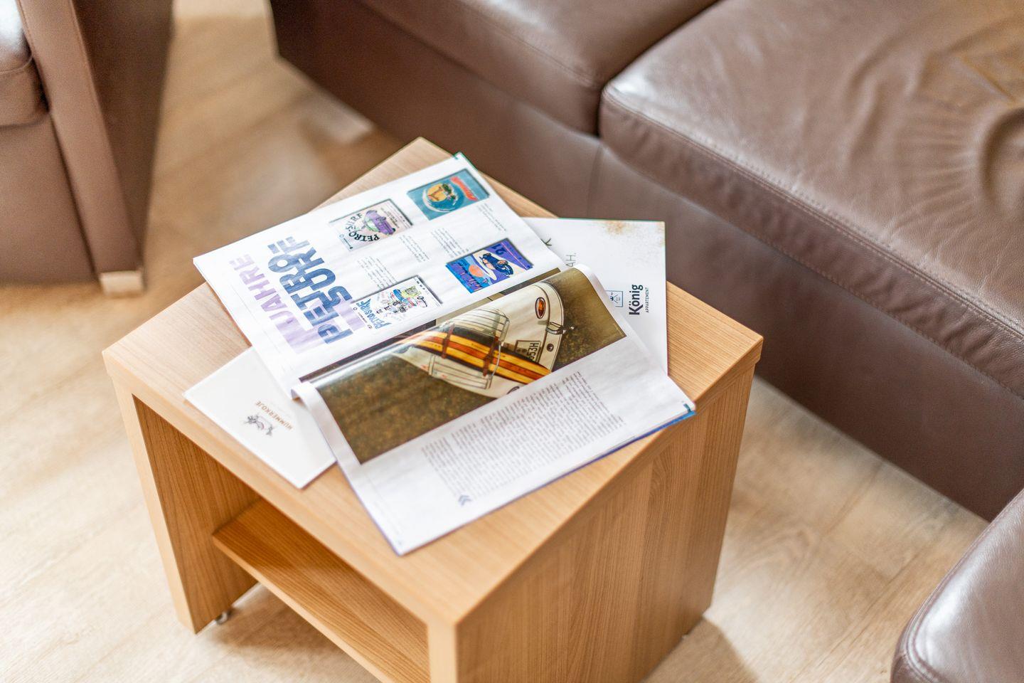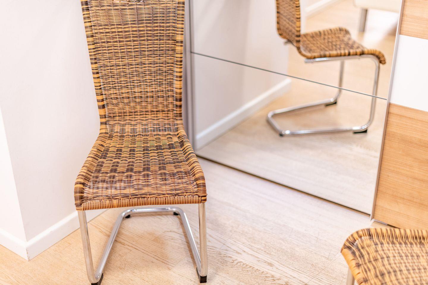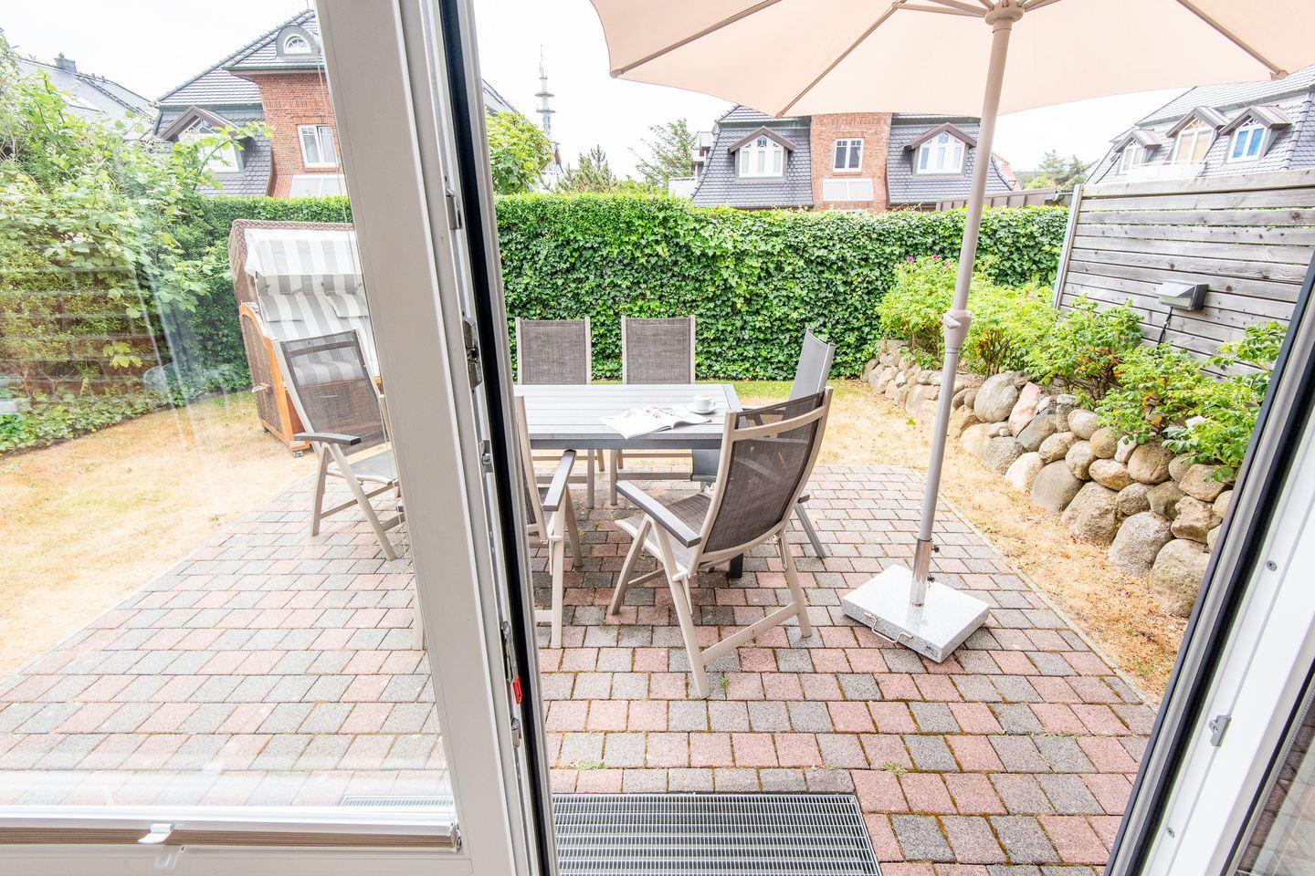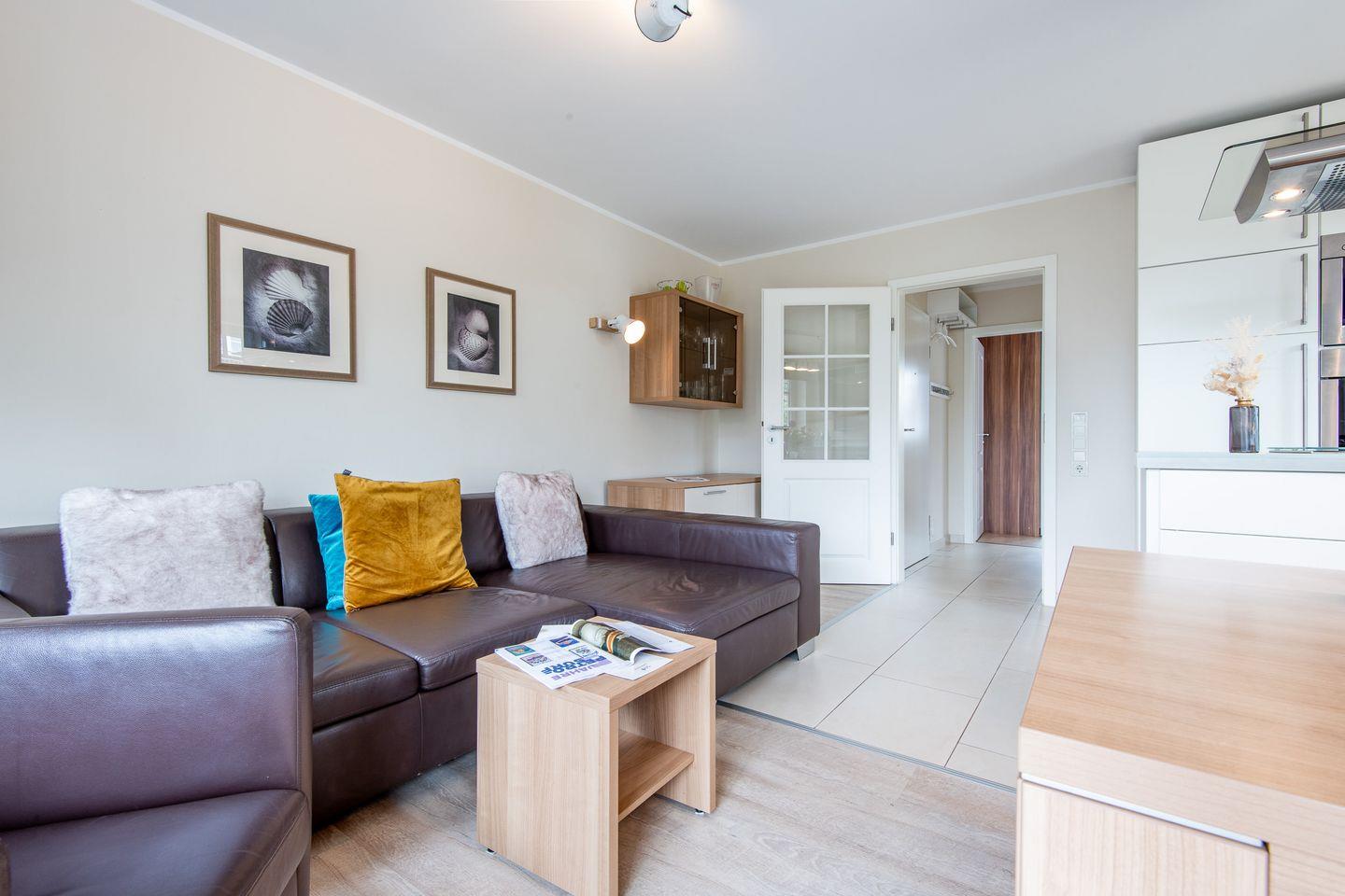 Das großzügige Wohnzimmer ist mit einem komfortablen Lederecksofa für drei Personen, einem Ledersessel sowie einem Esstisch mit drei Stühlen und einer Sitzbank für drei Personen ausgestattet. Von hier aus haben Sie direkten Zugang zur möblierten Gartenterrasse nach Süden, die mit einem Strandkorb ideal zum Sonnen und Entspannen ist.