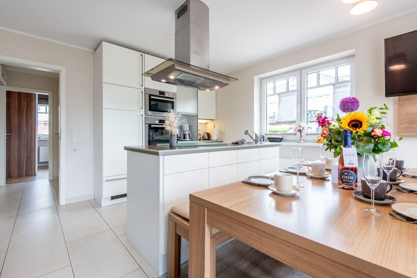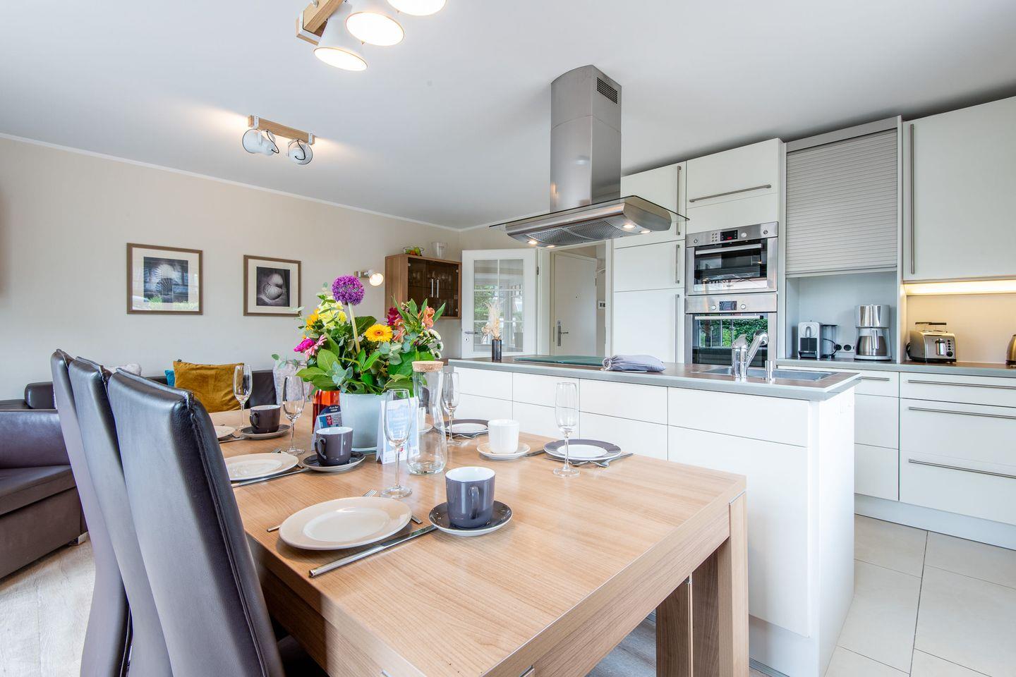 Die moderne, offene Küche ist umfassend ausgestattet und bietet alles, was Sie benötigen. Zur Ausstattung gehören ein 4-flammiger Herd, ein Geschirrspüler, eine Nespresso-Maschine und alle weiteren Annehmlichkeiten für eine entspannte Selbstverpflegung.