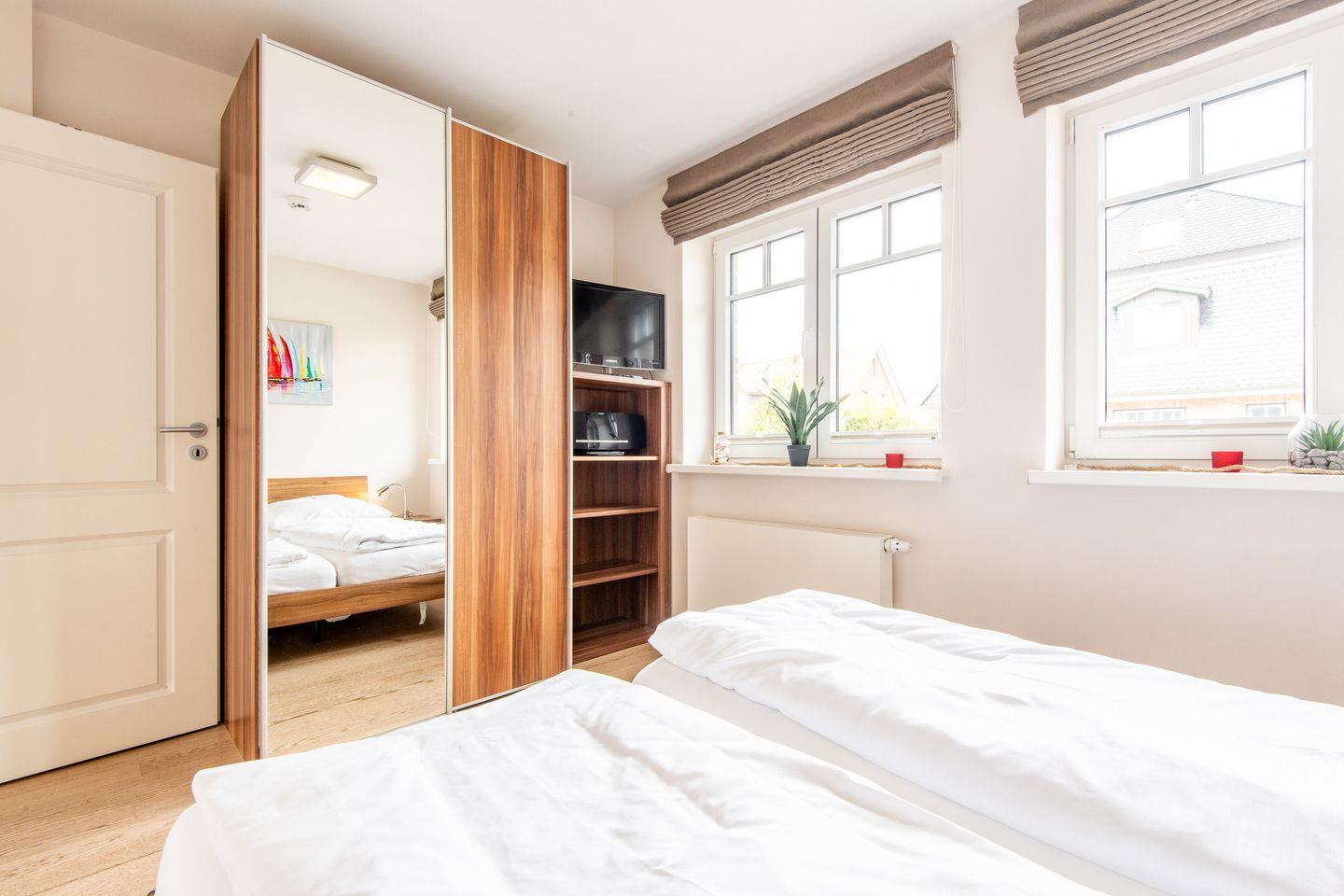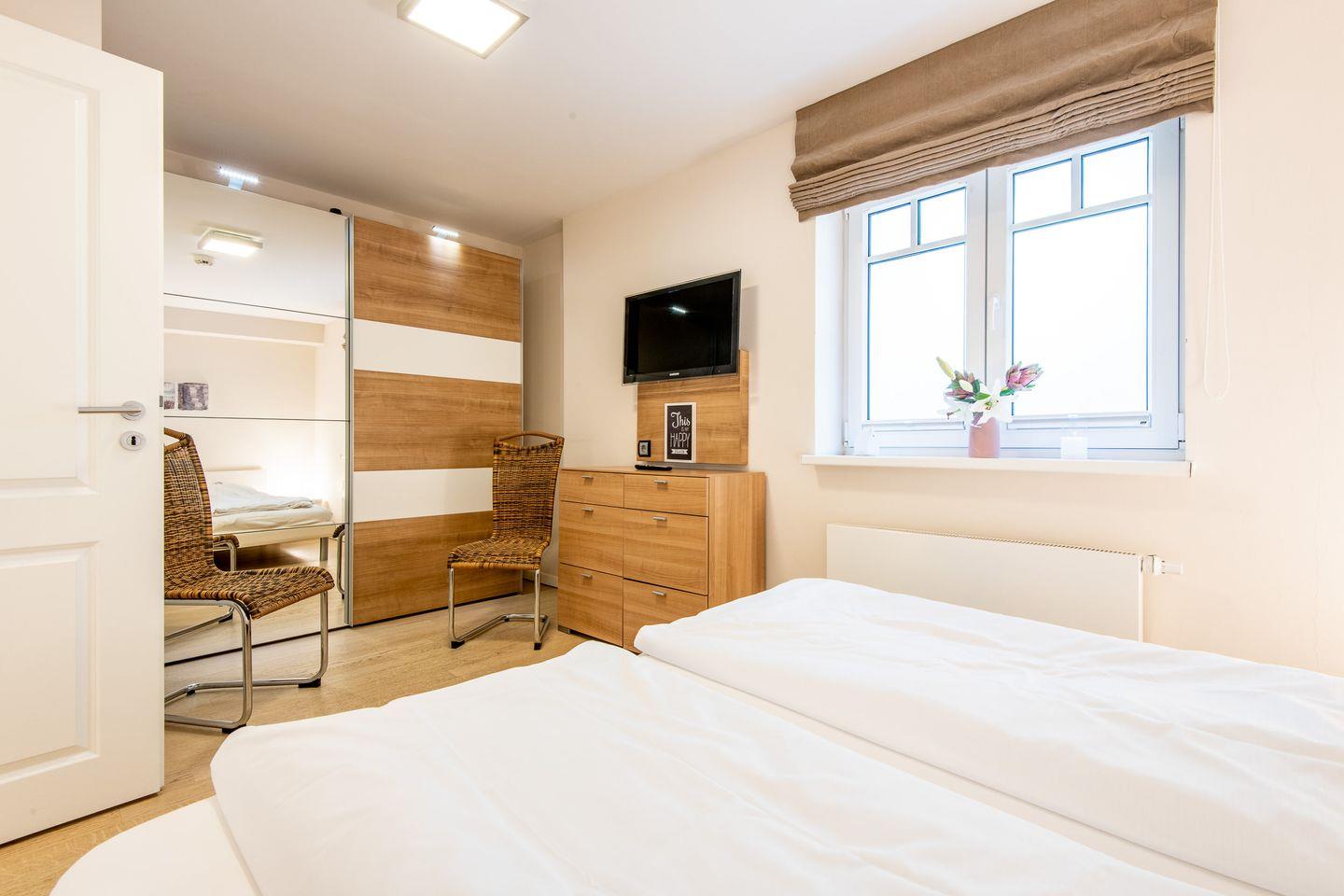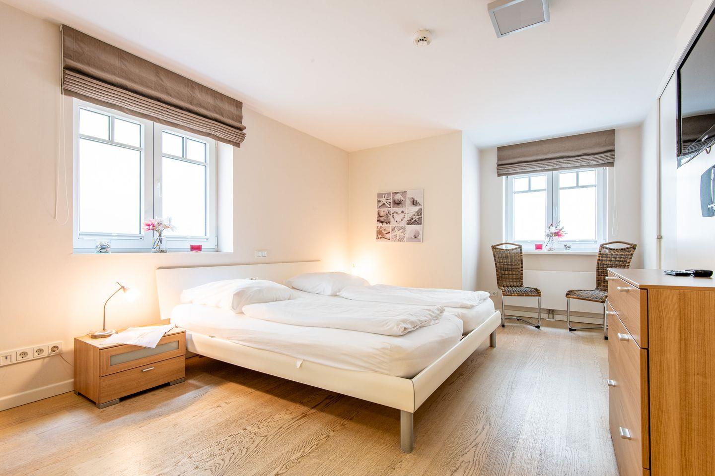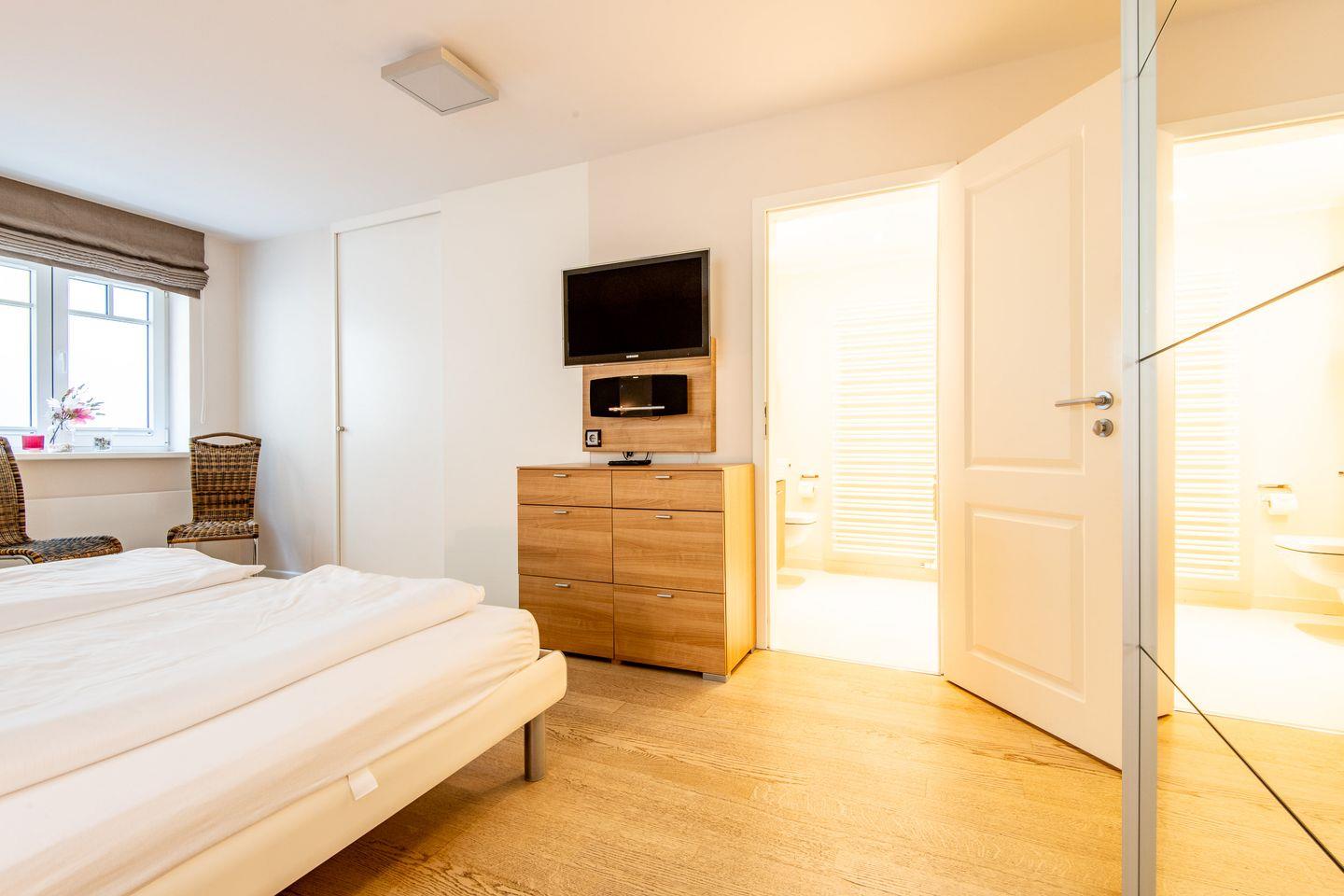 Im ersten Schlafzimmer erwartet Sie ein großes Doppelbett (2x 100x210 cm), ein geräumiger Kleiderschrank, eine Kommode, zwei Stühle und ein TV. Das erste Badezimmer ist direkt en suite angeschlossen. Das zweite Schlafzimmer bietet ein weiteres Doppelbett (2x 90x200 cm), ebenfalls mit Kleiderschrank und TV. Das dritte Schlafzimmer ist mit einem Doppelbett (2x 80x200 cm), Kleiderschrank und TV ausgestattet, sodass jedes Schlafzimmer über eine einladende und gemütliche Atmosphäre verfügt.