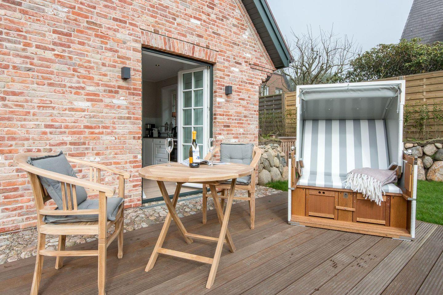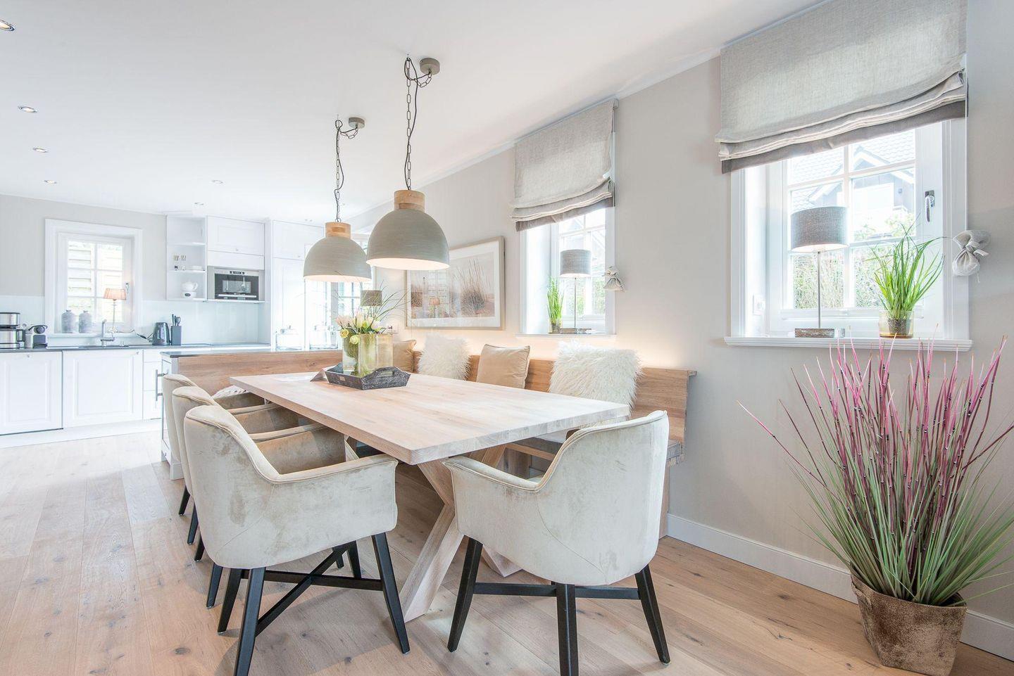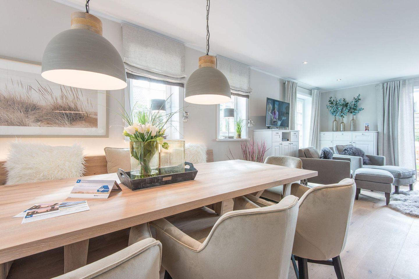 Der helle Wohnbereich lädt mit einem komfortablen Ecksofa, Sessel und modernem LED-TV zu entspannten Stunden ein. Der elegante Gaskamin sorgt für eine angenehme Atmosphäre an kühleren Abenden. Der großzügige Essbereich mit Platz für acht Personen eignet sich hervorragend für gemeinsame Mahlzeiten, und der direkte Zugang zur möblierten Südterrasse mit Strandkorb und kleinem Garten lässt Sie die frische Inselbrise genießen.