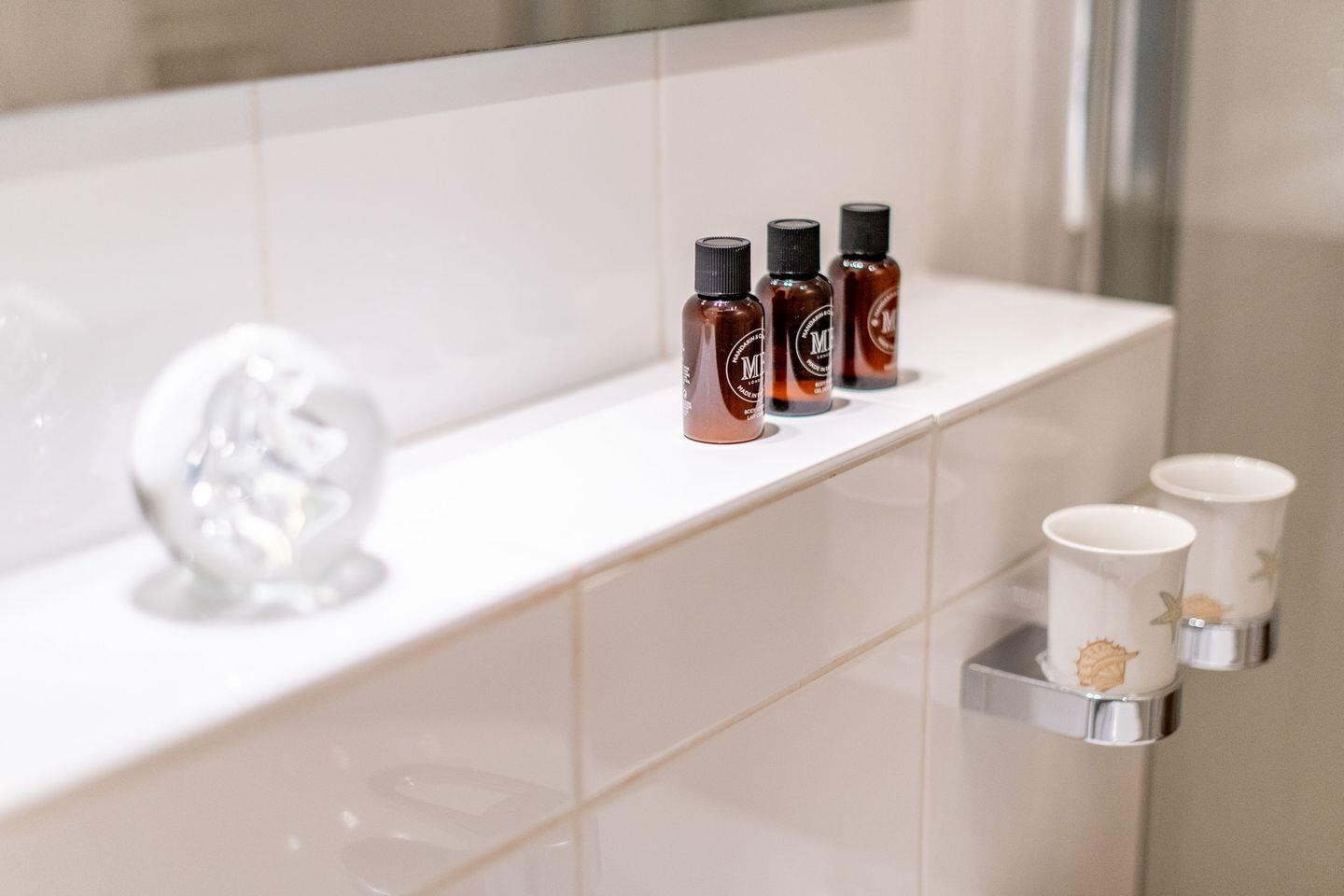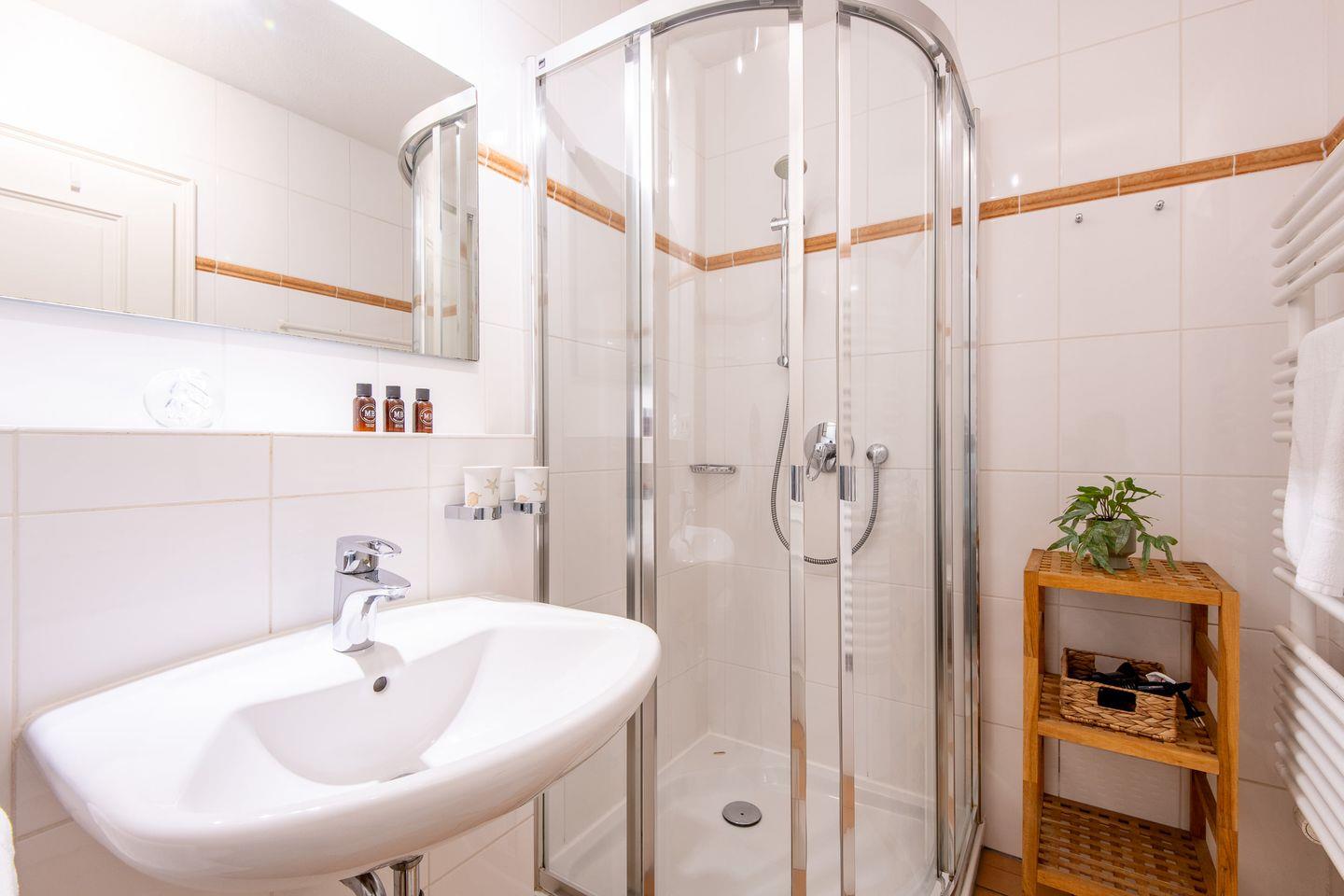 Das Badezimmer ist mit einer Dusche, WC, Handtuchwärmer und Föhn ausgestattet, um höchsten Komfort zu gewährleisten.