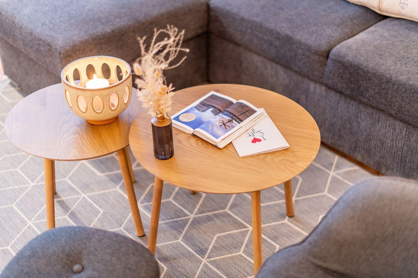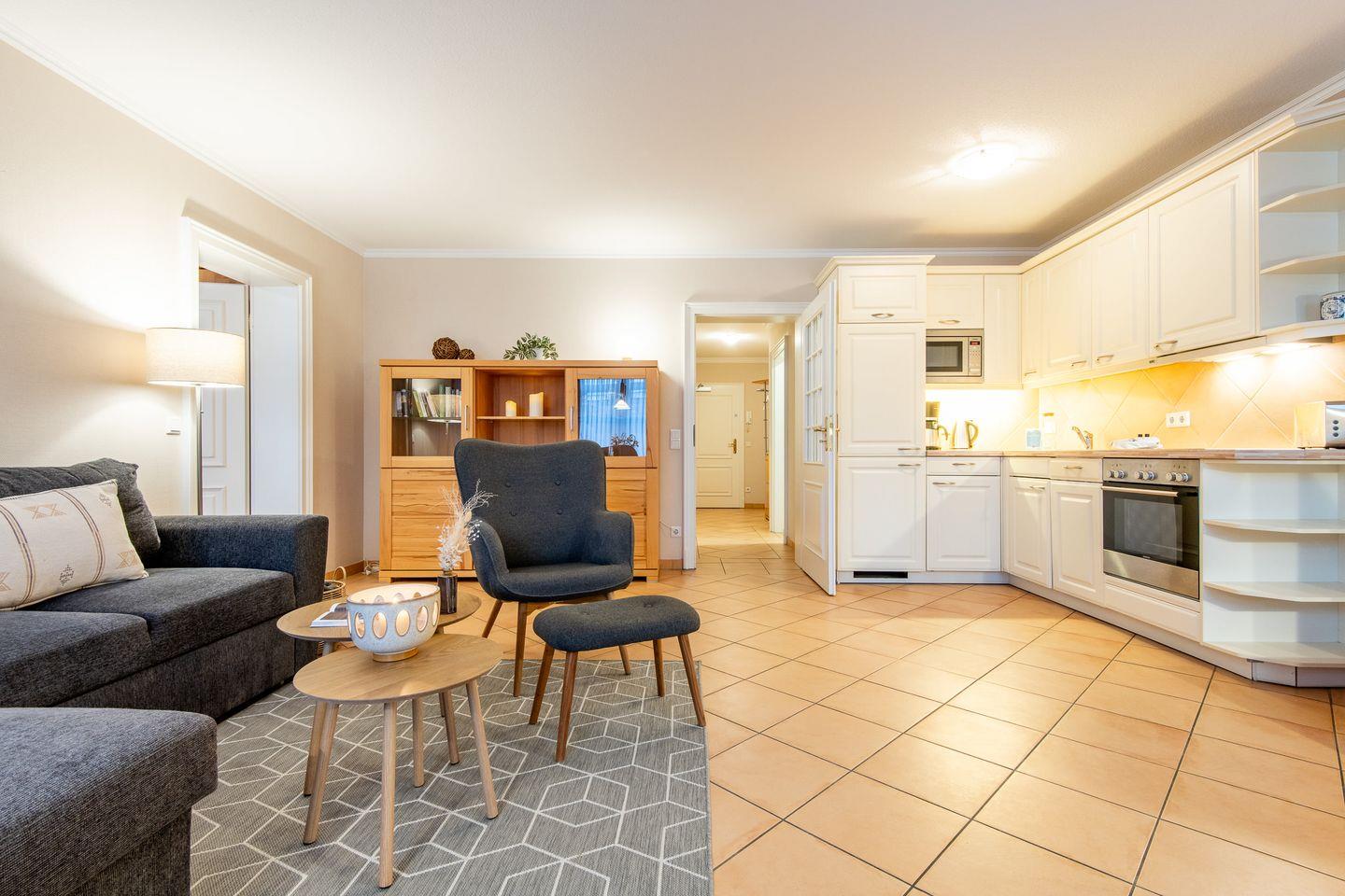 Das geräumige Wohnzimmer ist mit einem ausziehbaren Schlafsofa (140x200 cm), einem Sessel und einem Esstisch für 4 Personen ausgestattet. Vom Wohnzimmer aus haben Sie direkten Zugang zur möblierten Terrasse nach Norden, die mit einem Strandkorb zum Entspannen einlädt.