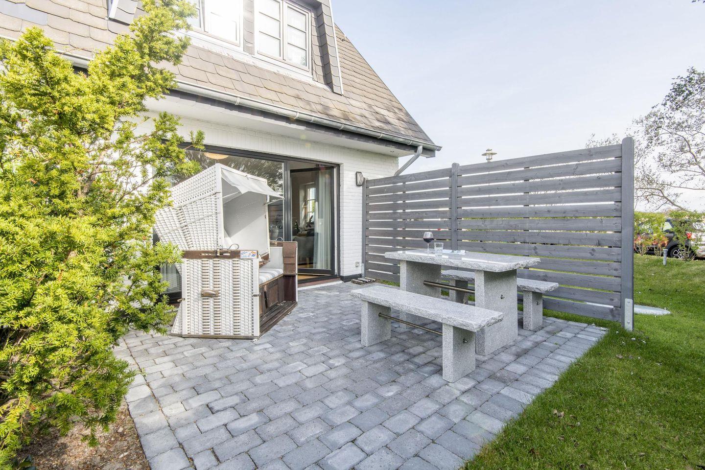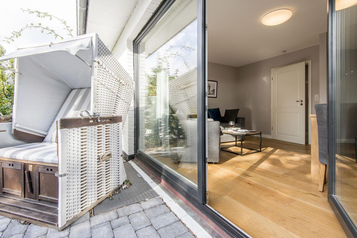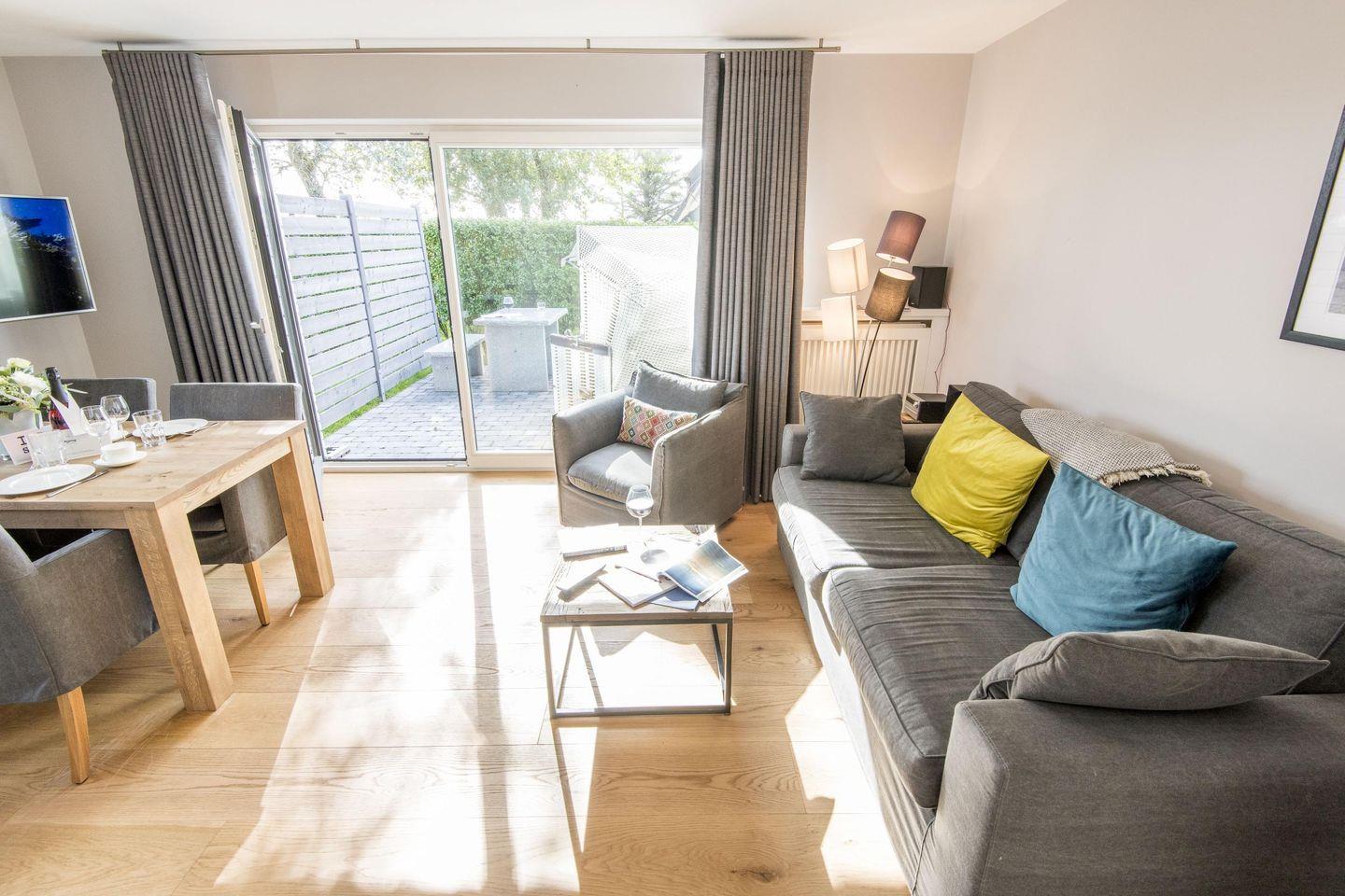 Der lichtdurchflutete Wohnbereich ist geschmackvoll eingerichtet und bietet eine gemütliche Schlafcouch, auf der ein weiterer Gast Platz findet. Bodentiefe Fenster lassen viel Tageslicht herein und öffnen sich zur sonnigen Südterrasse. Die Terrasse mit Strandkorb lädt zum Verweilen ein, sodass Sie hier die frische Nordseeluft genießen und den Tag in Ruhe ausklingen lassen können.