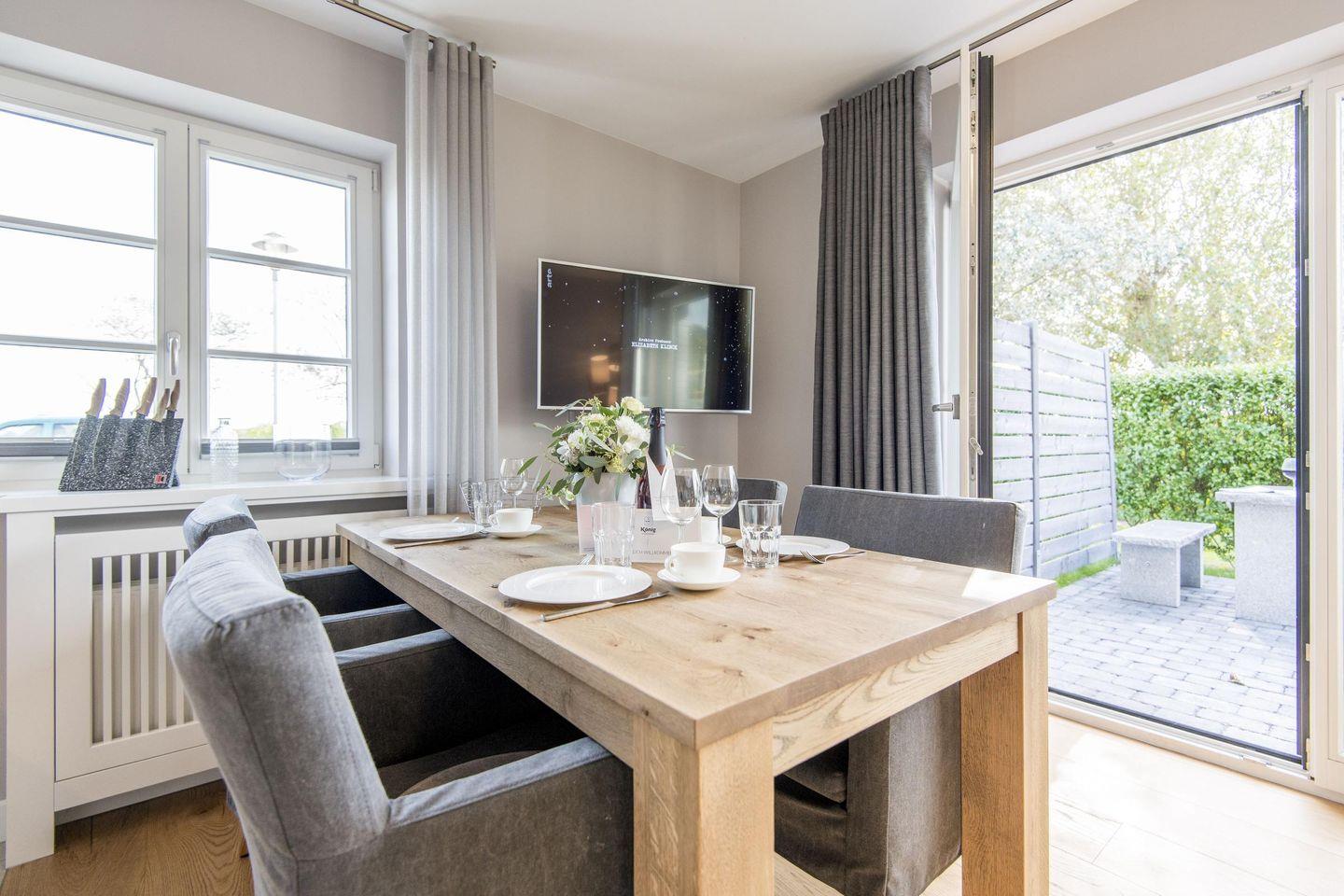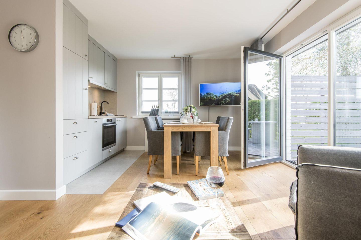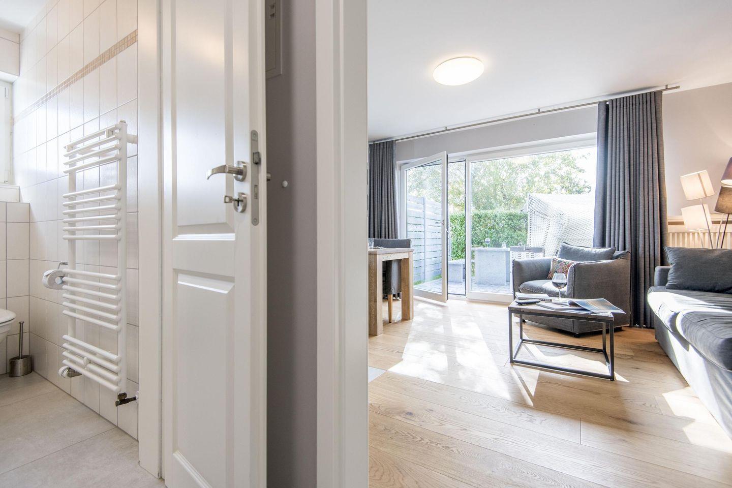 Der lichtdurchflutete Wohnbereich ist geschmackvoll eingerichtet und bietet eine gemütliche Schlafcouch, auf der ein weiterer Gast Platz findet. Bodentiefe Fenster lassen viel Tageslicht herein und öffnen sich zur sonnigen Südterrasse. Die Terrasse mit Strandkorb lädt zum Verweilen ein, sodass Sie hier die frische Nordseeluft genießen und den Tag in Ruhe ausklingen lassen können.