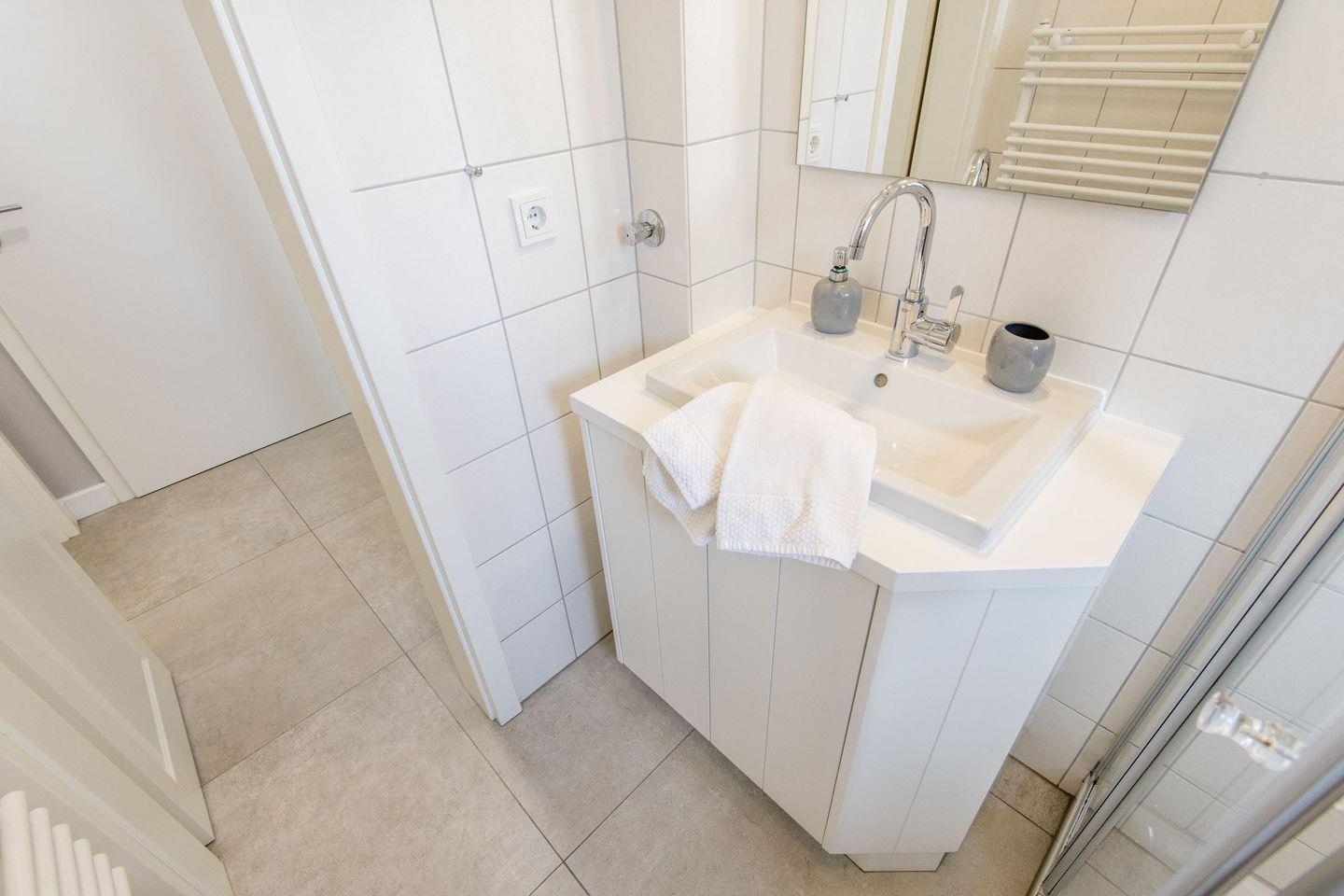 Das moderne Duschbad ist mit einer ebenerdigen Dusche, WC, Handtuchwärmer und Fön ausgestattet und bietet alles, was Sie für einen angenehmen Start in den Tag benötigen.