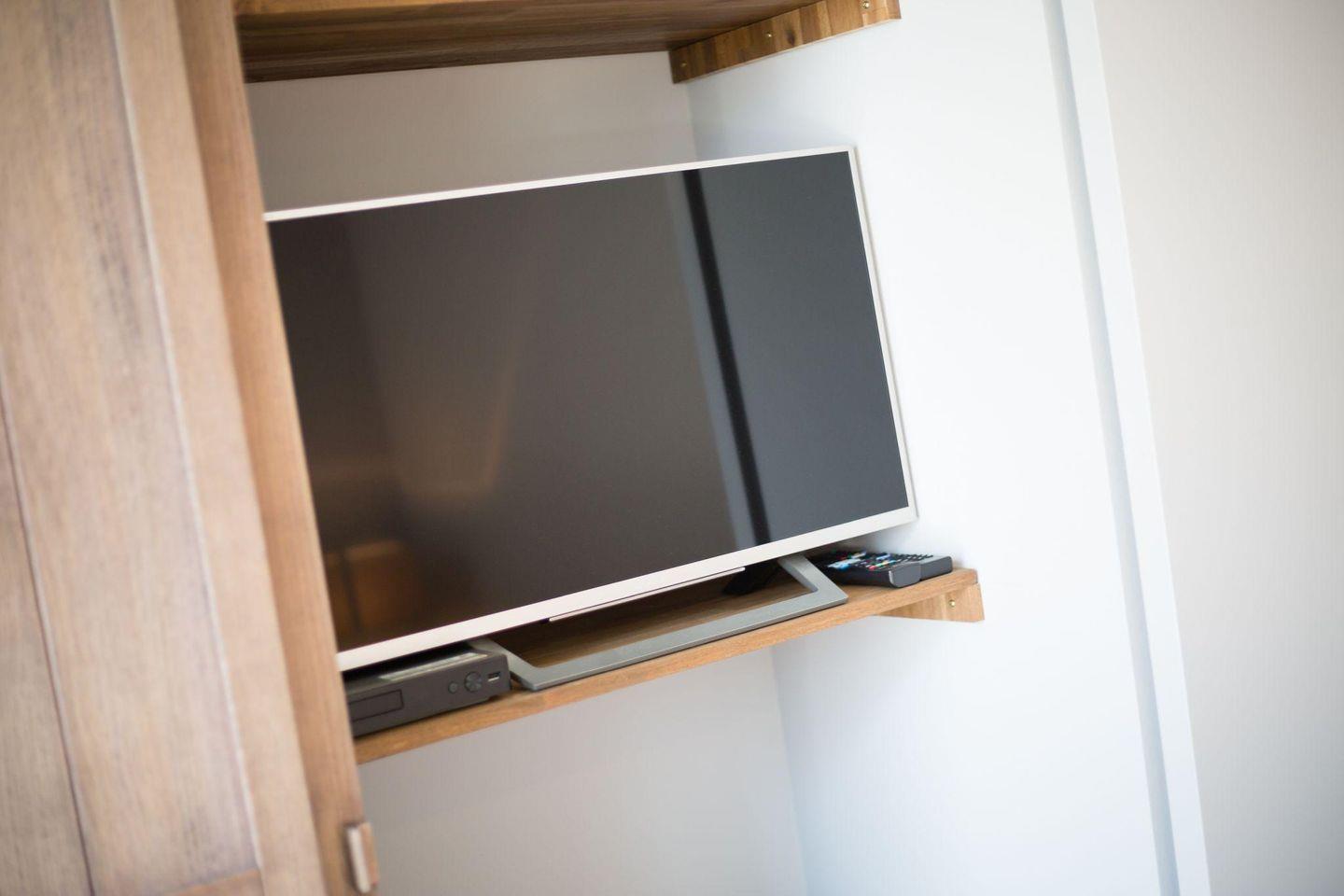 Die großzügige Wohn- und Schlaflandschaft besticht durch bodentiefe Fenster, die den Raum mit Licht durchfluten und eine Verbindung zur großen West-Dachterrasse schaffen. Der perfekte Ort, um den Tag entspannt ausklingen zu lassen. Ein komfortables Sofa, ein zusätzliches Relax-Sofa mit Fußteil, ein TV sowie ein Esstisch für 4 Personen sorgen für ein stilvolles Ambiente. Der elegante Raumteiler mit eingebautem Kleiderschrank und TV trennt den Schlafbereich optisch ab und schafft dabei eine harmonische Raumaufteilung.