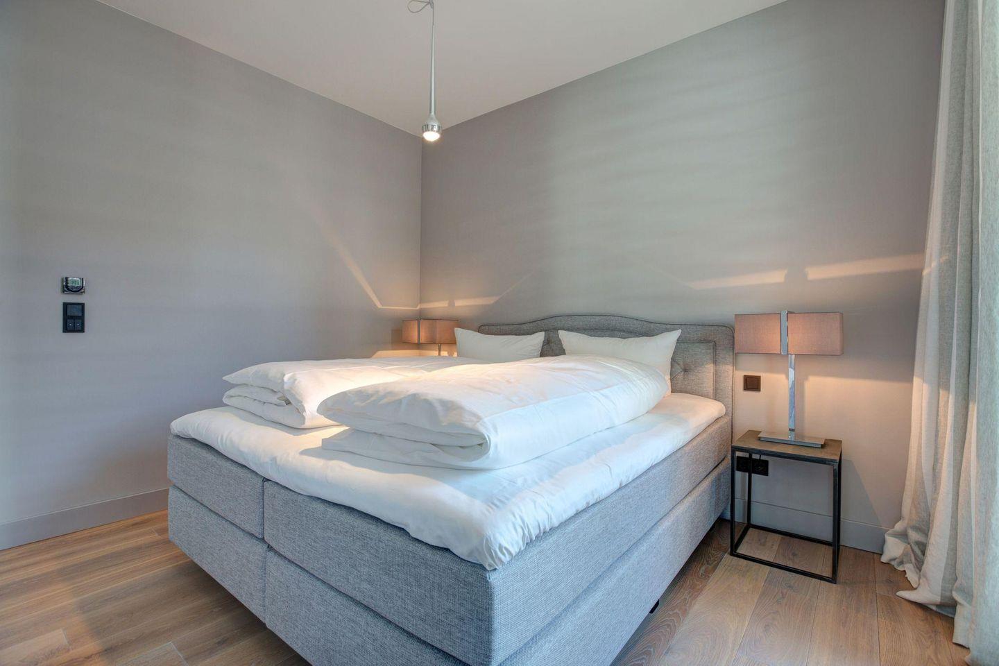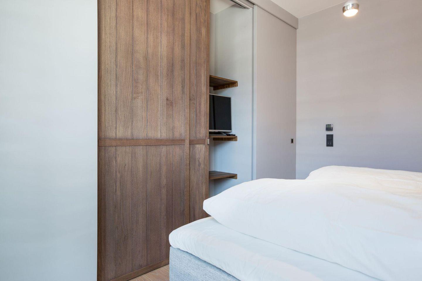 Der Schlafbereich mit Boxspring-Doppelbett (2x 90x200 cm) kann durch Schiebetüren separiert werden, sodass Sie ungestört entspannen können. Auch von hier aus haben Sie direkten Zugang zur Dachterrasse – ideal für einen entspannten Start in den Tag oder um die Abendsonne zu genießen.