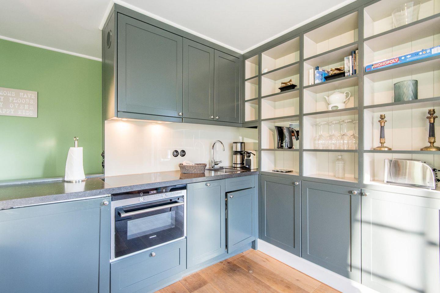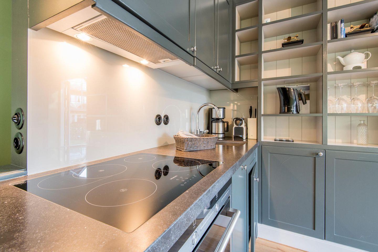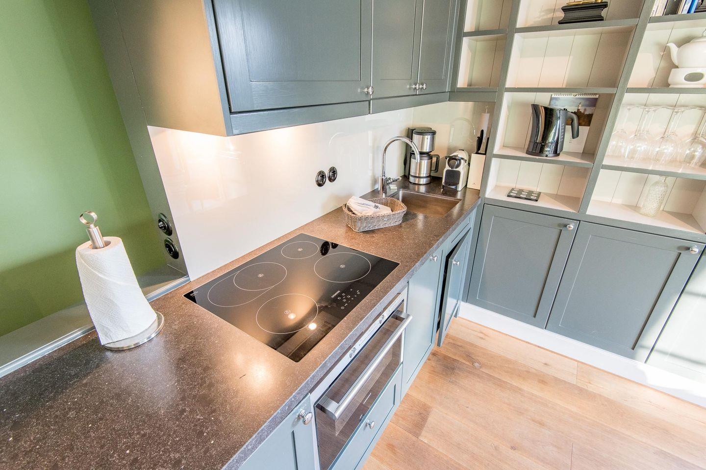 Die vollwertige Einbauküche ist mit einem Induktionskochfeld, Geschirrspüler, Backofen und Mikrowelle ausgestattet. Hier finden Sie alles, was Sie für die Zubereitung leckerer Gerichte benötigen.