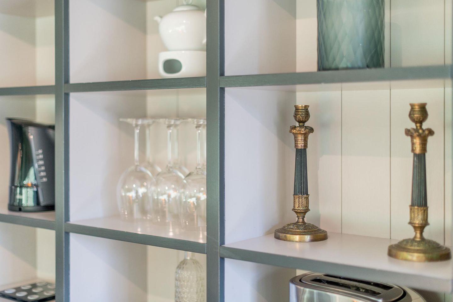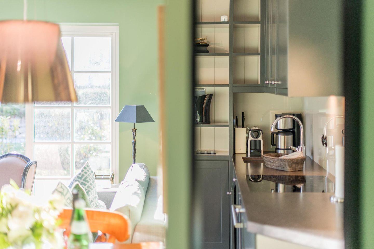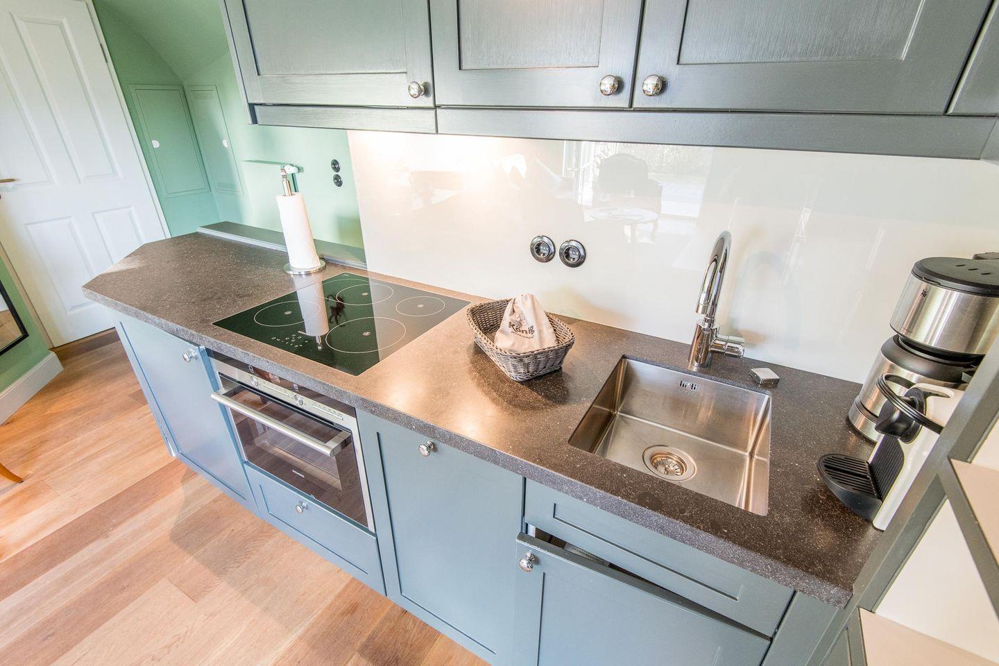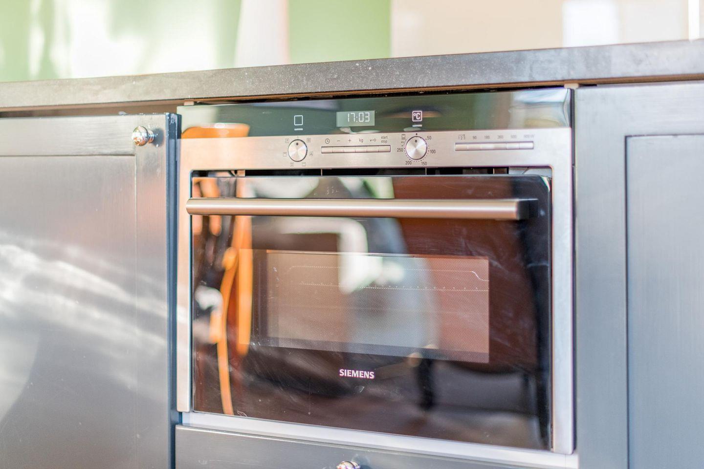 Die vollwertige Einbauküche ist mit einem Induktionskochfeld, Geschirrspüler, Backofen und Mikrowelle ausgestattet. Hier finden Sie alles, was Sie für die Zubereitung leckerer Gerichte benötigen.