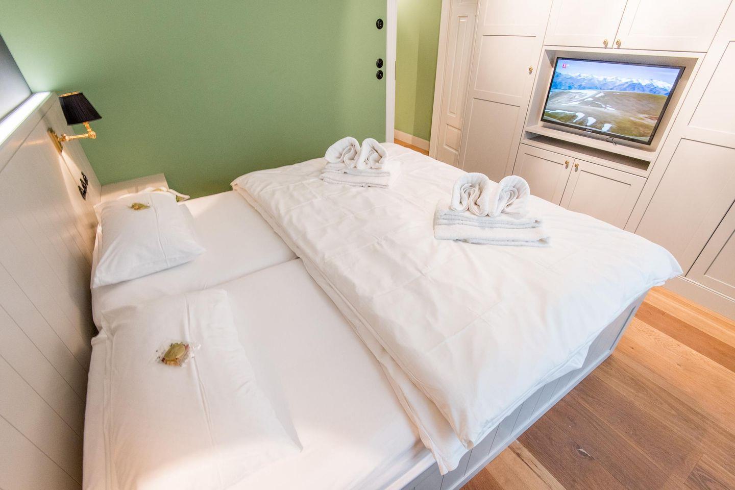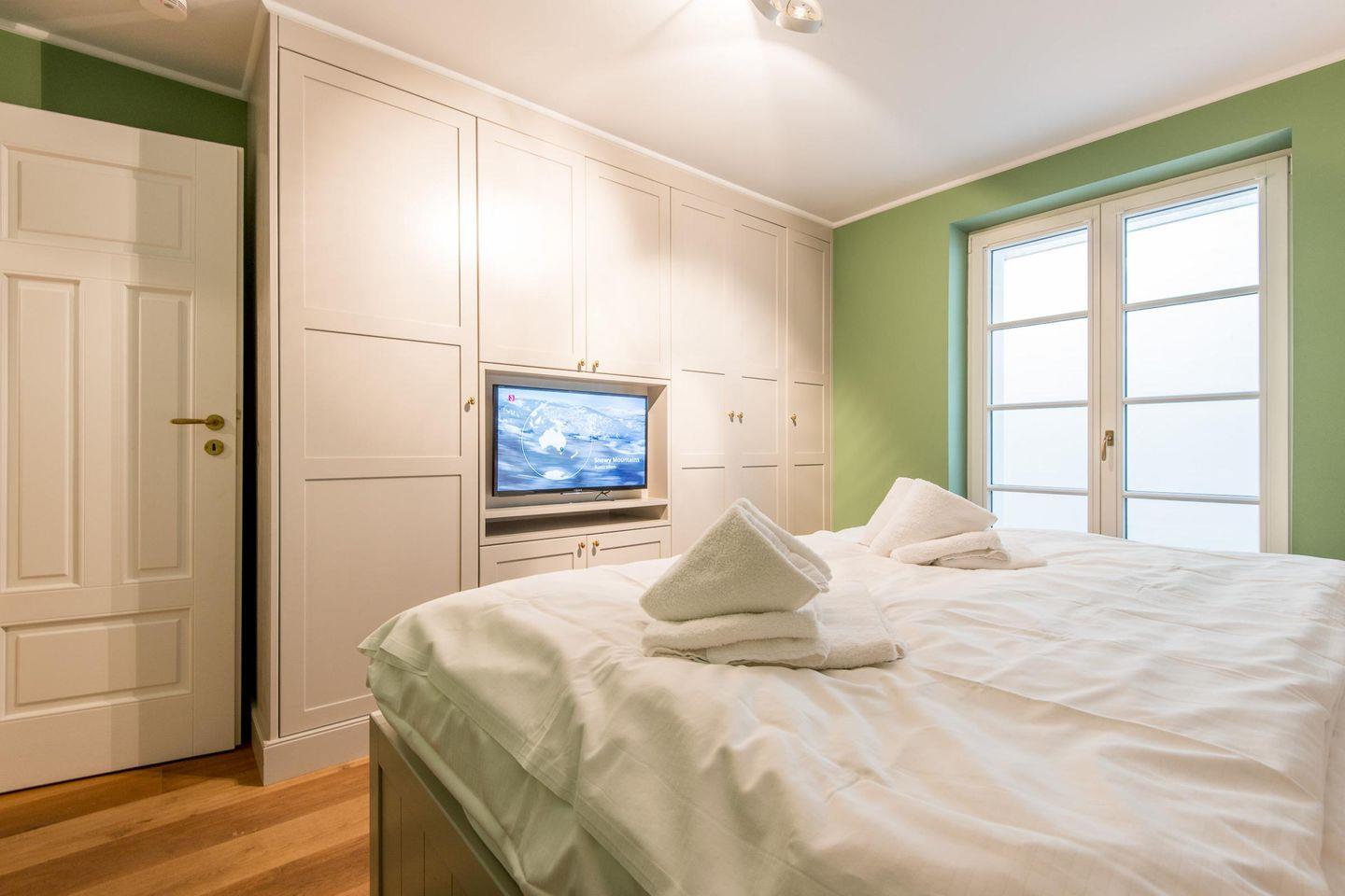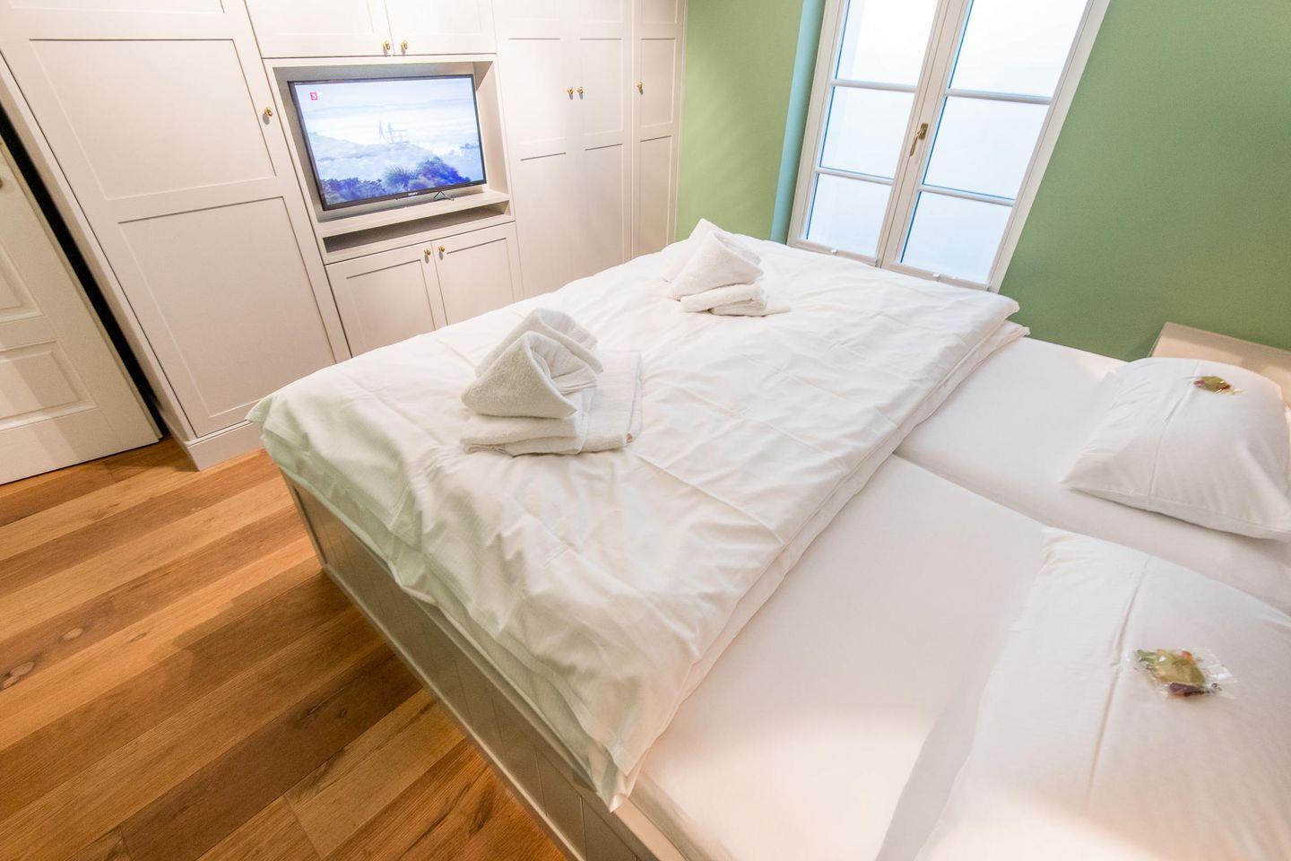 Das Schlafzimmer bietet ein komfortables Doppelbett (2x 90x200 cm) mit hochwertigen TEMPUR-Matratzen sowie einen Einbauschrank und einen TV für entspannte Stunden.