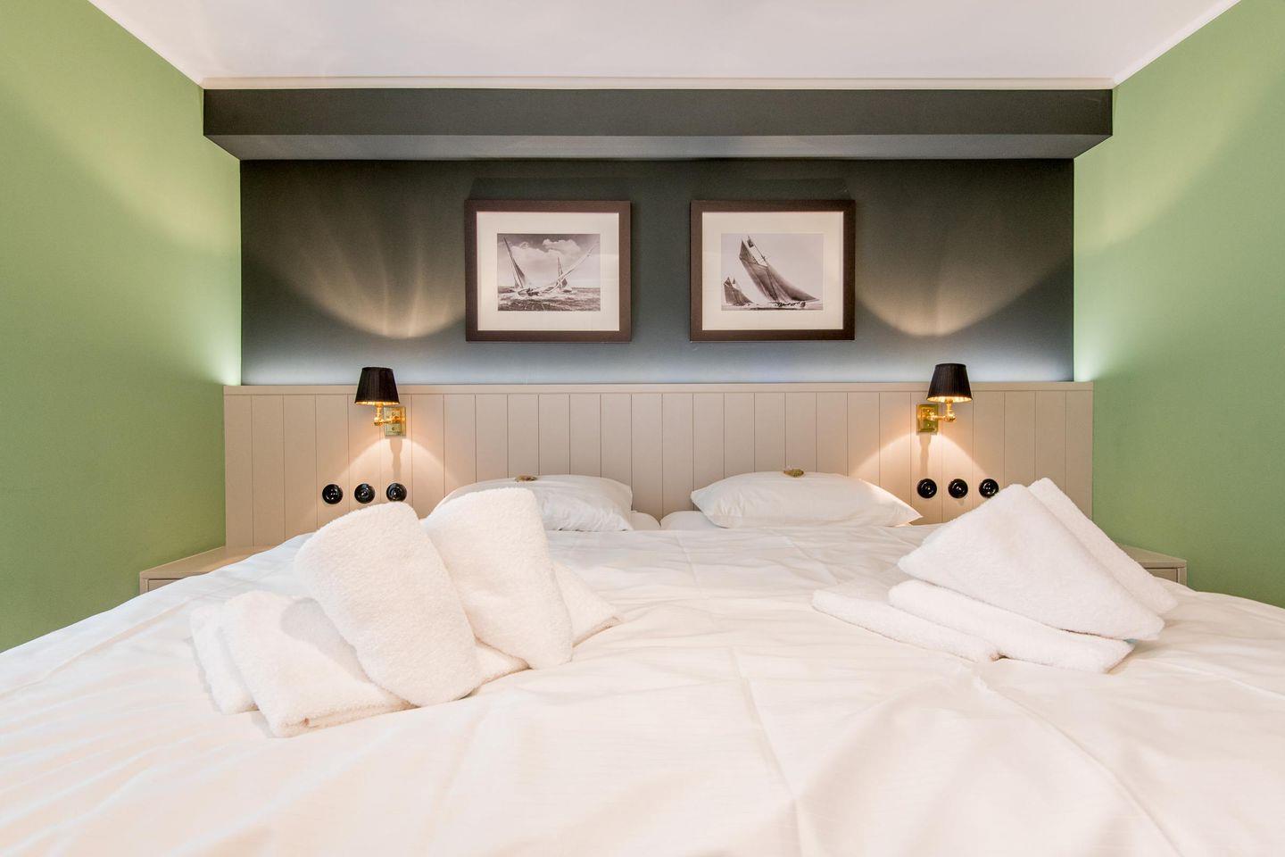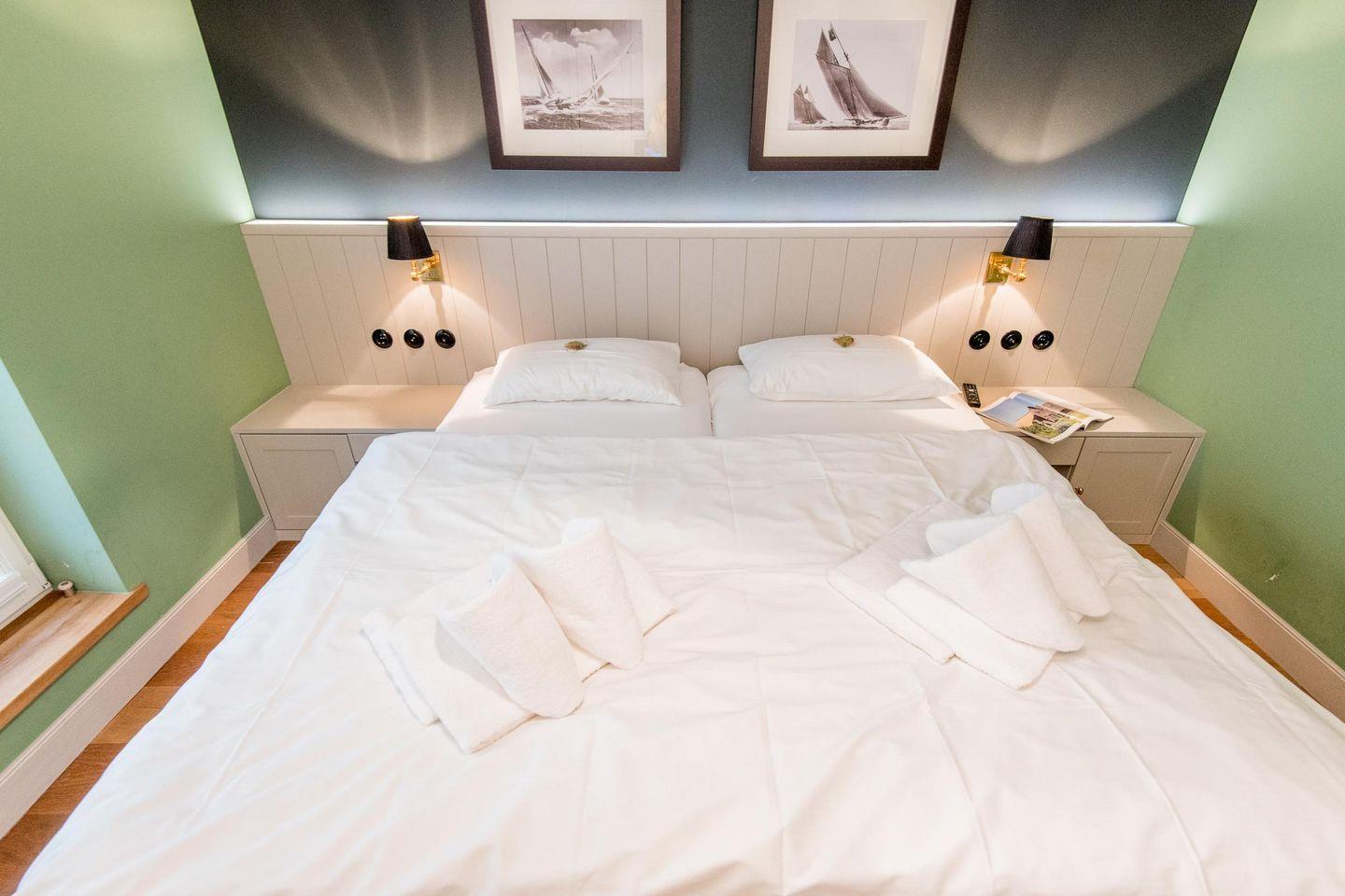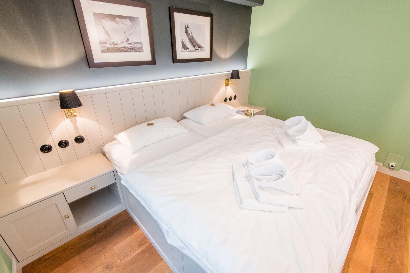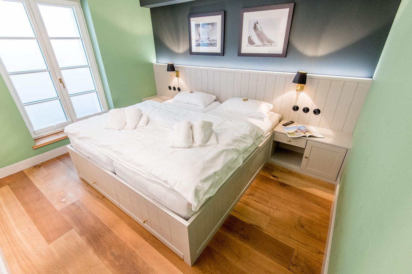 Das Schlafzimmer bietet ein komfortables Doppelbett (2x 90x200 cm) mit hochwertigen TEMPUR-Matratzen sowie einen Einbauschrank und einen TV für entspannte Stunden.