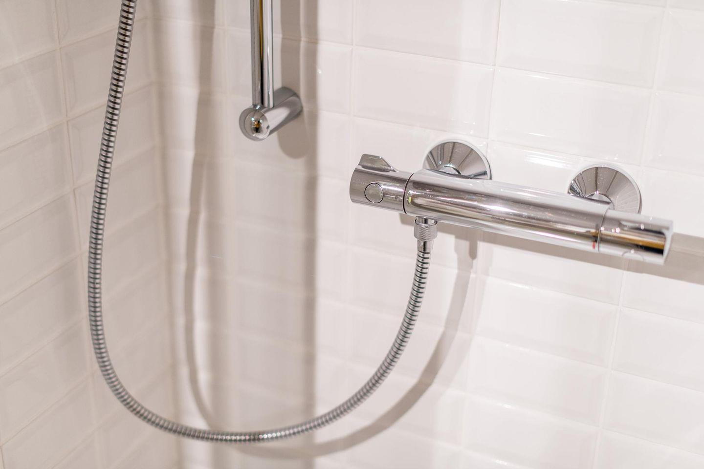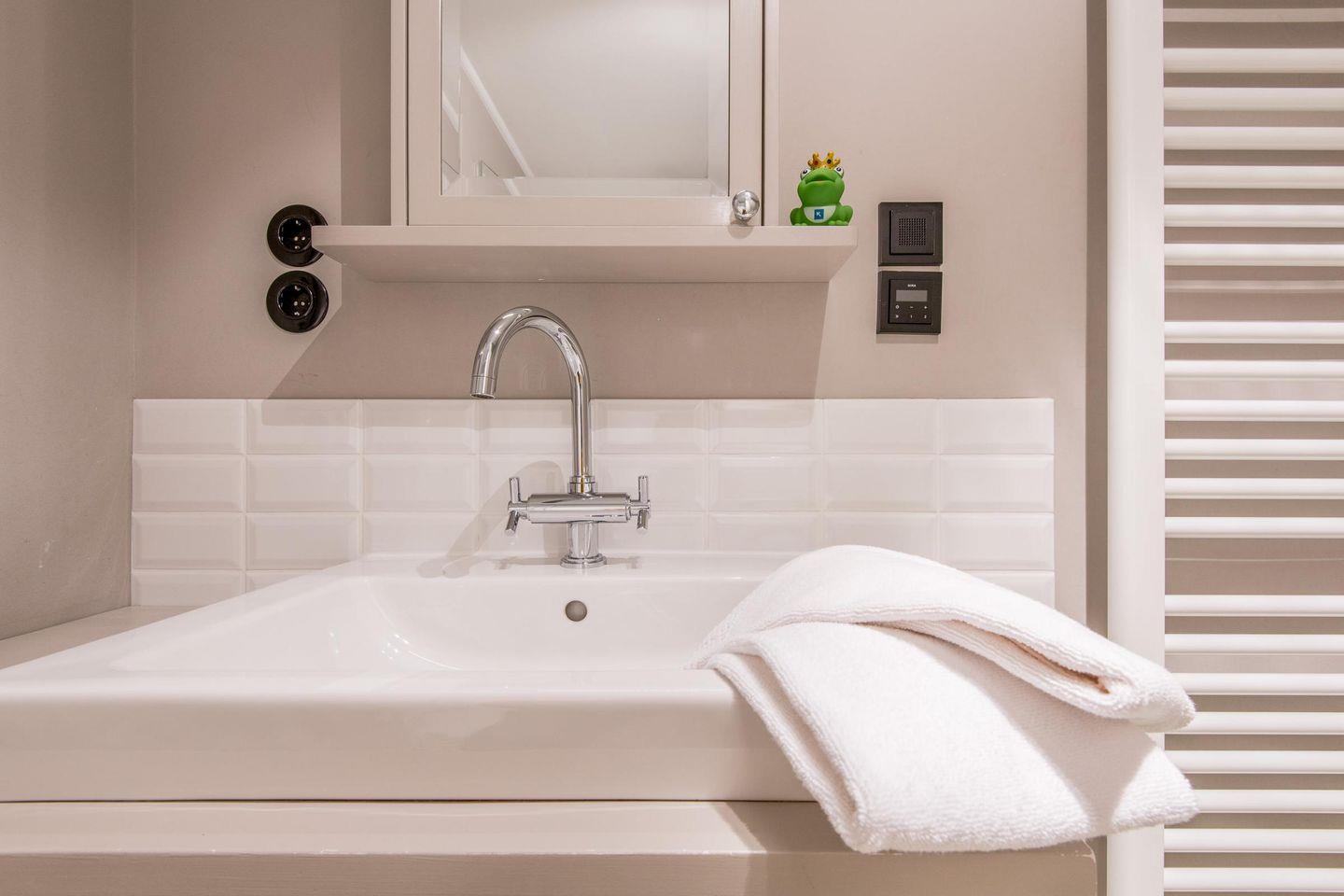 Das moderne Badezimmer ist mit einer ebenerdigen Dusche, WC und einem Handtuchwärmer ausgestattet und bietet alles, was Sie für einen erfrischenden Start in den Tag benötigen.