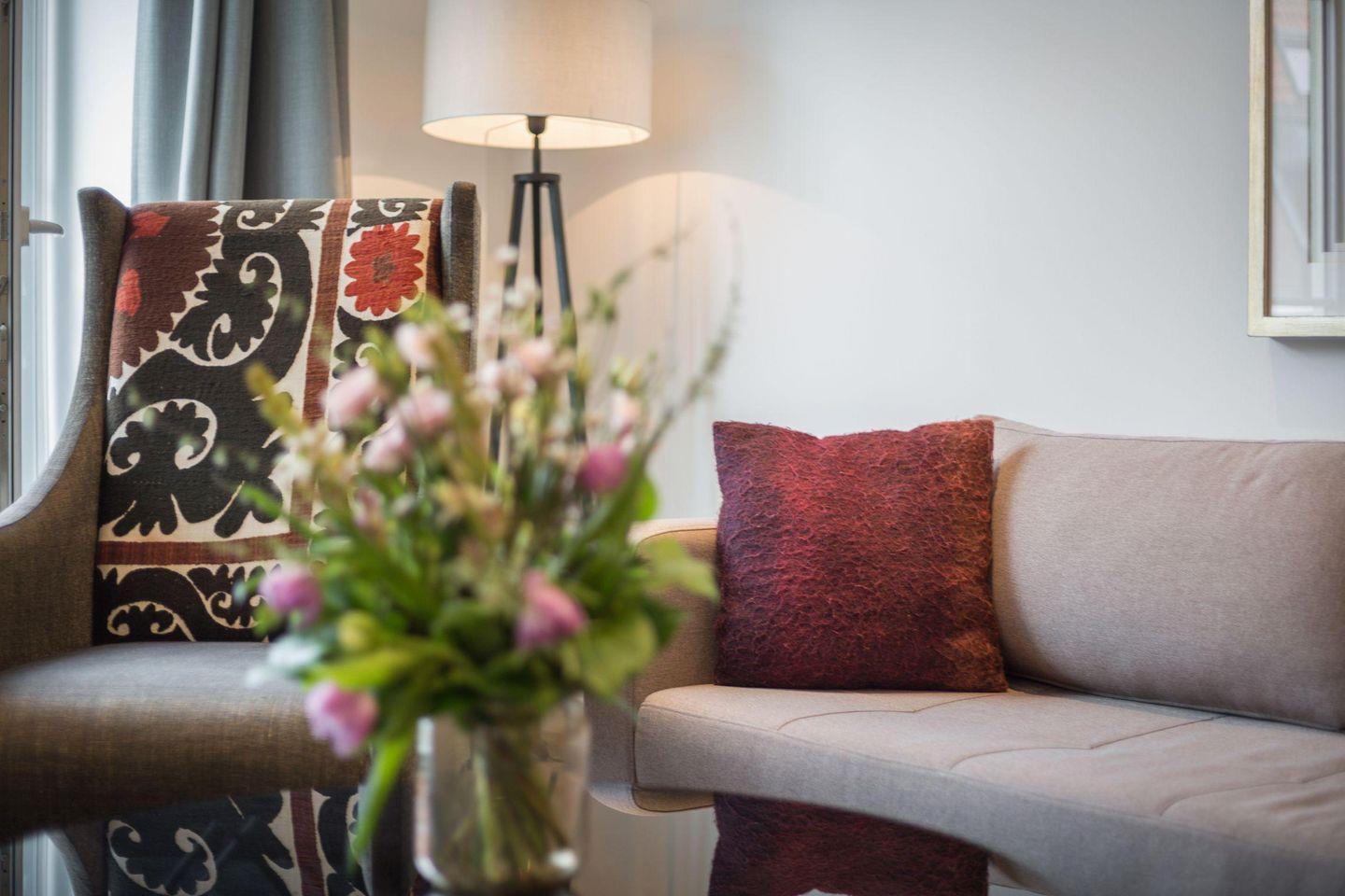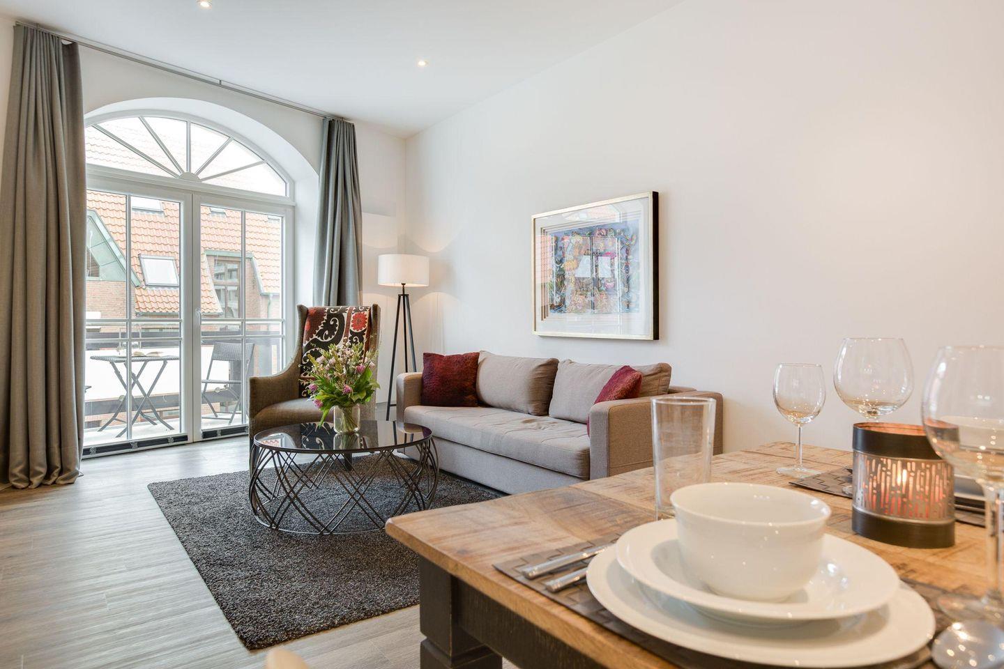 Die stilvolle 2-Zimmer-Ferienwohnung 'Charles' bietet auf ca. 53 m² im 2. Obergeschoss (mit Fahrstuhl) eine luxuriöse Unterkunft für bis zu 2 Personen. Das moderne Design der Wohnung, das in Zusammenarbeit mit der Kunstgalerie Mensing kreiert wurde, verleiht ihr eine besondere Note: Jeder Raum ist individuell in einem Retro-Look gestaltet und das Mobiliar stammt aus Frankreich, Belgien und England, was eine exklusive und einladende Atmosphäre schafft.