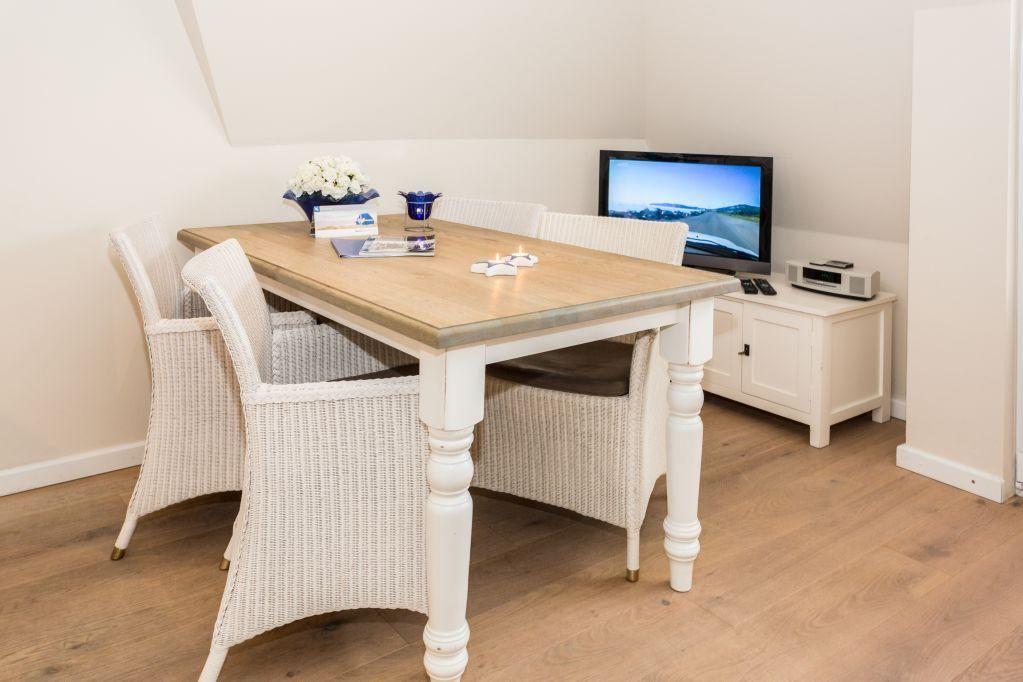 Das Wohnzimmer ist mit einem bequemen Sofa, einem Korbsessel, TV und einem Esstisch für 4 Personen ausgestattet. Der direkte Zugang zum möblierten Balkon nach Westen bietet viel Sonne und einen Platz zum Entspannen im Freien.