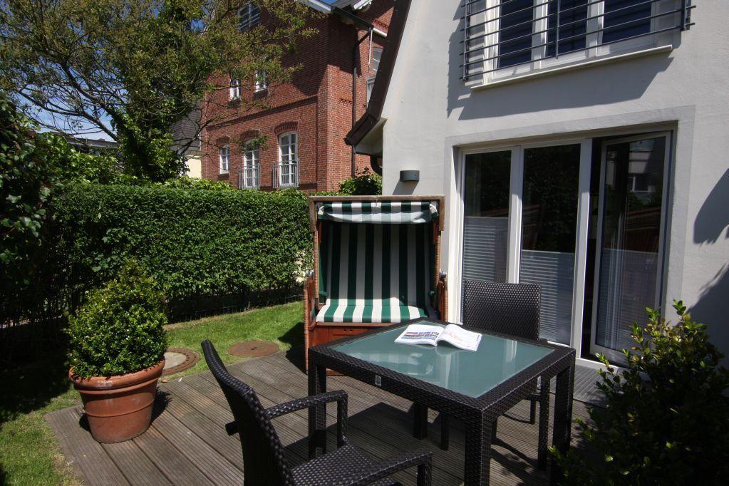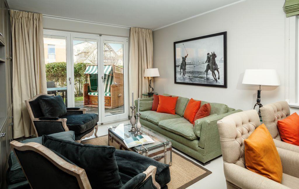 Das stilvoll eingerichtete Wohnzimmer verfügt über ein gemütliches Sofa, Sessel, einen modernen TV sowie einen Esstisch für 4 Personen. Von hier aus haben Sie direkten Zugang zur möblierten Terrasse nach Westen, die mit einem Strandkorb ausgestattet ist – perfekt, um die Abendsonne zu genießen.