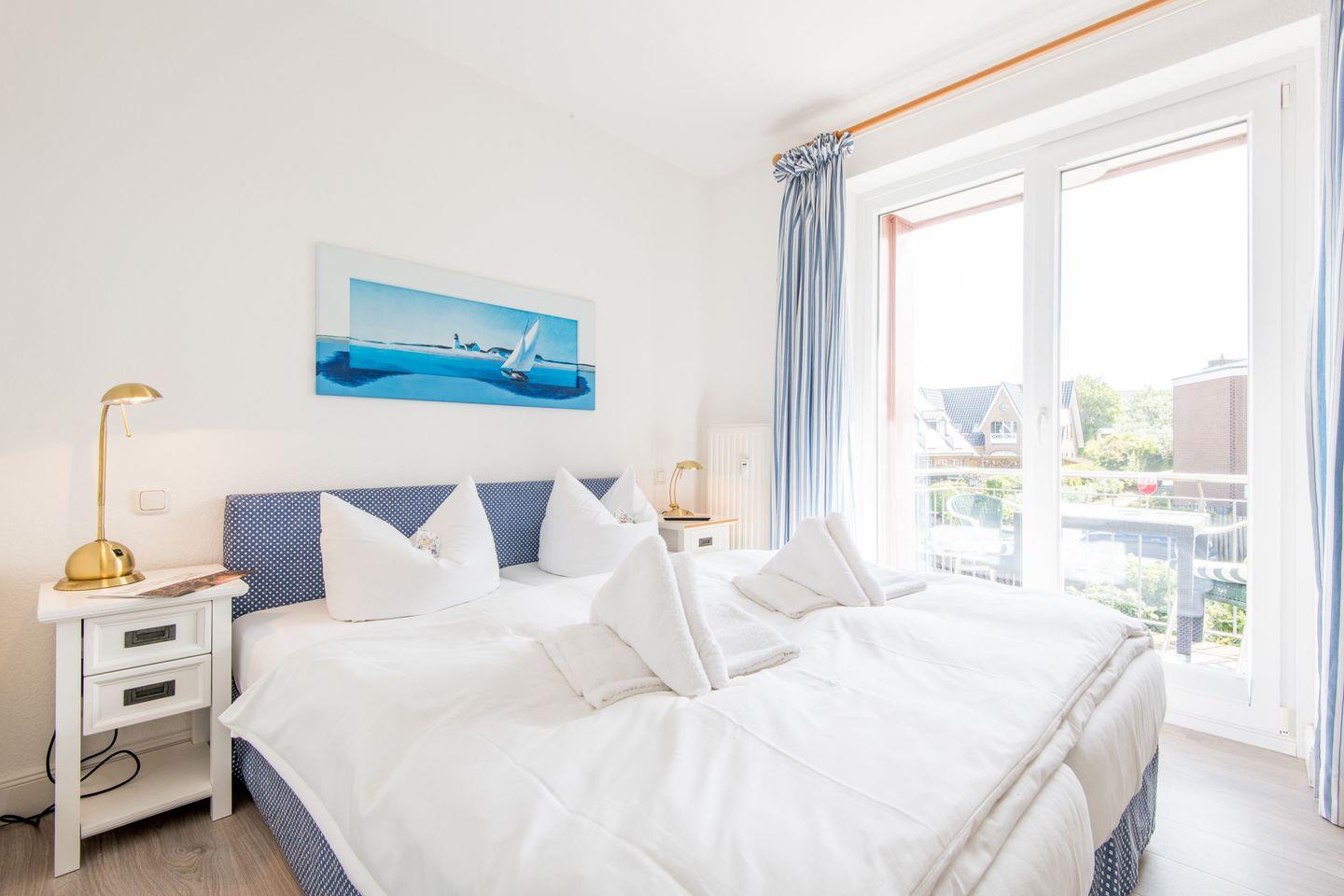 Das Schlafzimmer ist mit einem Doppelbett (2x 80x200 cm) und einem großzügigen Kleiderschrank ausgestattet und bietet direkten Zugang zum möblierten Balkon nach Osten – perfekt, um den Morgen gemütlich zu beginnen.