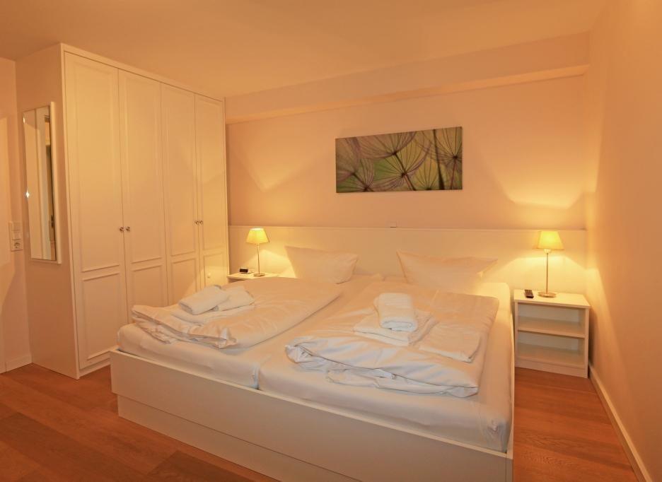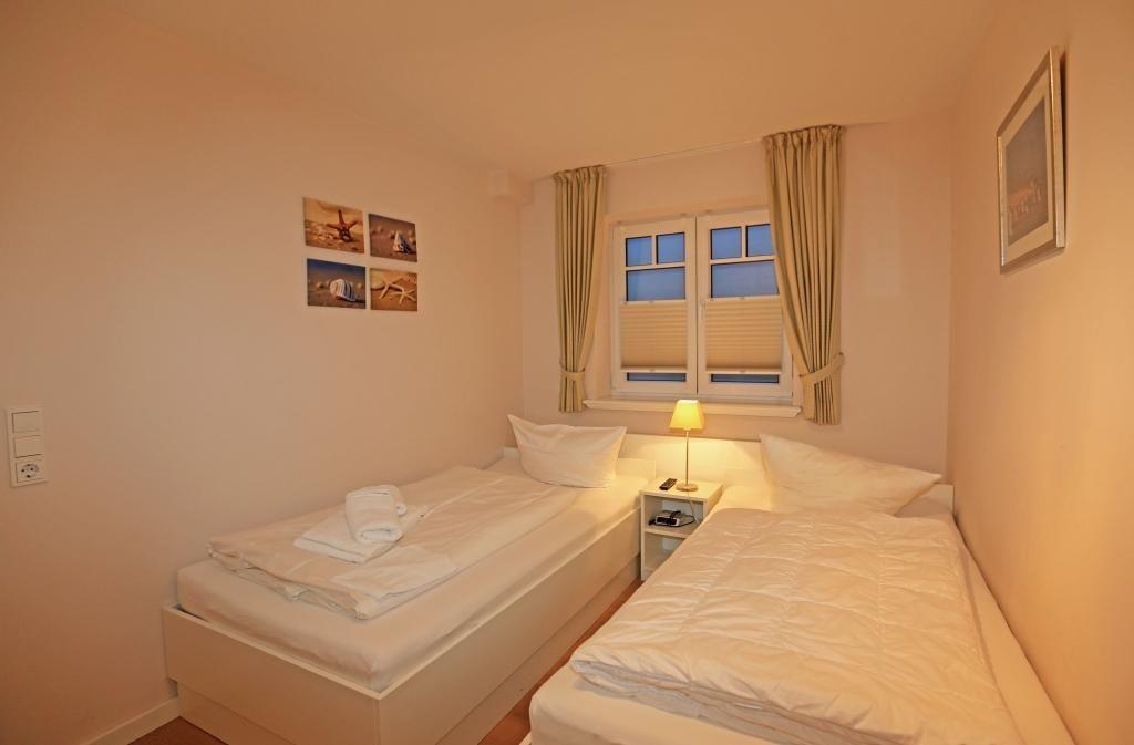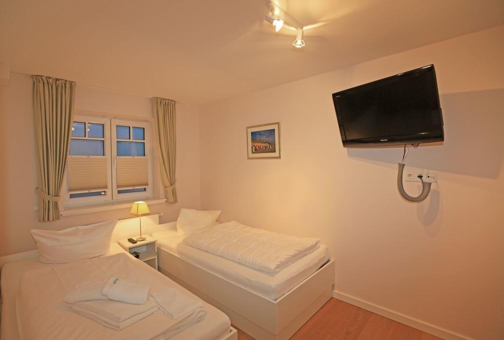 Das erste Schlafzimmer verfügt über ein großes Doppelbett (2x 100x200 cm), zwei Stühle, einen Einbauschrank und einen TV. Es ist en Suite mit dem ersten Badezimmer, das eine ebenerdige Dusche, WC und Handtuchwärmer bietet. Das zweite Schlafzimmer ist mit zwei komfortablen Einzelbetten (je 100x200 cm), zwei Stühlen, einem Einbauschrank und einem TV ausgestattet.