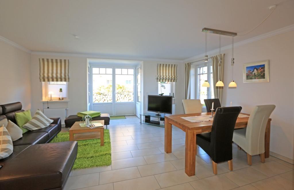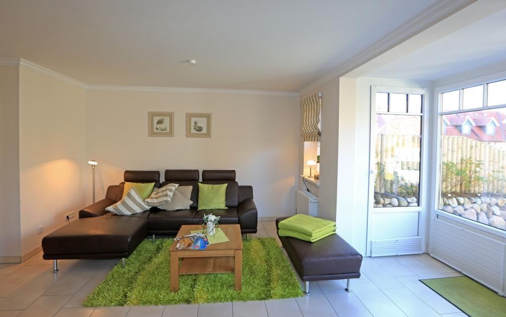 Das Wohnzimmer ist mit einem Ecksofa, einem Esstisch mit 5 Stühlen und einem extra-großen TV ausgestattet. Der direkte Zugang zur möblierten Gartenterrasse nach Westen mit Strandkorb lädt zum Verweilen und Genießen der Abendsonne ein.