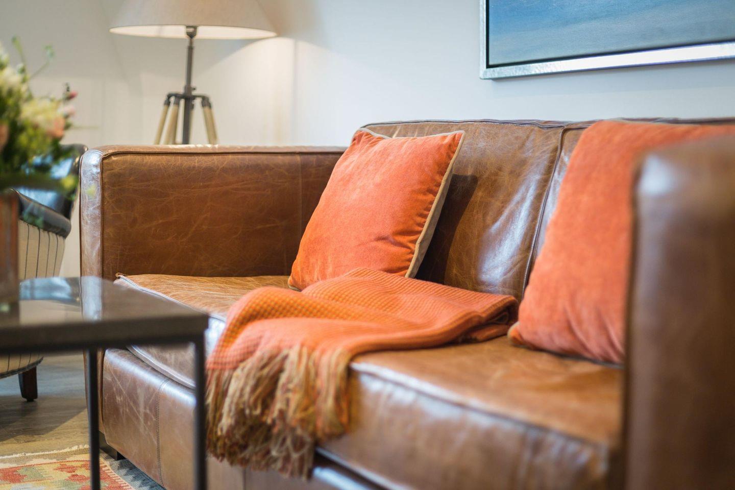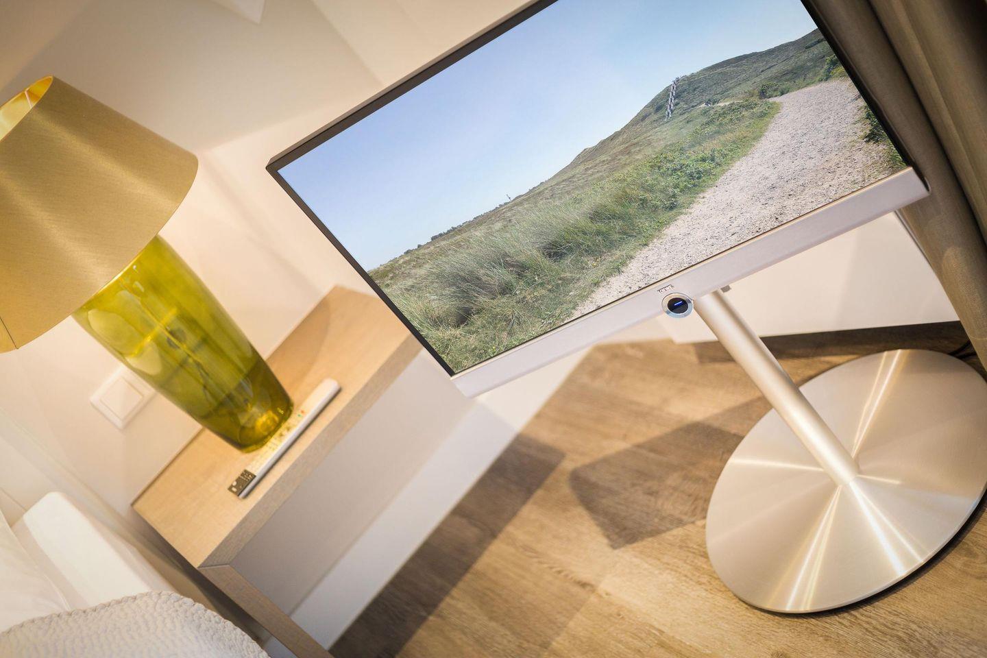 Im kombinierten Wohn- und Schlafbereich erwartet Sie ein komfortables Doppelbett (2x 90x200 cm), ein Sofa und ein gemütlicher Sessel, die für angenehme Abende mit TV bereitstehen. Die Einrichtung bietet stilvollen Komfort und schafft eine warme, einladende Atmosphäre.