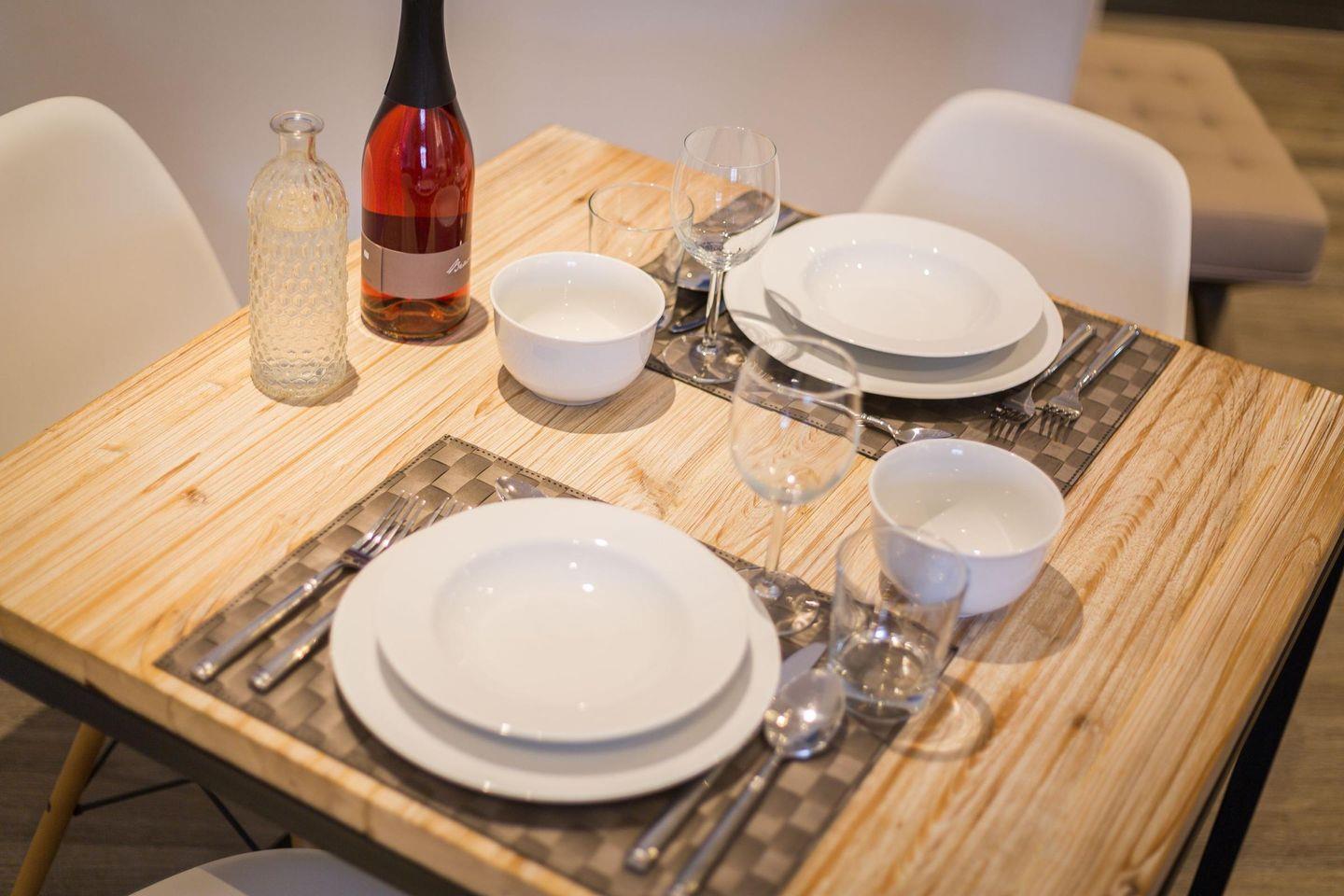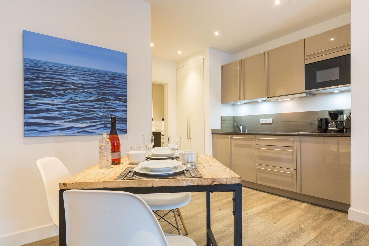 Die offene Küche ist mit einer Filterkaffeemaschine und allen modernen Annehmlichkeiten ausgestattet, um Ihnen das Kochen zu erleichtern. Der Esstisch mit drei Stühlen bietet Platz für entspannte Mahlzeiten.