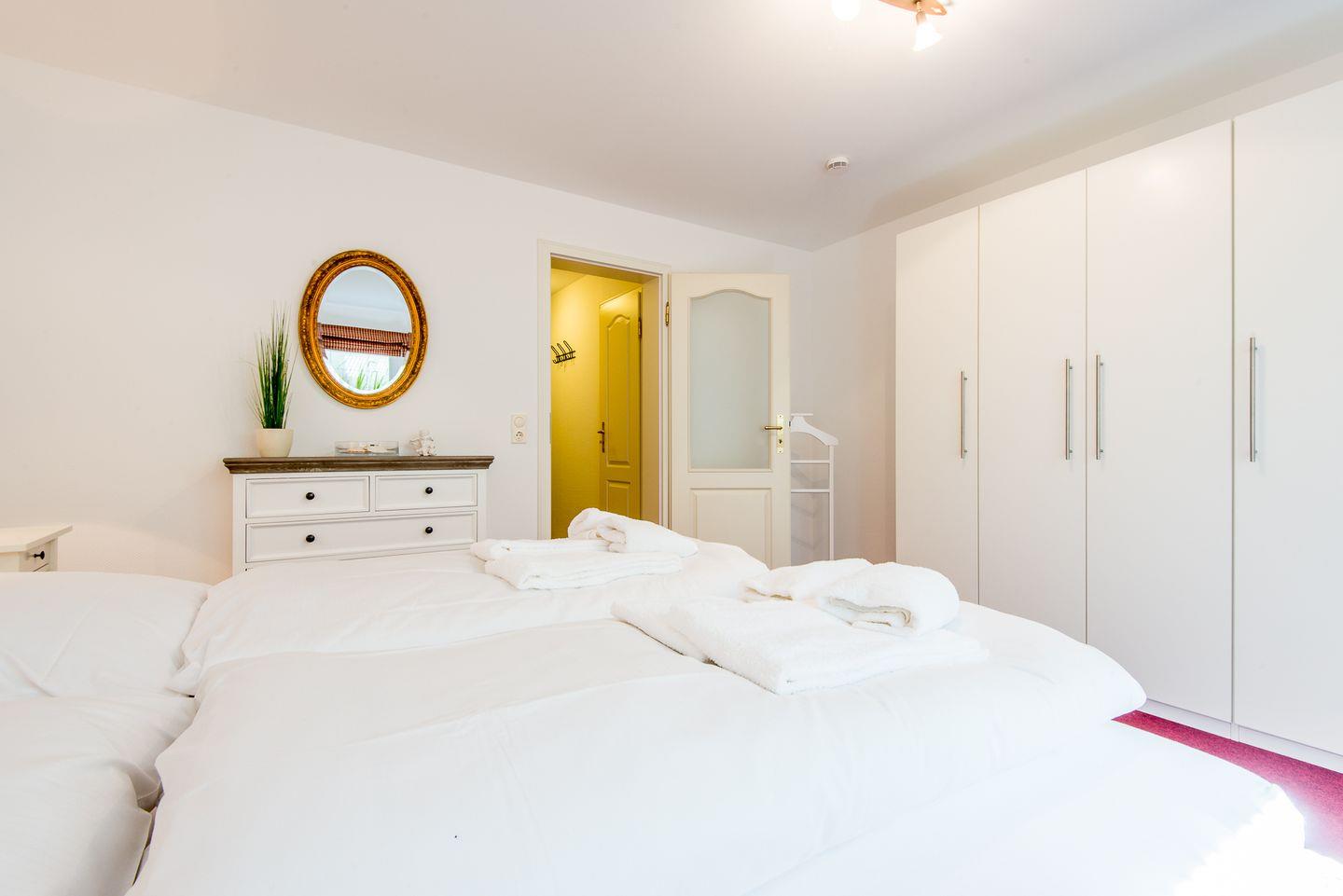 Das Schlafzimmer ist mit einem komfortablen Doppelbett (2x 90x200 cm), einem Kleiderschrank und einer Vitrine eingerichtet, um Ihnen genügend Stauraum zu bieten. Das moderne Badezimmer verfügt über eine Dusche, ein WC, einen Föhn und Tageslicht – ideal für einen erfrischenden Start in den Tag.