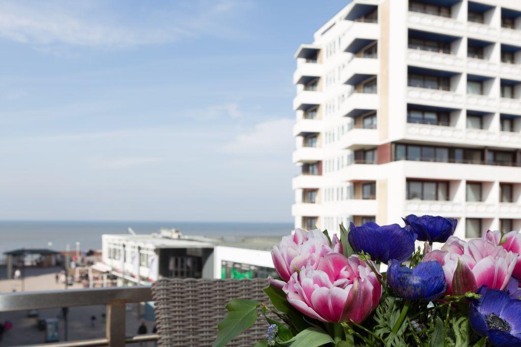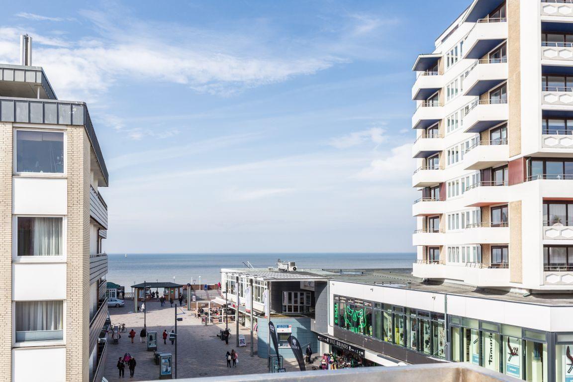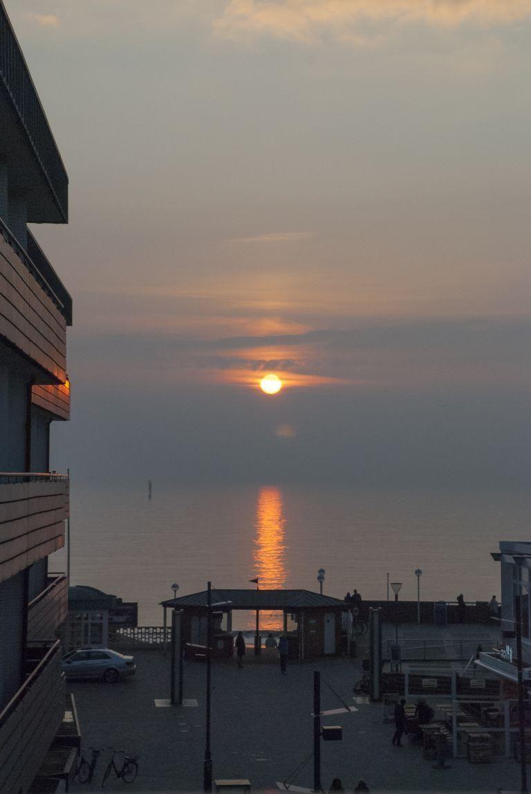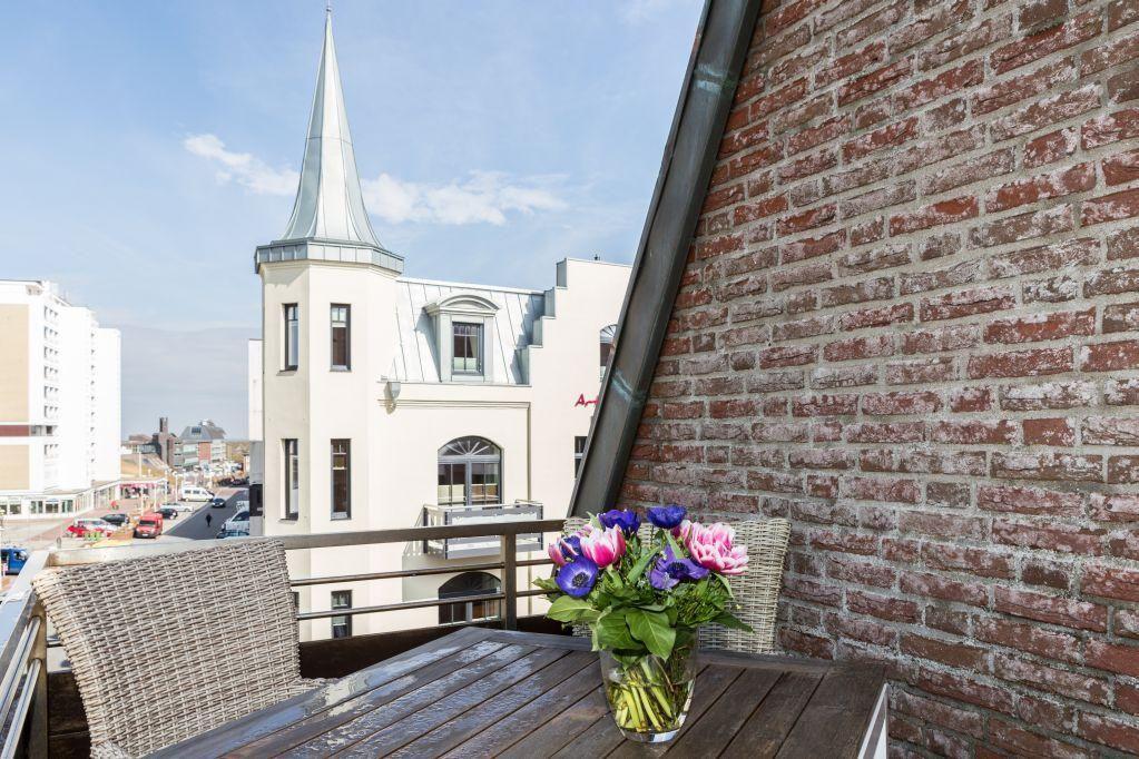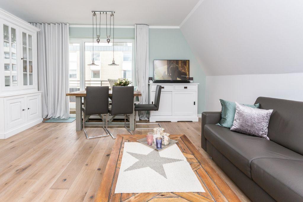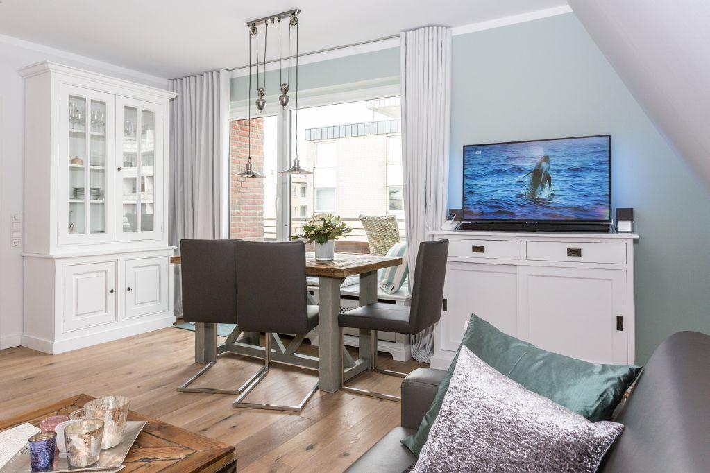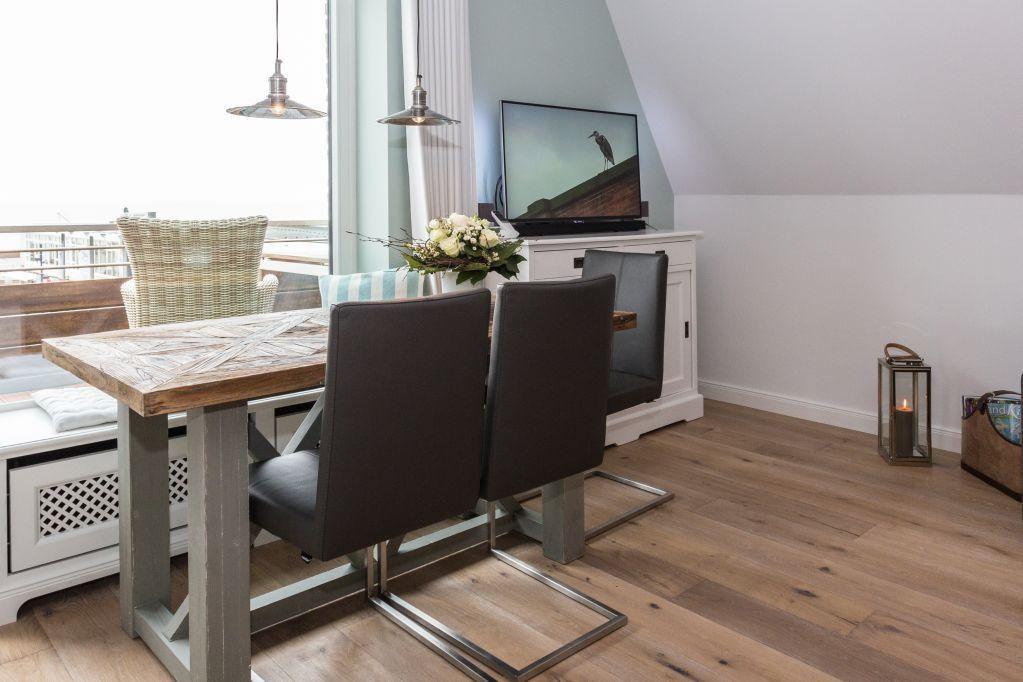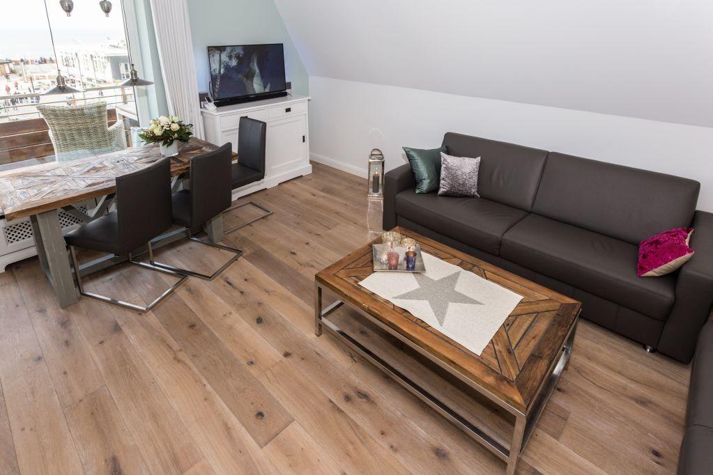 Das lichtdurchflutete Wohnzimmer mit zwei Ledersofas, eines davon mit Schlaffunktion (160x200 cm), bietet Ihnen phantastische Ausblicke auf die Friedrichstraße und das Meer. Genießen Sie den Abend bei einem Film auf dem LED-Flachbild-TV oder entspannen Sie bei einem Glas Wein auf dem 11 qm großen Westbalkon und erleben Sie den Sonnenuntergang über der Nordsee. Der Esstisch bietet Platz für gemeinsame Mahlzeiten mit herrlichem Ausblick.