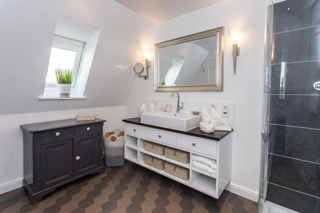 Das stilvolle Badezimmer bietet eine großzügige Dusche, ein WC, einen Handtuchwärmer, einen Kosmetikspiegel und Tageslicht – ideal für einen erfrischenden Start in den Tag.