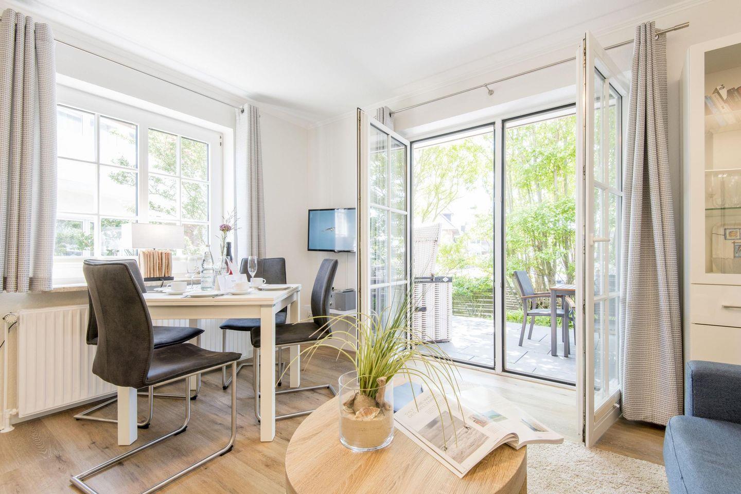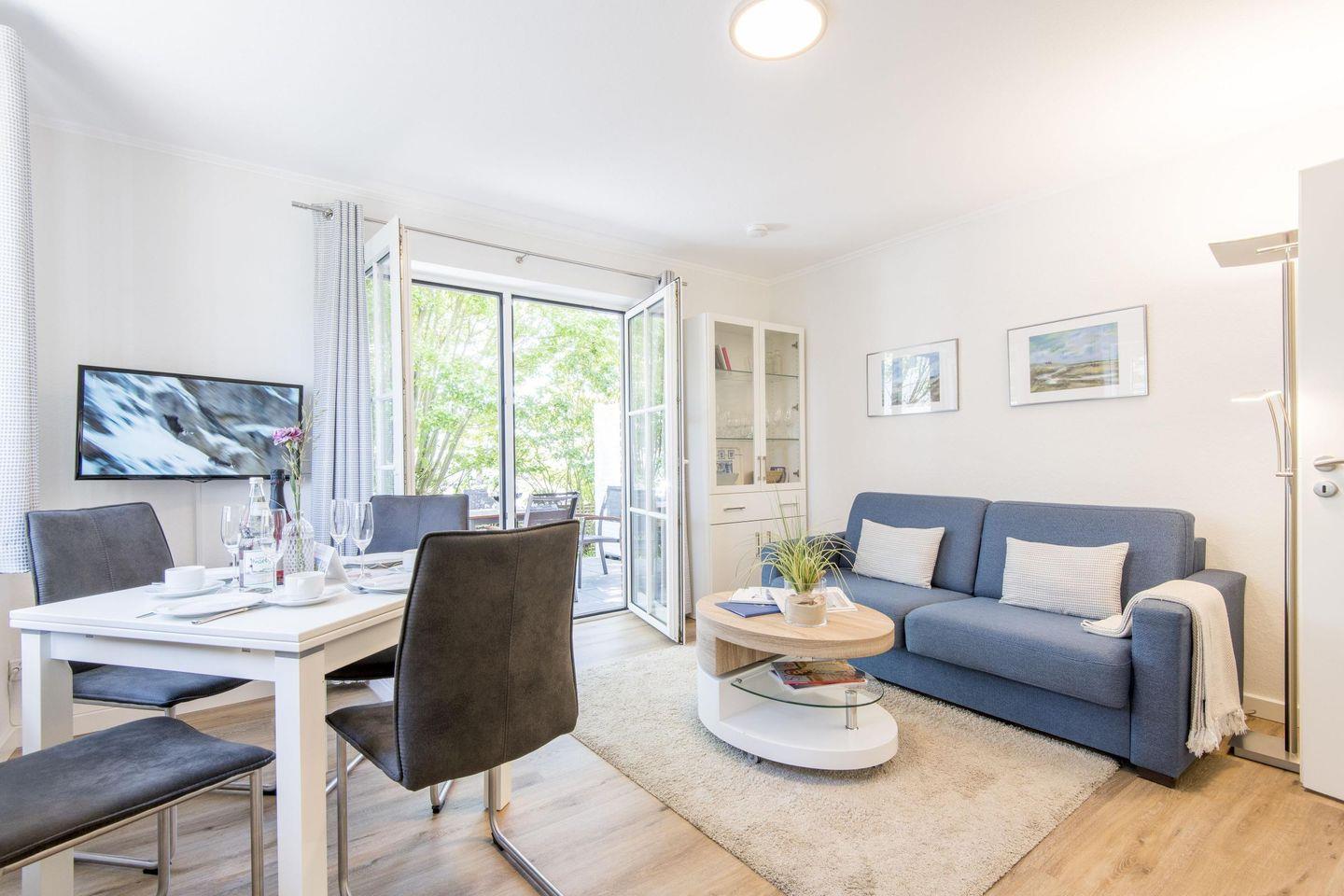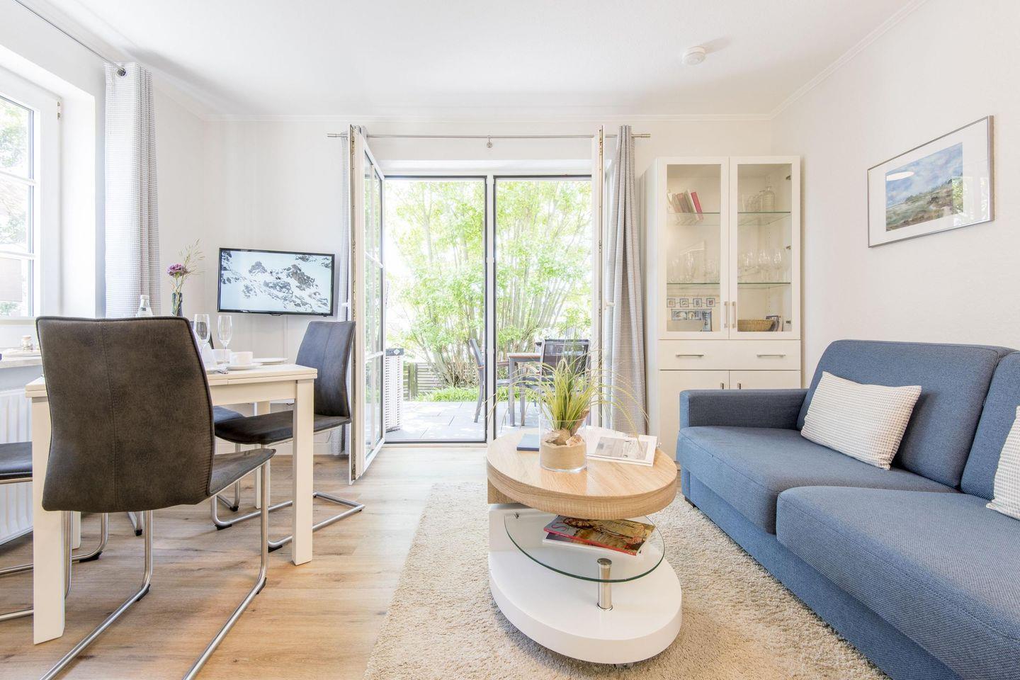 Das Wohnzimmer ist einladend gestaltet und mit einem ausziehbaren Schlafsofa (160x190 cm), einem Korbsessel, einem TV und einem Esstisch für 4 Personen ausgestattet. Von hier aus haben Sie direkten Zugang zur möblierten Süd-Terrasse mit eigenem Strandkorb, wo Sie die Sonne genießen können.