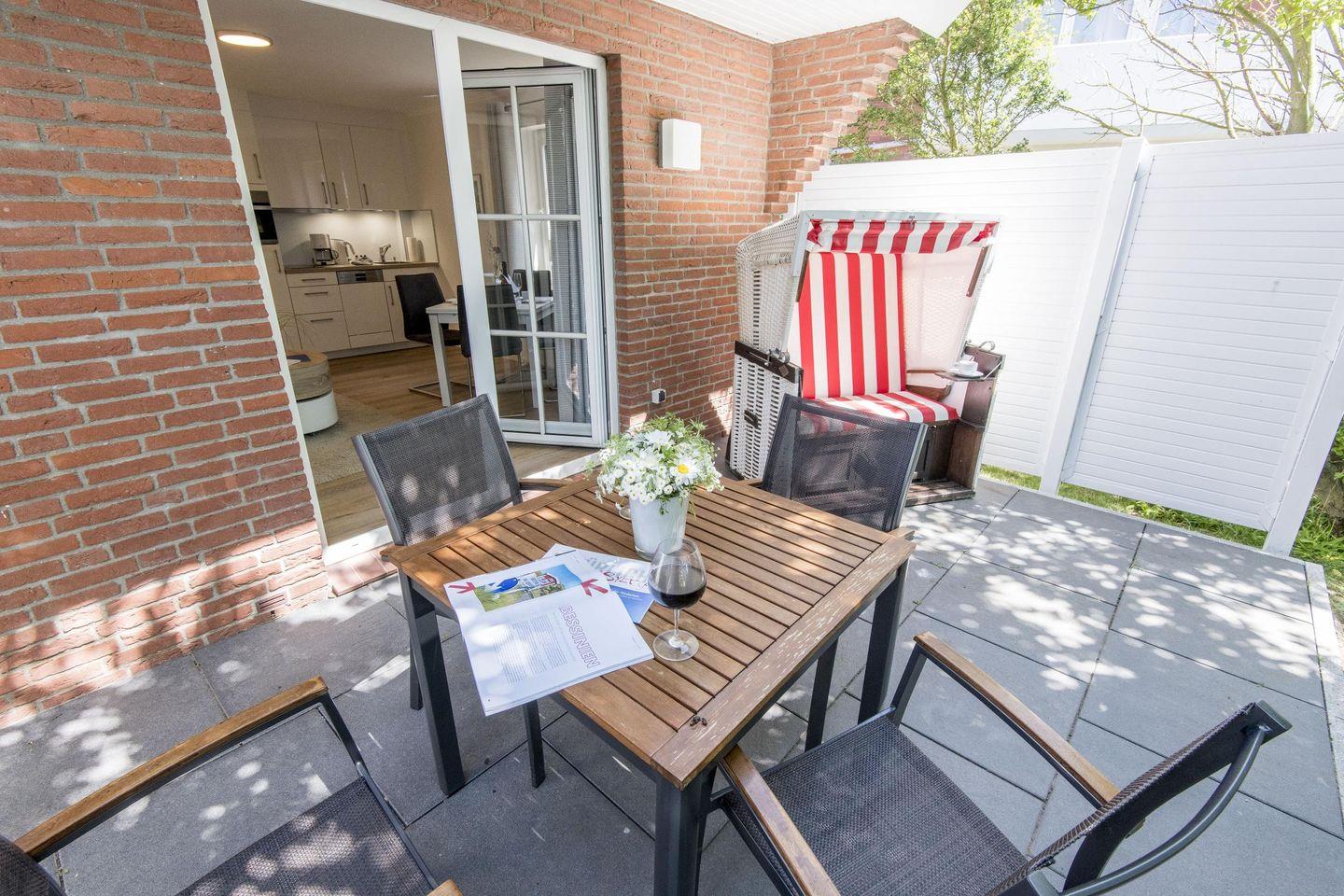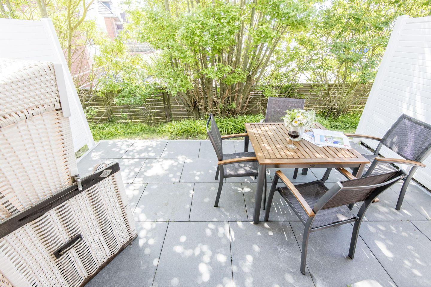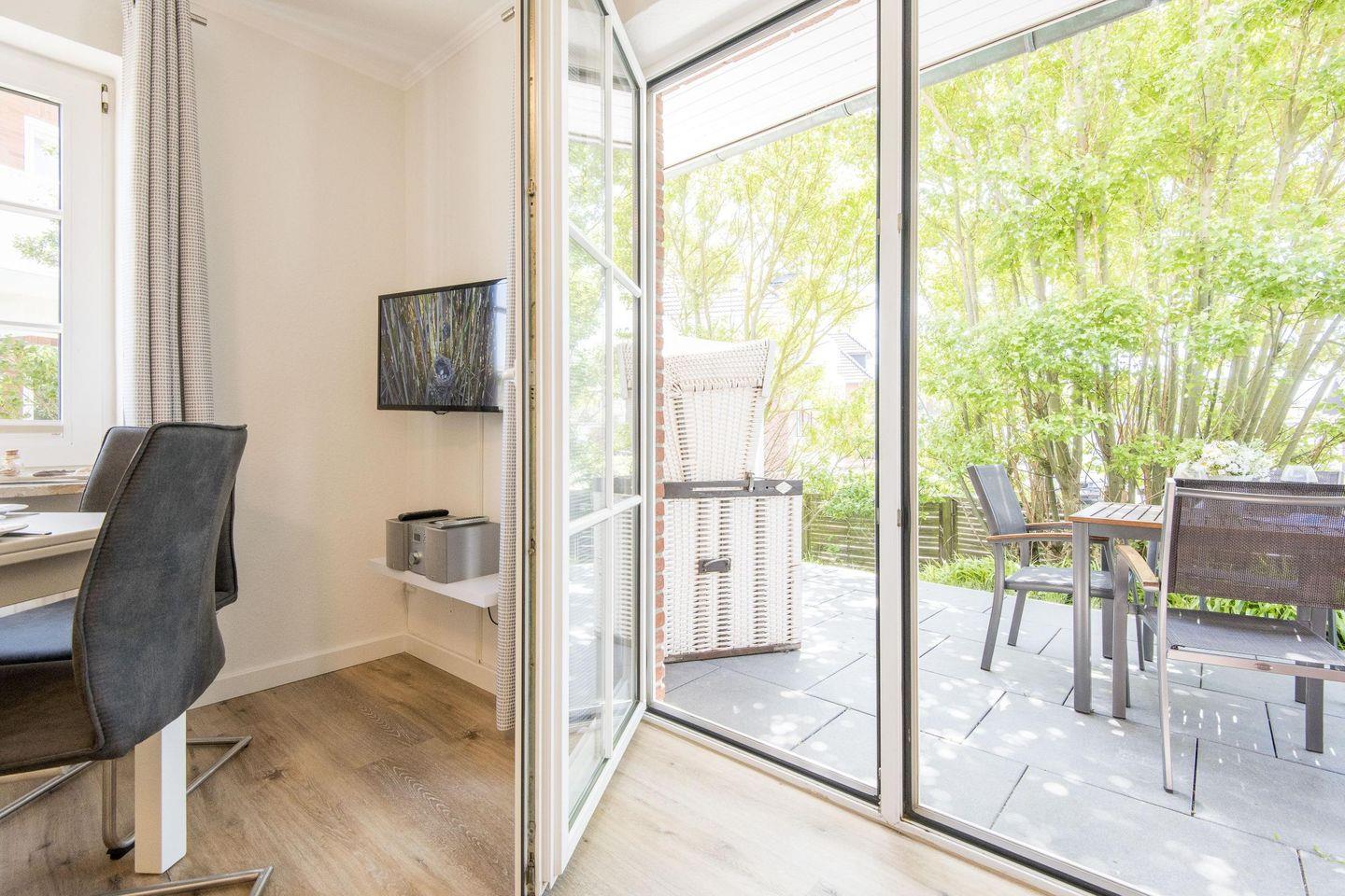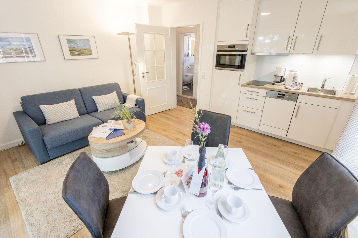 Das Wohnzimmer ist einladend gestaltet und mit einem ausziehbaren Schlafsofa (160x190 cm), einem Korbsessel, einem TV und einem Esstisch für 4 Personen ausgestattet. Von hier aus haben Sie direkten Zugang zur möblierten Süd-Terrasse mit eigenem Strandkorb, wo Sie die Sonne genießen können.