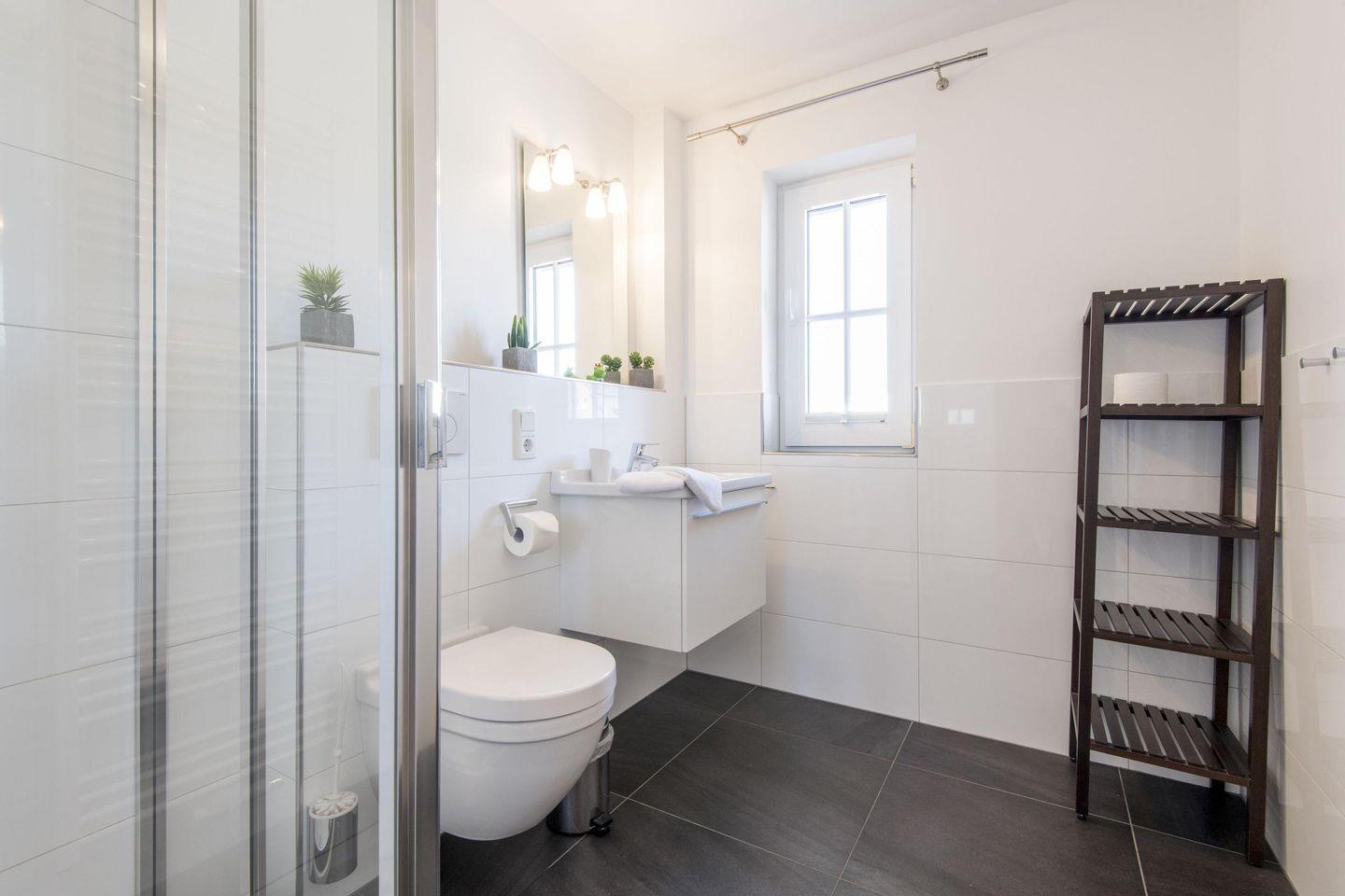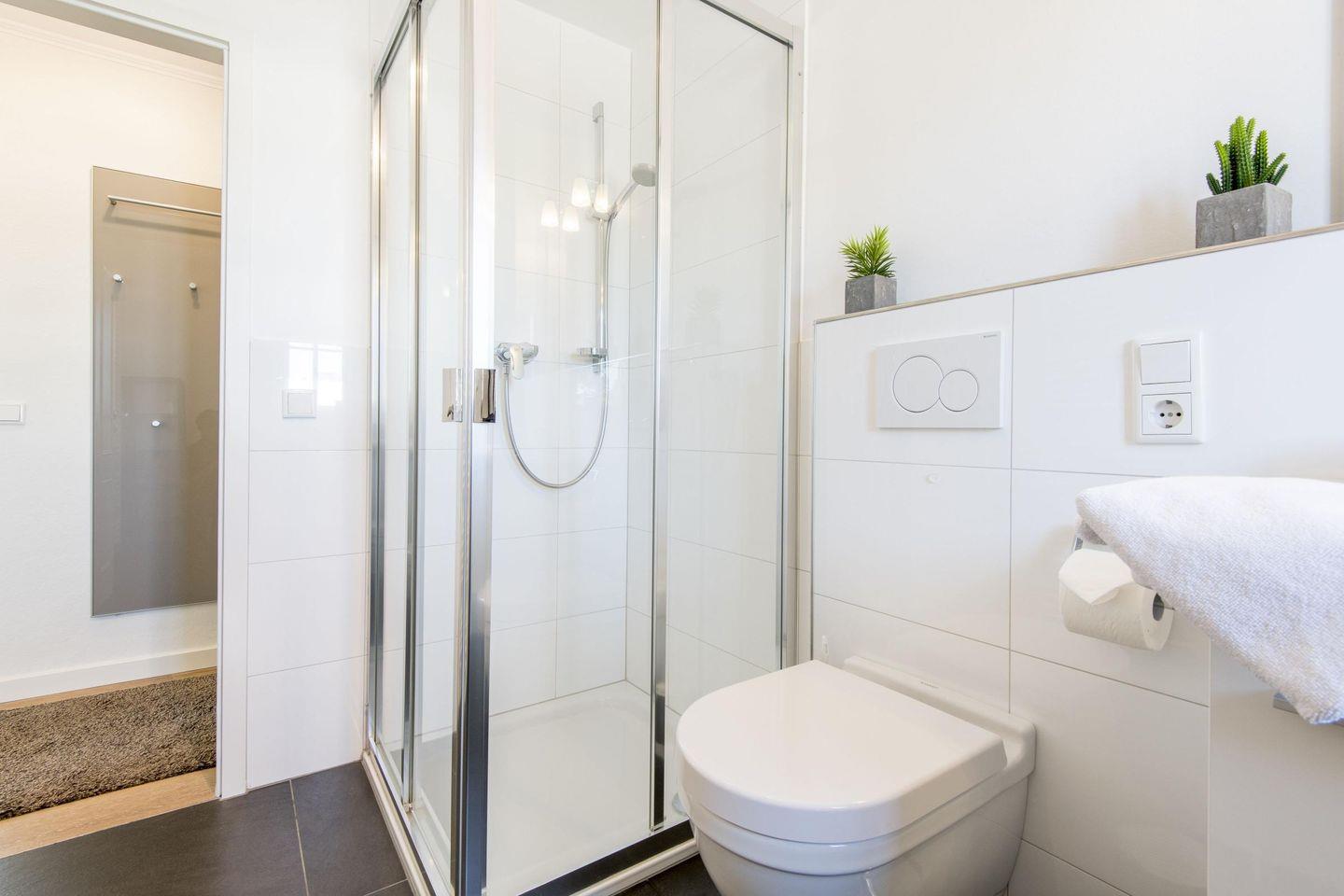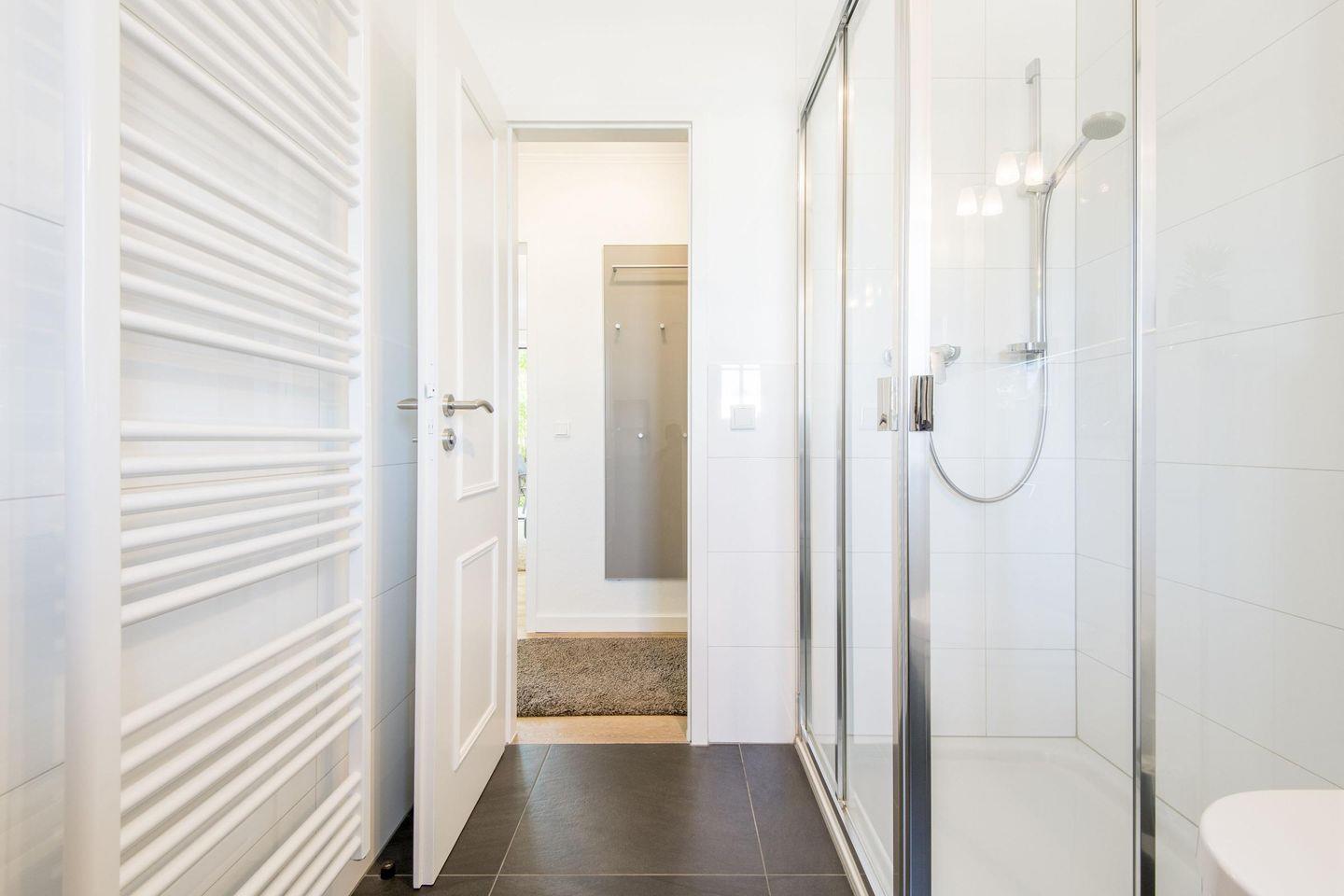 Das Badezimmer verfügt über eine Dusche, ein WC, einen Handtuchwärmer, einen Föhn und Tageslicht, was eine freundliche Atmosphäre schafft.