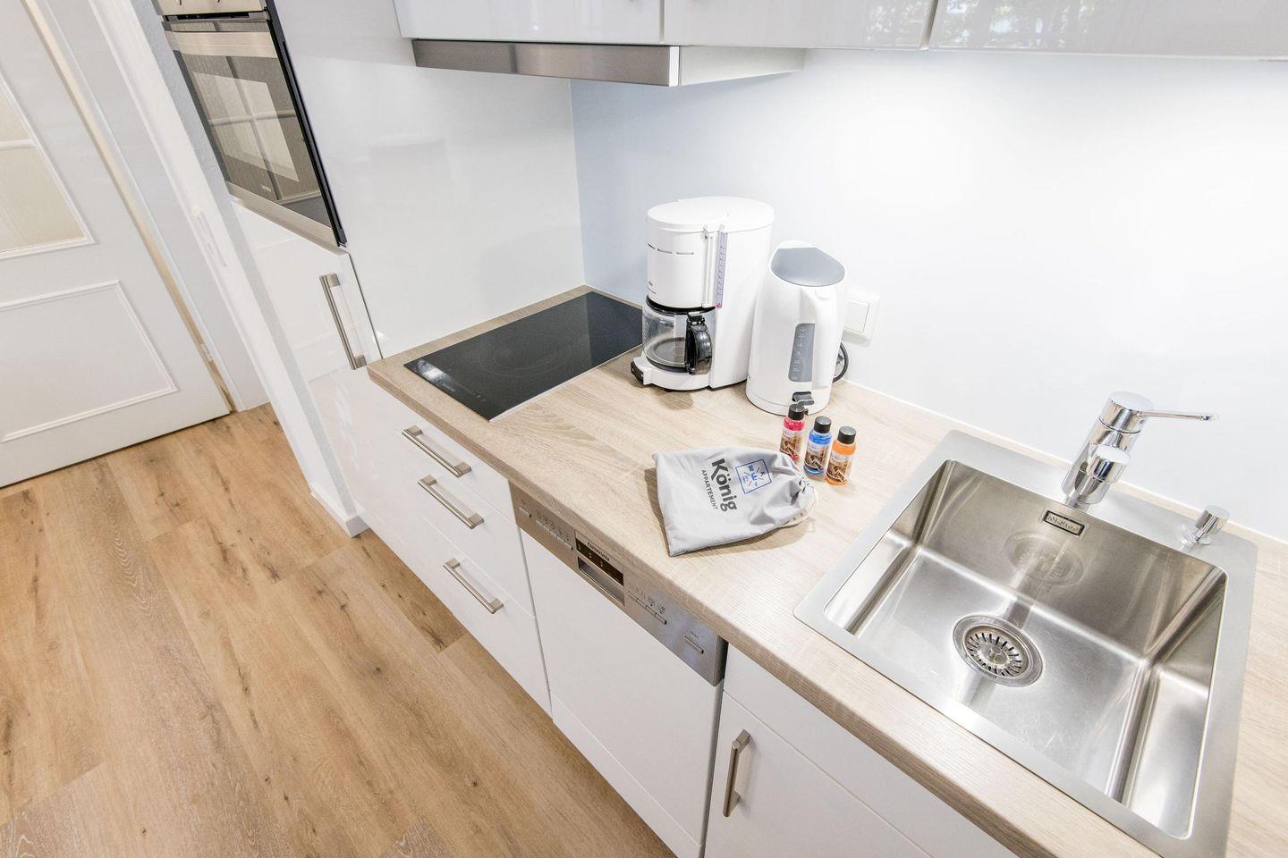 Die offene Küche ist mit einem 4-flammigen Herd, einem Geschirrspüler und weiteren notwendigen Geräten und Utensilien ausgestattet, um das Kochen und Essen im Urlaub einfach und angenehm zu gestalten.