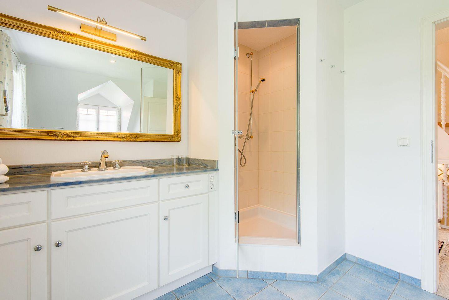 Das elegante Badezimmer ist mit einer Badewanne, Dusche, WC, Föhn und Tageslicht ausgestattet und begeistert durch hochwertige, originale englische Badmöbel und Armaturen. Das Gäste-WC im Eingangsbereich ist ebenso stilvoll eingerichtet und bietet eine praktische Garderobe.