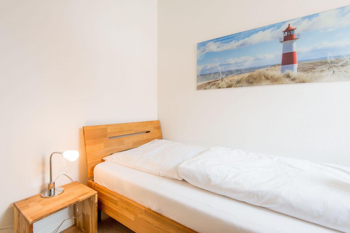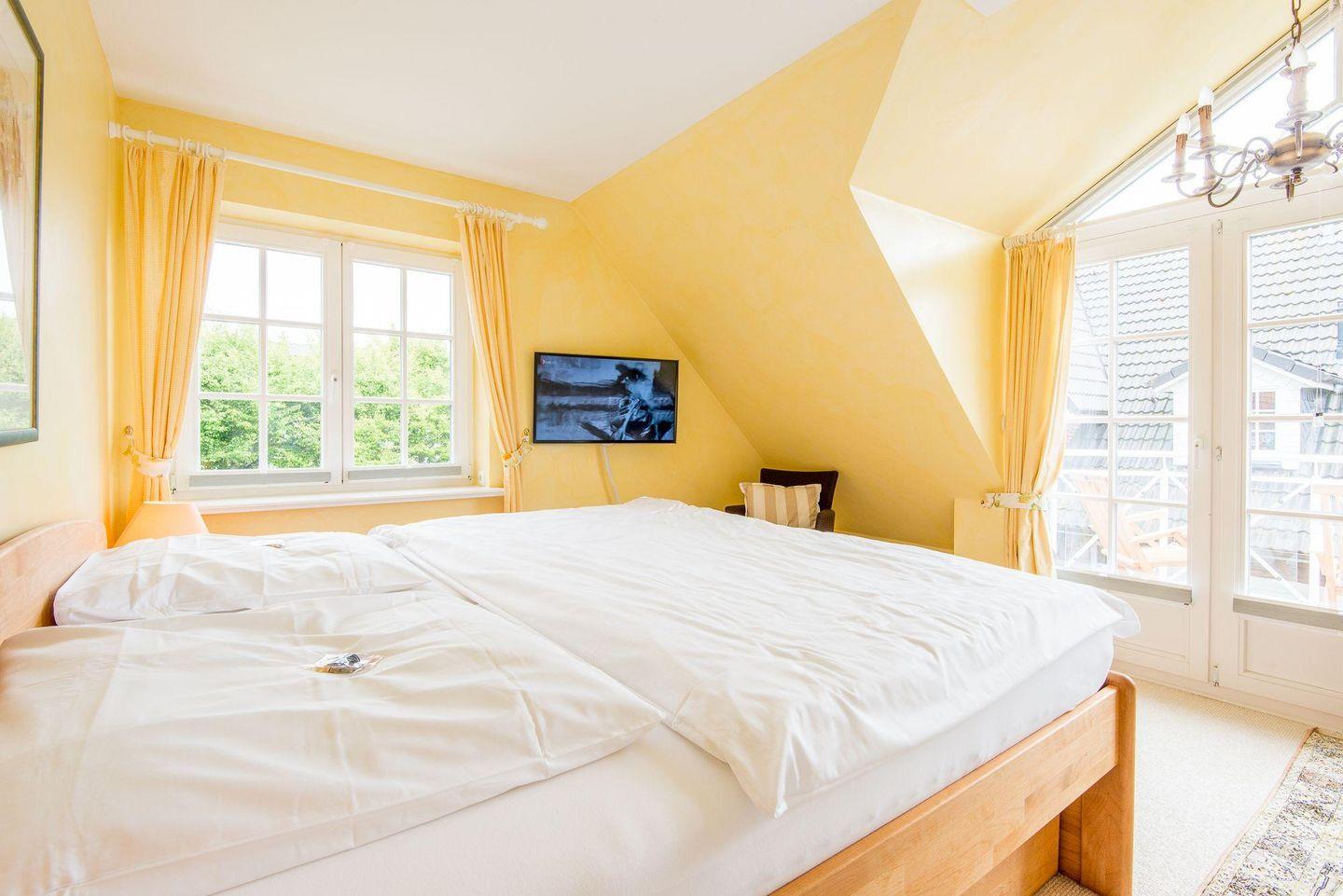 Das erste Schlafzimmer ist mit einem komfortablen Doppelbett (2x100x200 cm) ausgestattet und verfügt über einen TV sowie direkten Zugang zum sonnigen Balkon nach Süden. Das zweite Schlafzimmer bietet ein Einzelbett (90x200 cm), ideal für eine erholsame Nachtruhe. Im dritten Schlafzimmer befinden sich zwei gemütliche Einzelbetten (je 90x200 cm), die besonders für Kinder geeignet sind und eine wohnliche Rückzugsmöglichkeit bieten.