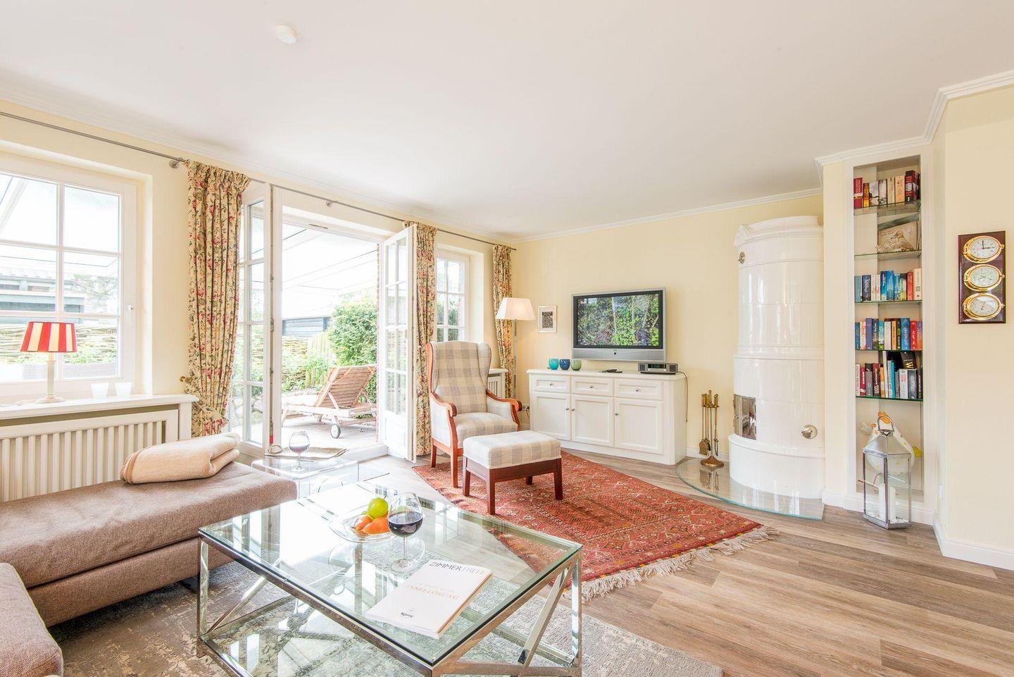Im stilvoll eingerichteten Wohnzimmer erwarten Sie ein großzügiges Ecksofa, ein Sessel sowie ein original schwedischer Kachelofen für gemütliche Abende. Der einladende Esstisch mit vier Stühlen bietet Platz für gemeinsame Mahlzeiten, und der TV sorgt für Unterhaltung. Der direkte Zugang führt Sie zum Garten, zur Terrasse nach Osten sowie zur möblierten und überdachten Terrasse nach Süden.