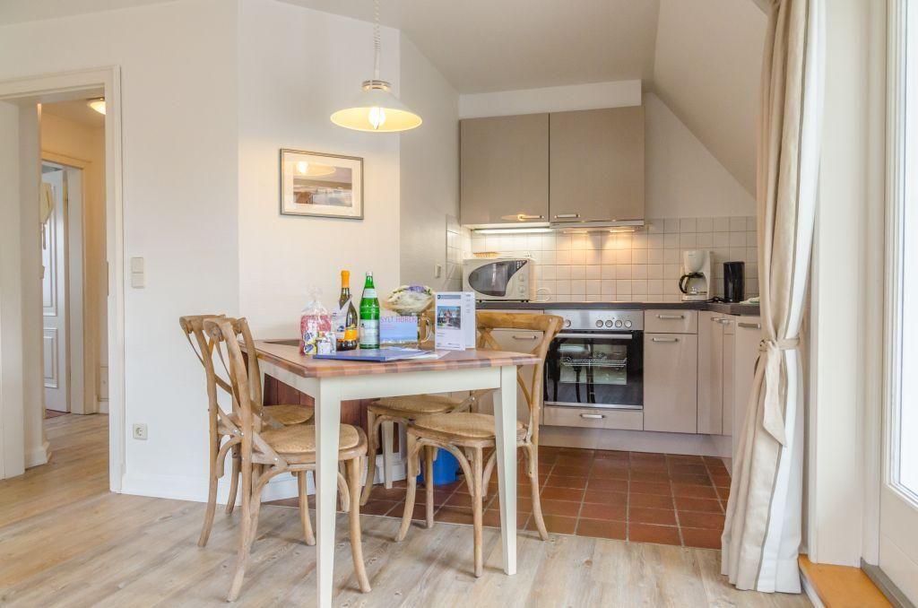 Das Wohn- und Esszimmer ist liebevoll eingerichtet und bietet ein Sofa für zwei Personen, einen Sessel, TV und einen Esstisch mit Platz für vier Personen. Vom Wohnzimmer aus gelangen Sie direkt auf den sonnigen Westbalkon, der mit Gartenmöbeln ausgestattet ist und sich hervorragend zum Genießen der Abendsonne eignet.