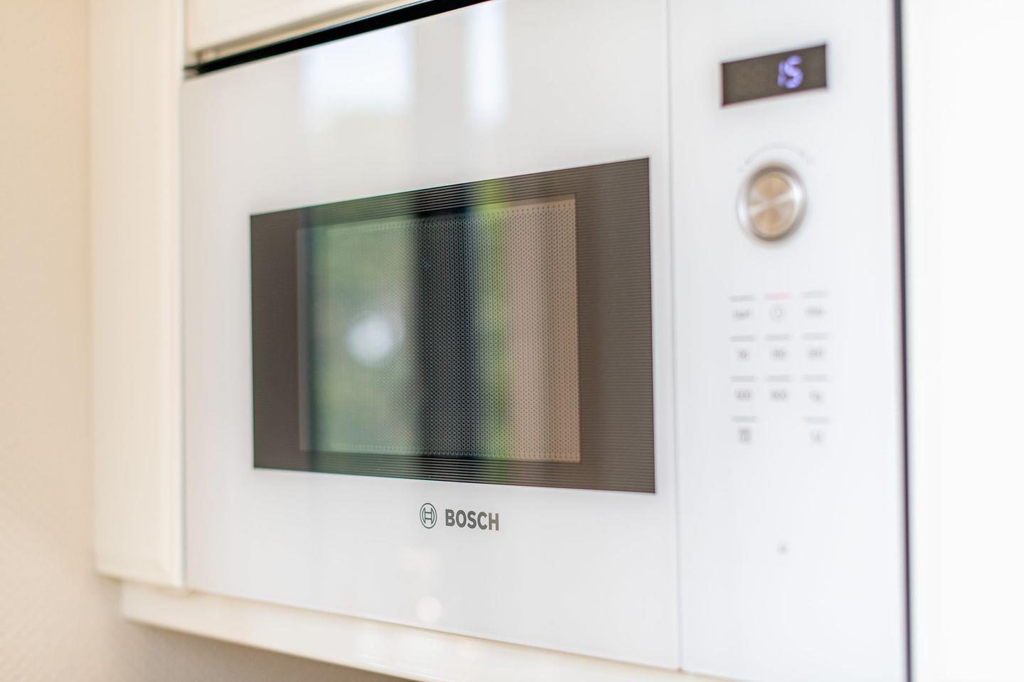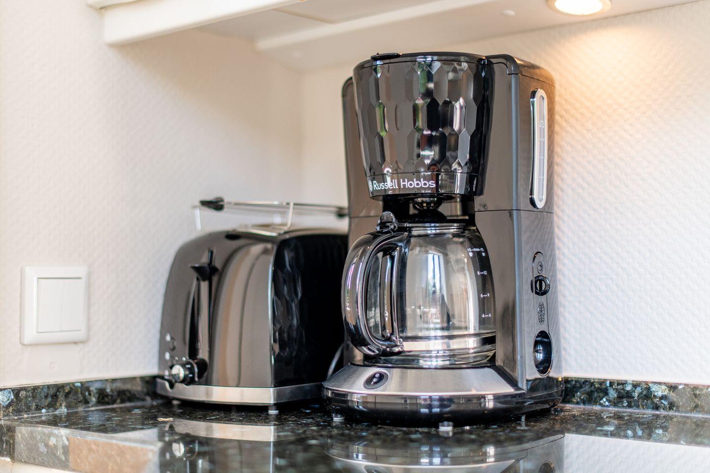 Die separate, moderne Hochglanzküche mit Granitarbeitsplatte ist bestens ausgestattet und bietet Ihnen ein Cerankochfeld, einen Geschirrspüler, eine Filterkaffeemaschine sowie alle notwendigen Utensilien, um Ihre Mahlzeiten bequem zuzubereiten.